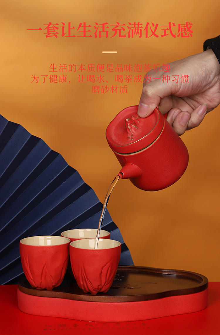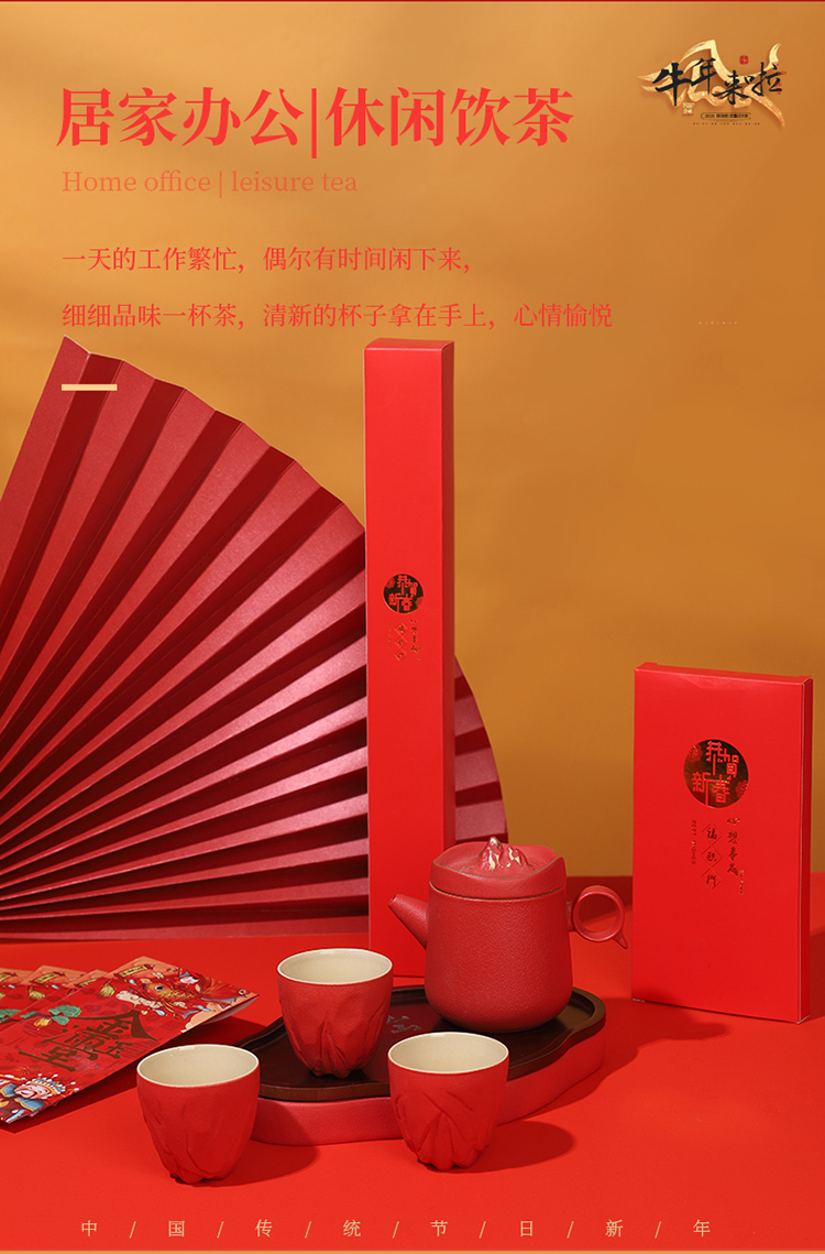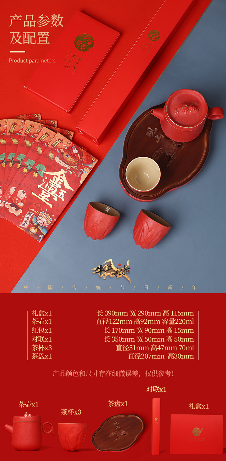配置:茶壶*1、茶杯*3、茶盘*1、红包*6、对联*1,福字*1