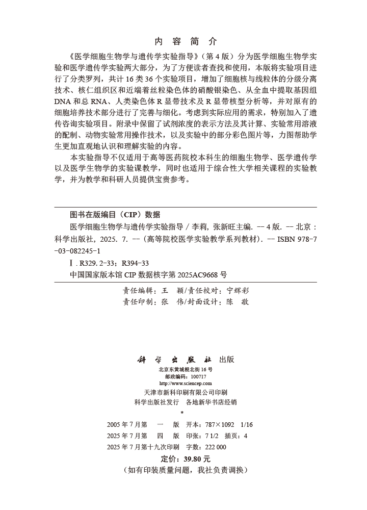 医学细胞生物学与遗传学实验指导 第4四版 高等院校医学实验教学系列教材 李莉 张新旺 适用于高等医学院校基础等专业 科学出版社