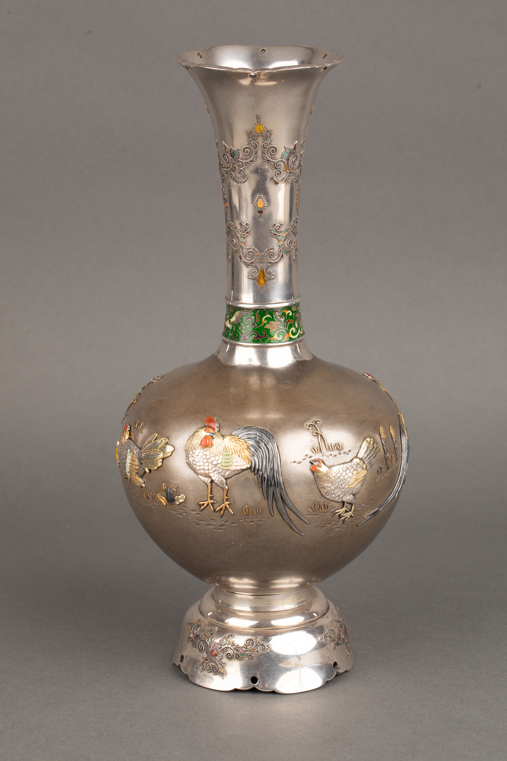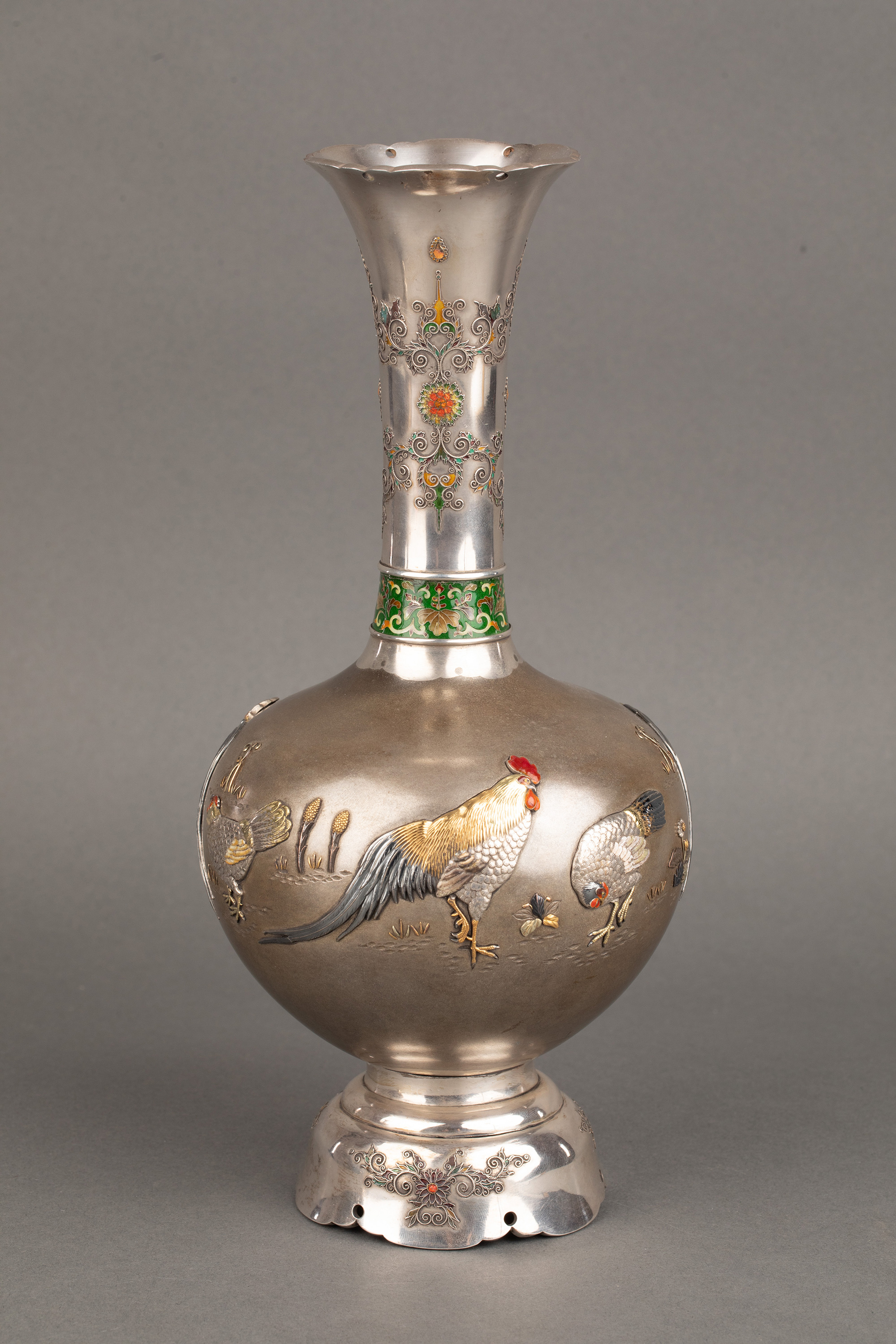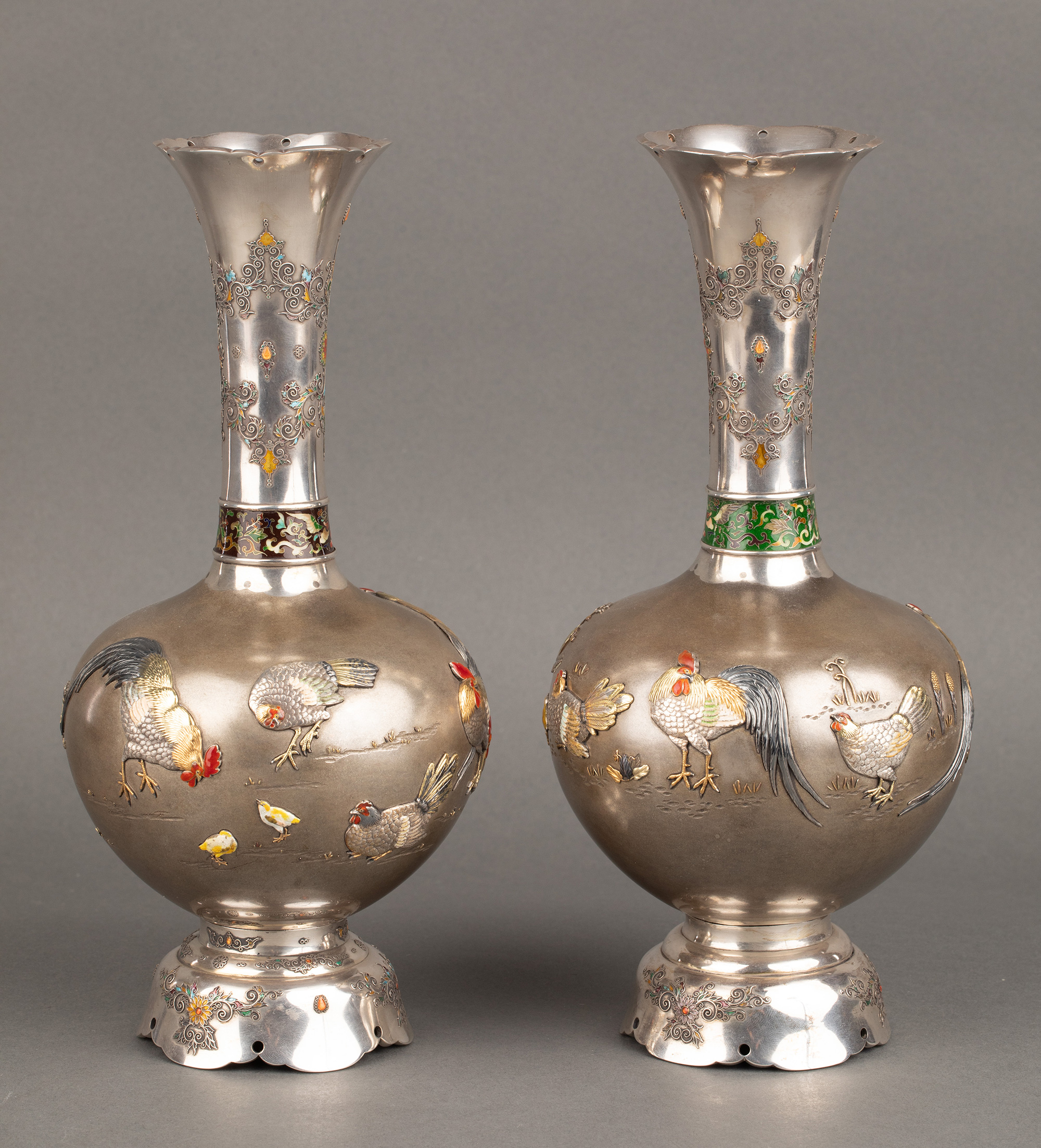 1880年代日本明治时期出品卷叶纹及东方雄鸡主题珐琅彩绘装饰传统色金银雕花瓶一对