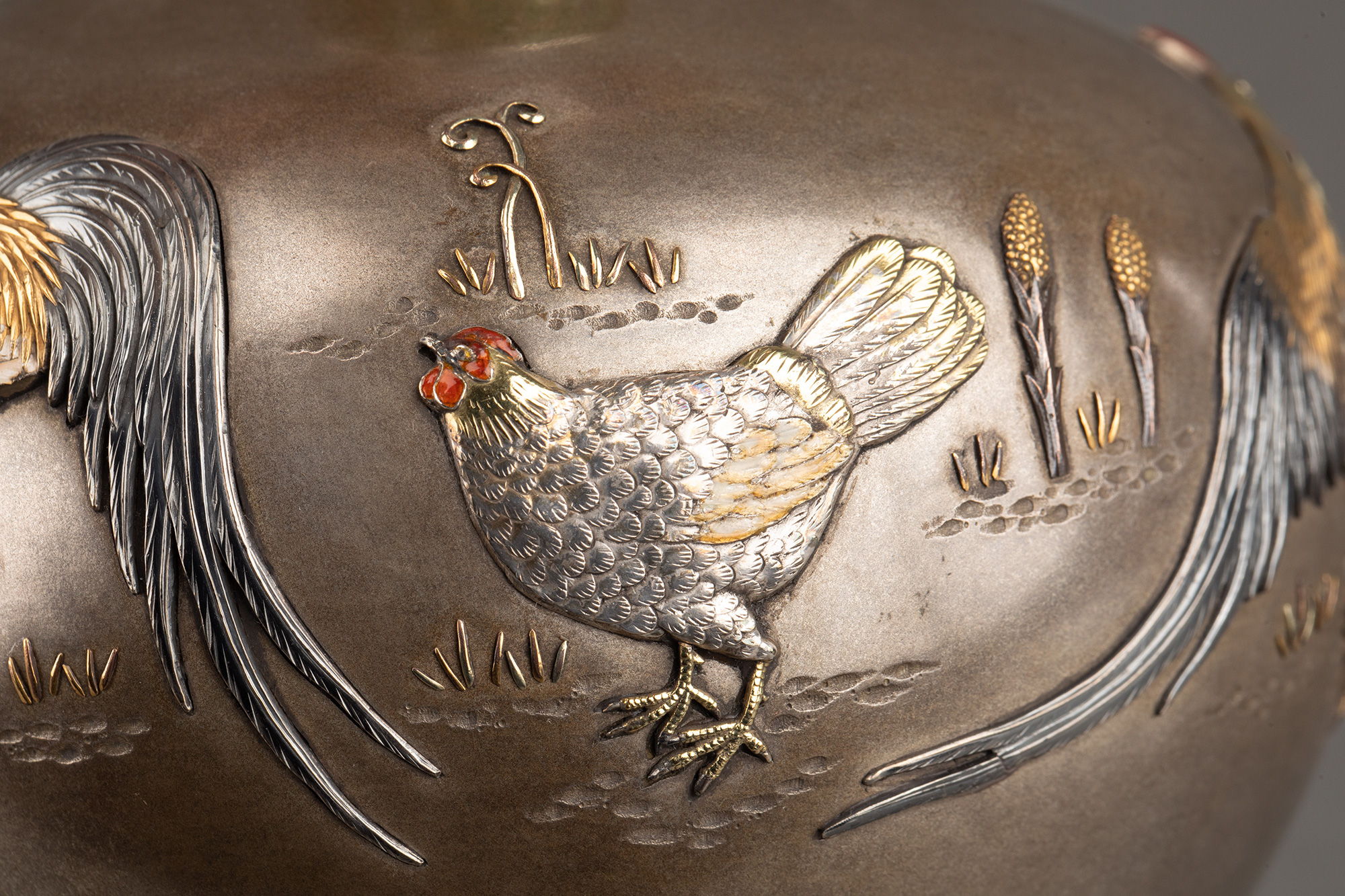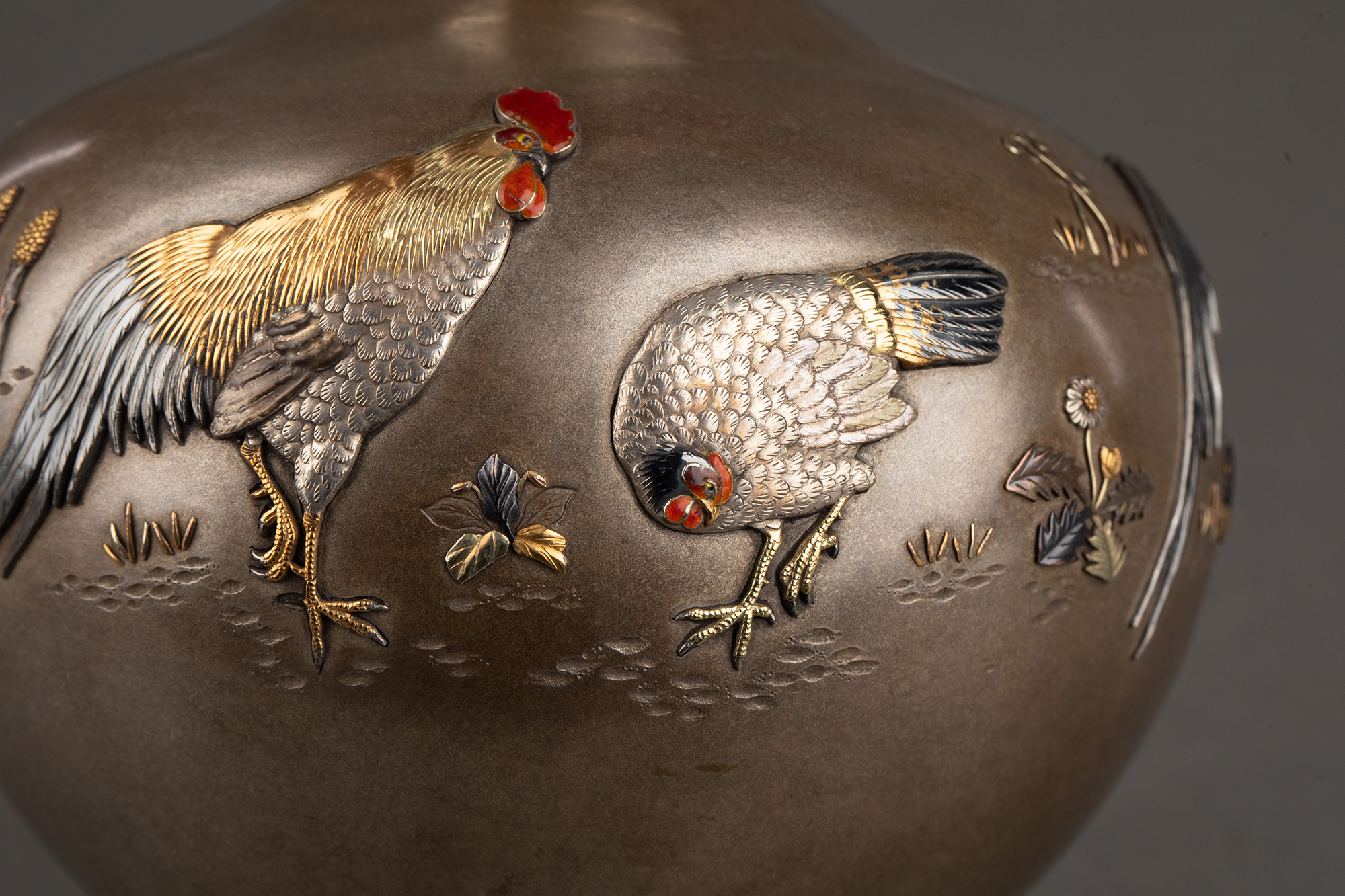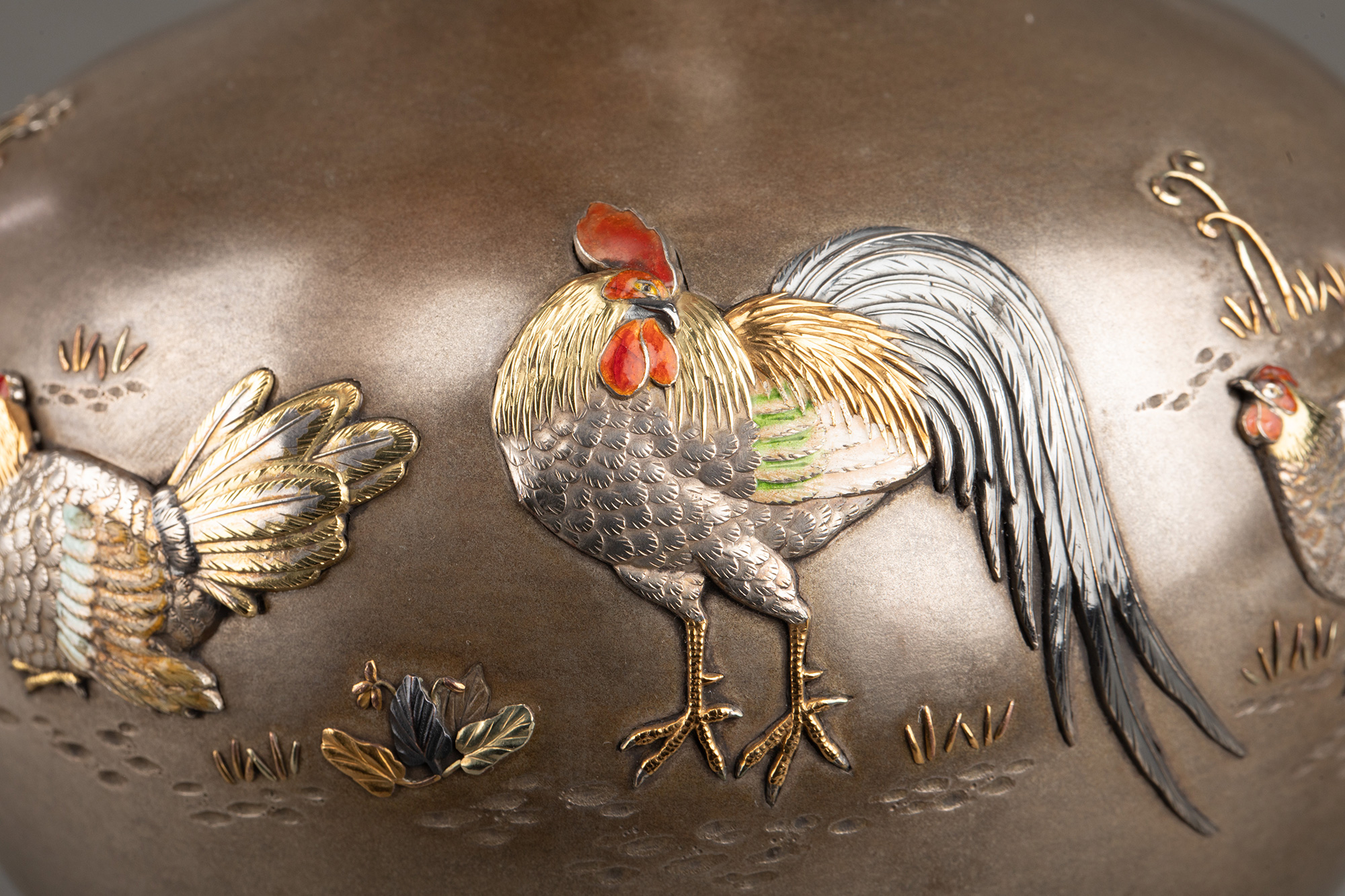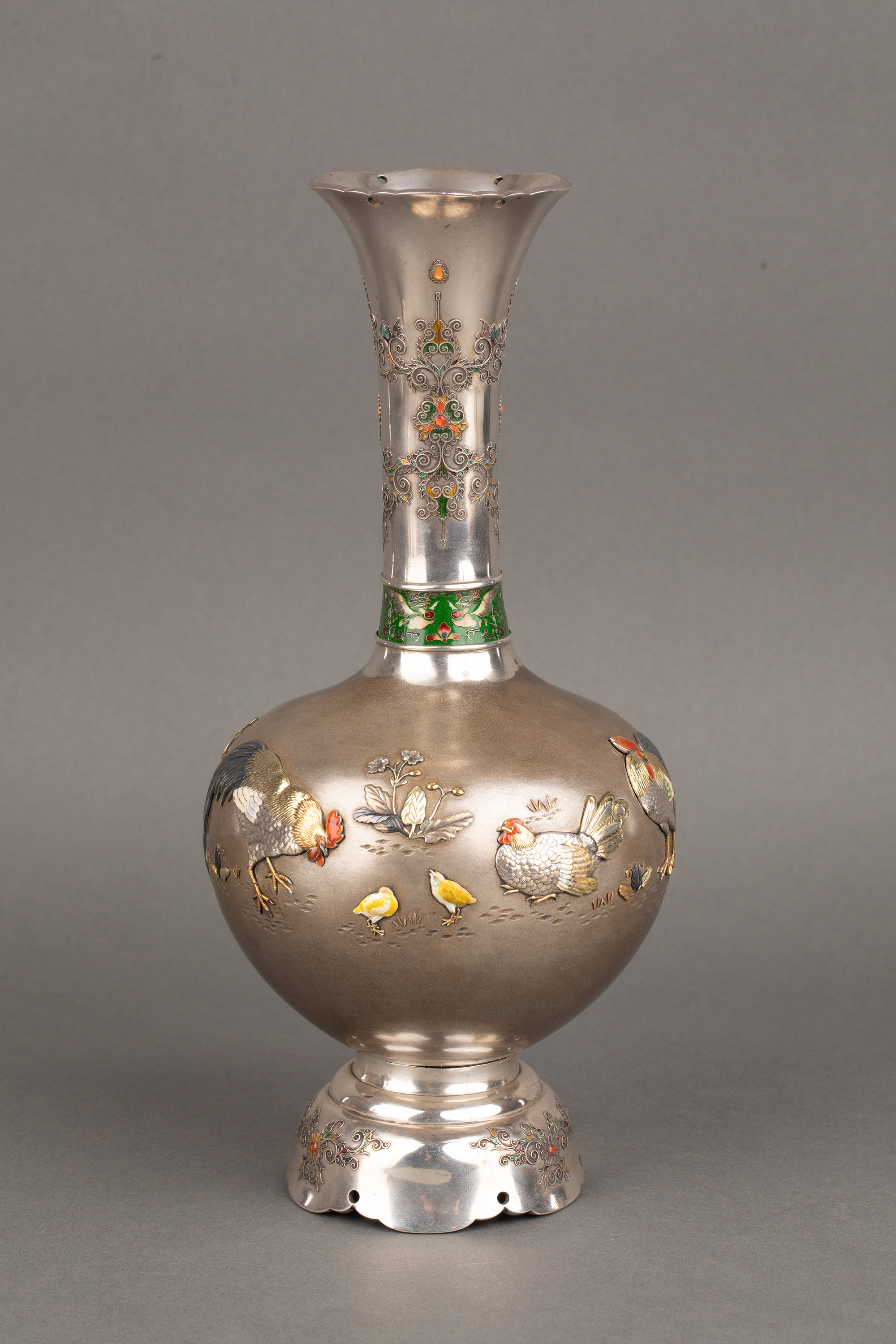1880年代日本明治时期出品卷叶纹及东方雄鸡主题珐琅彩绘装饰传统色金银雕花瓶一对