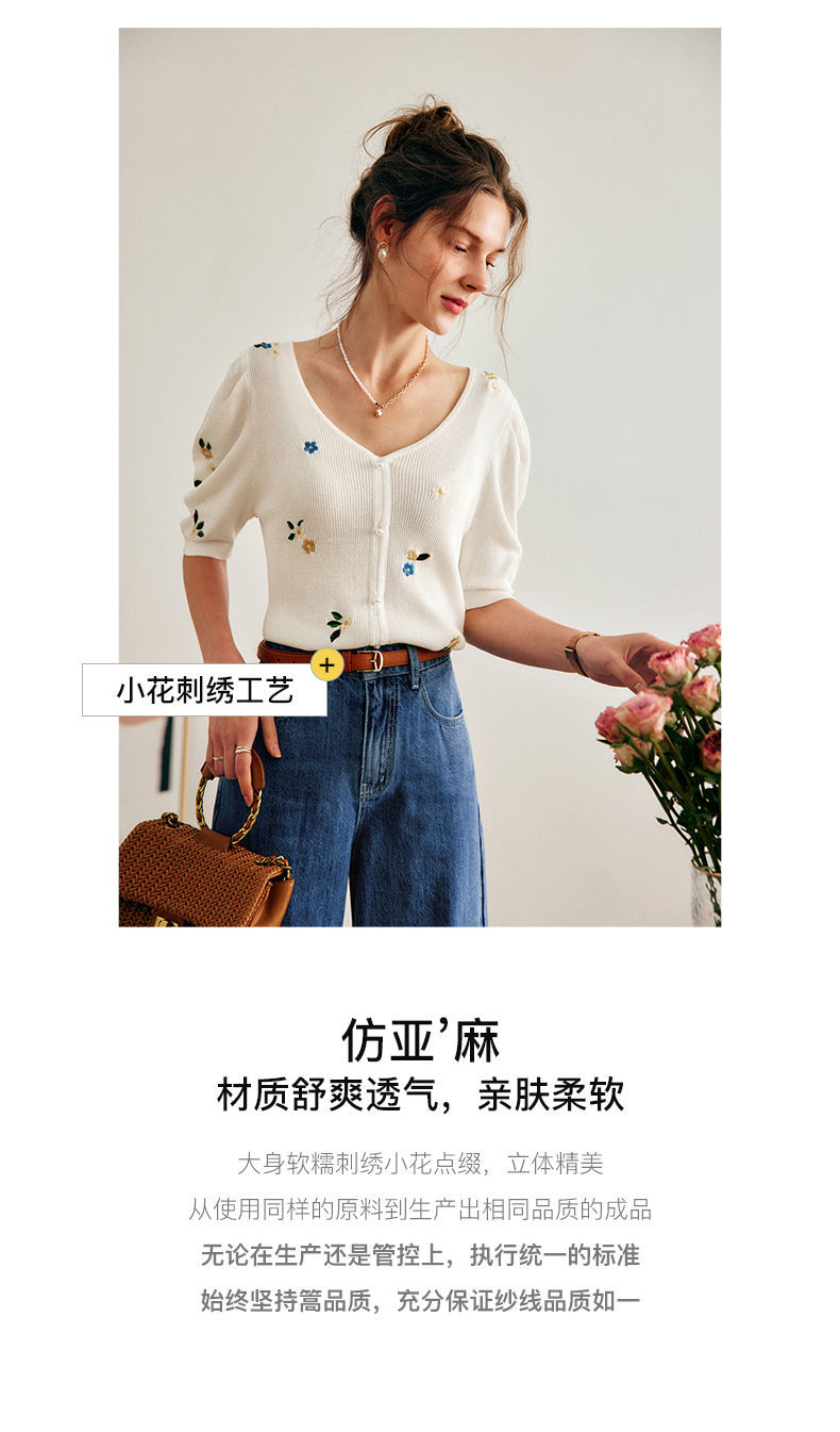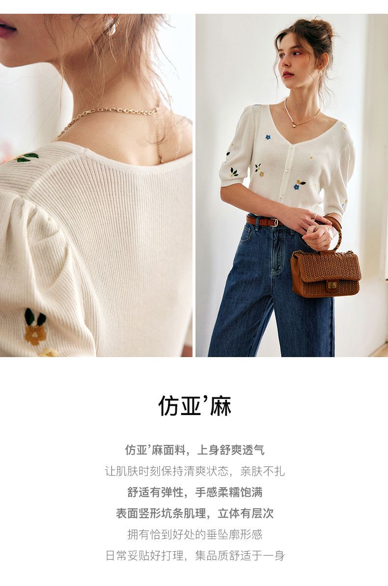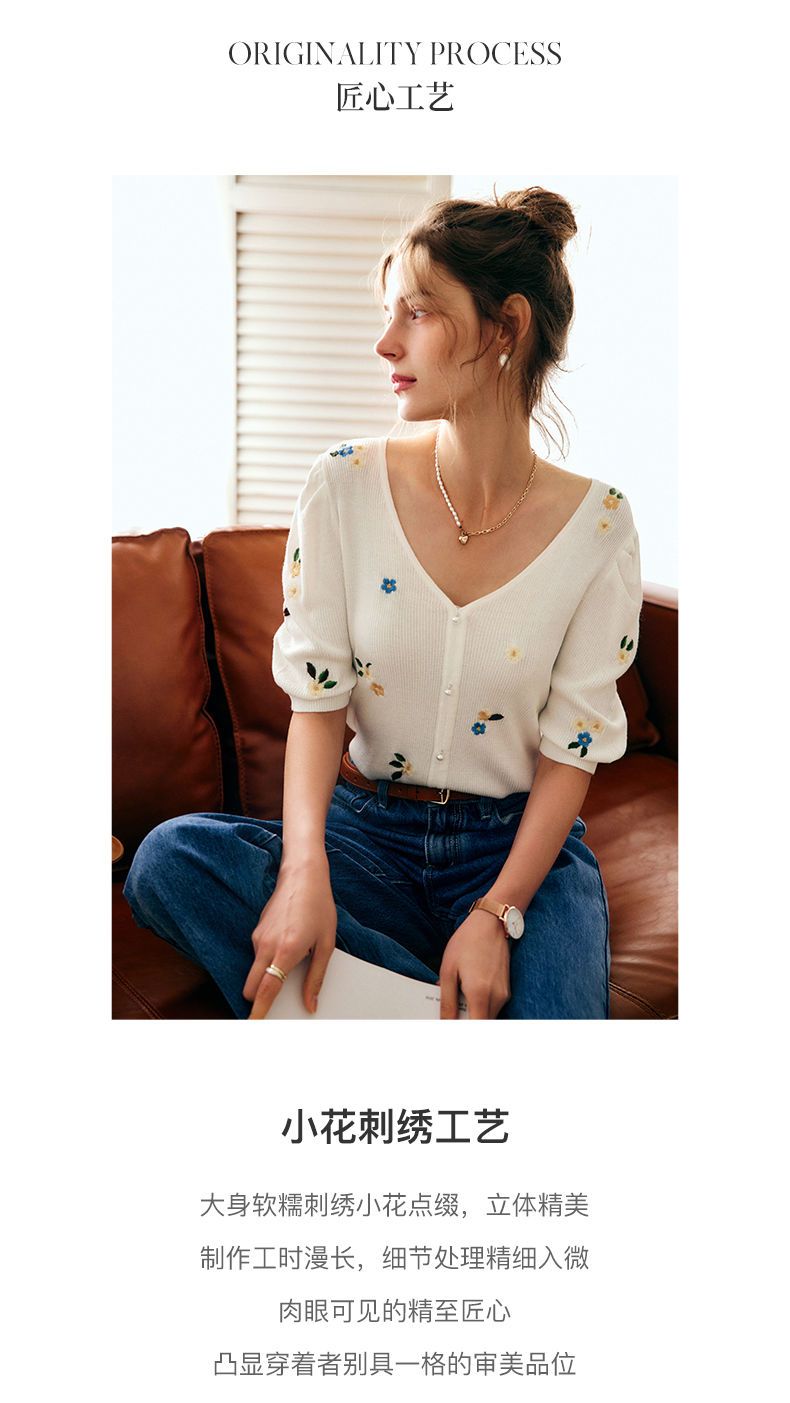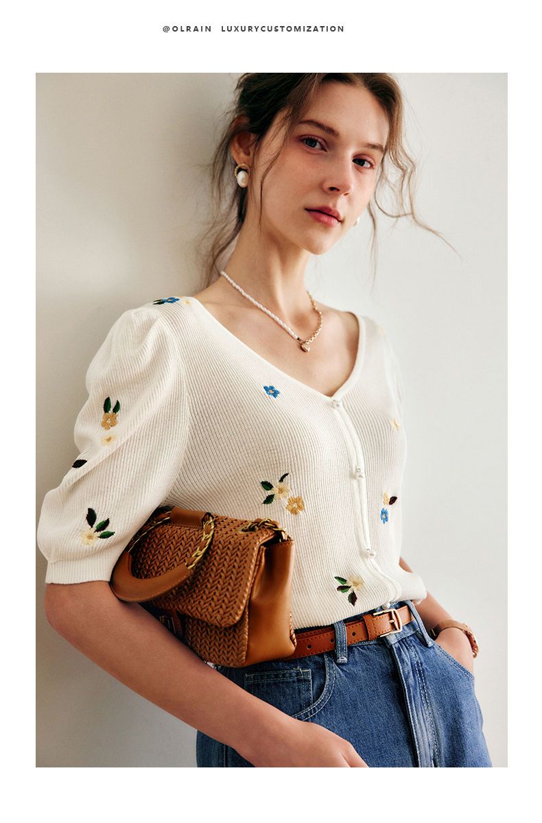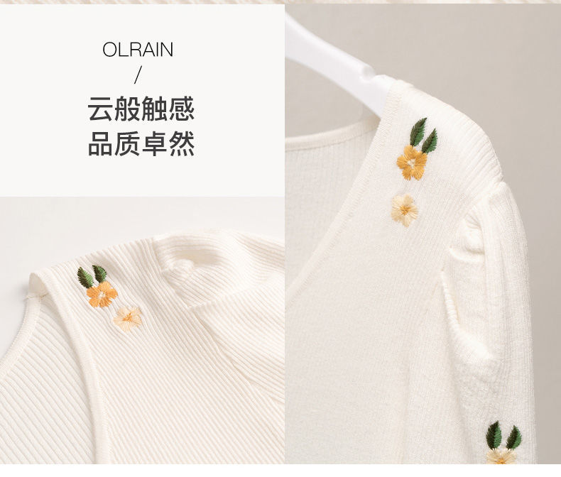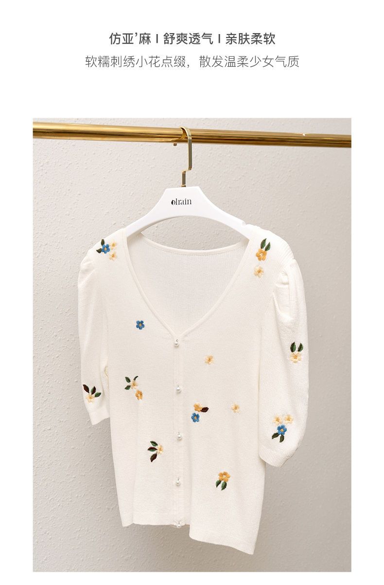 欧芮儿V领刺绣针织衫女夏季2022新款气质泡泡袖冰爽薄款白色上衣