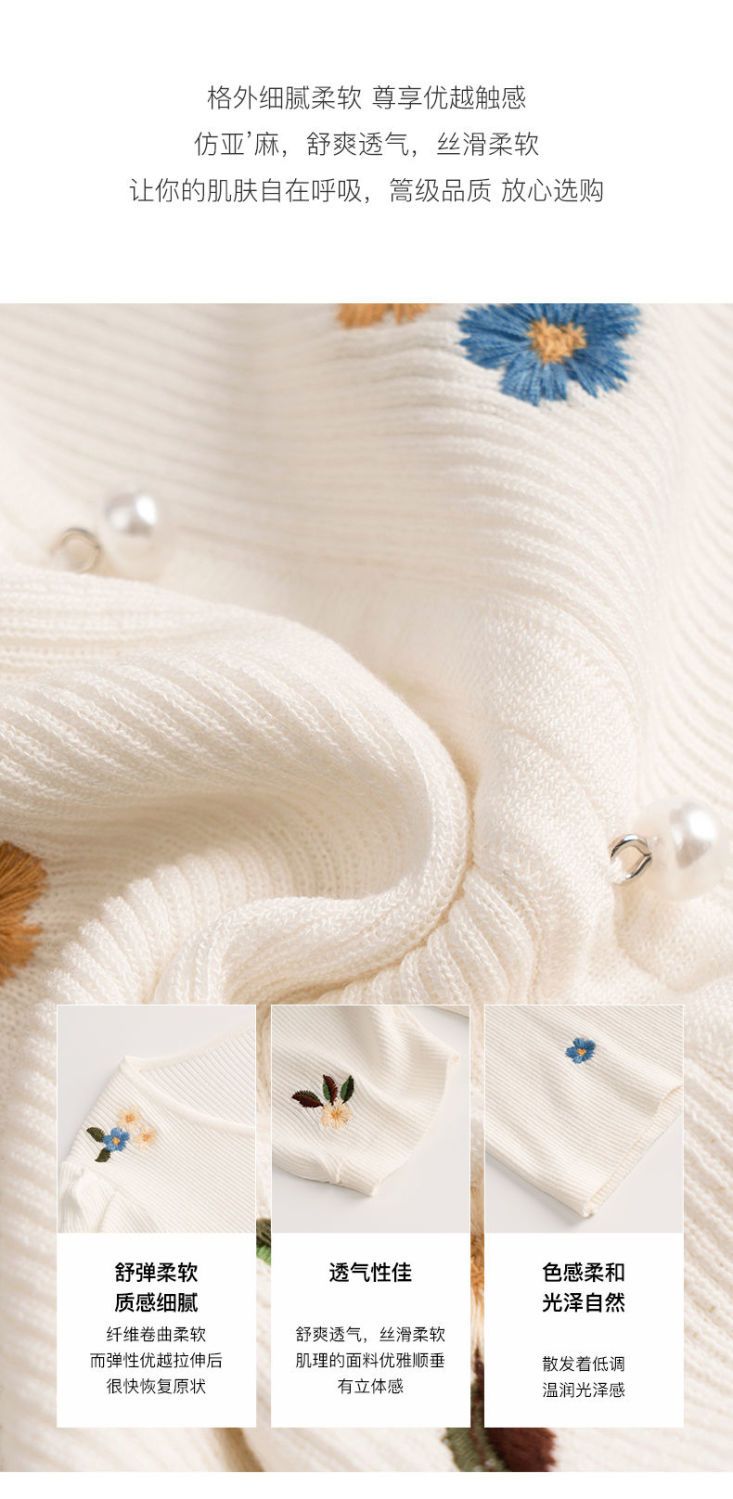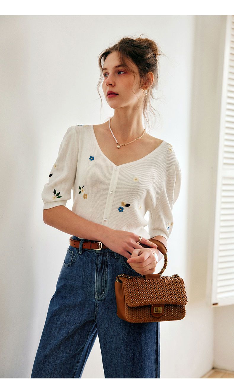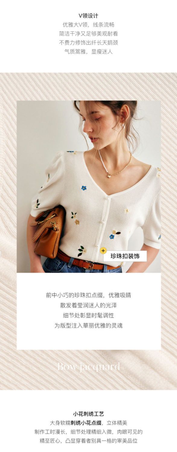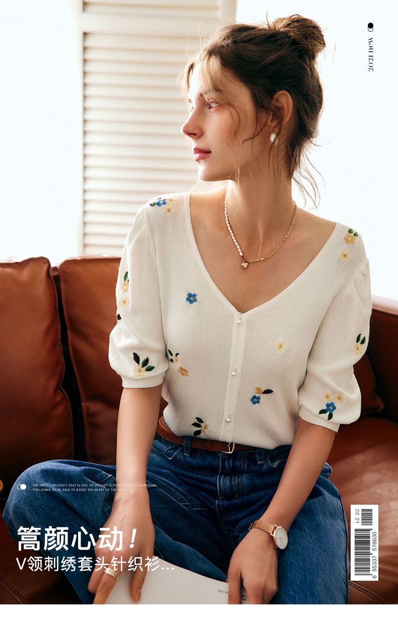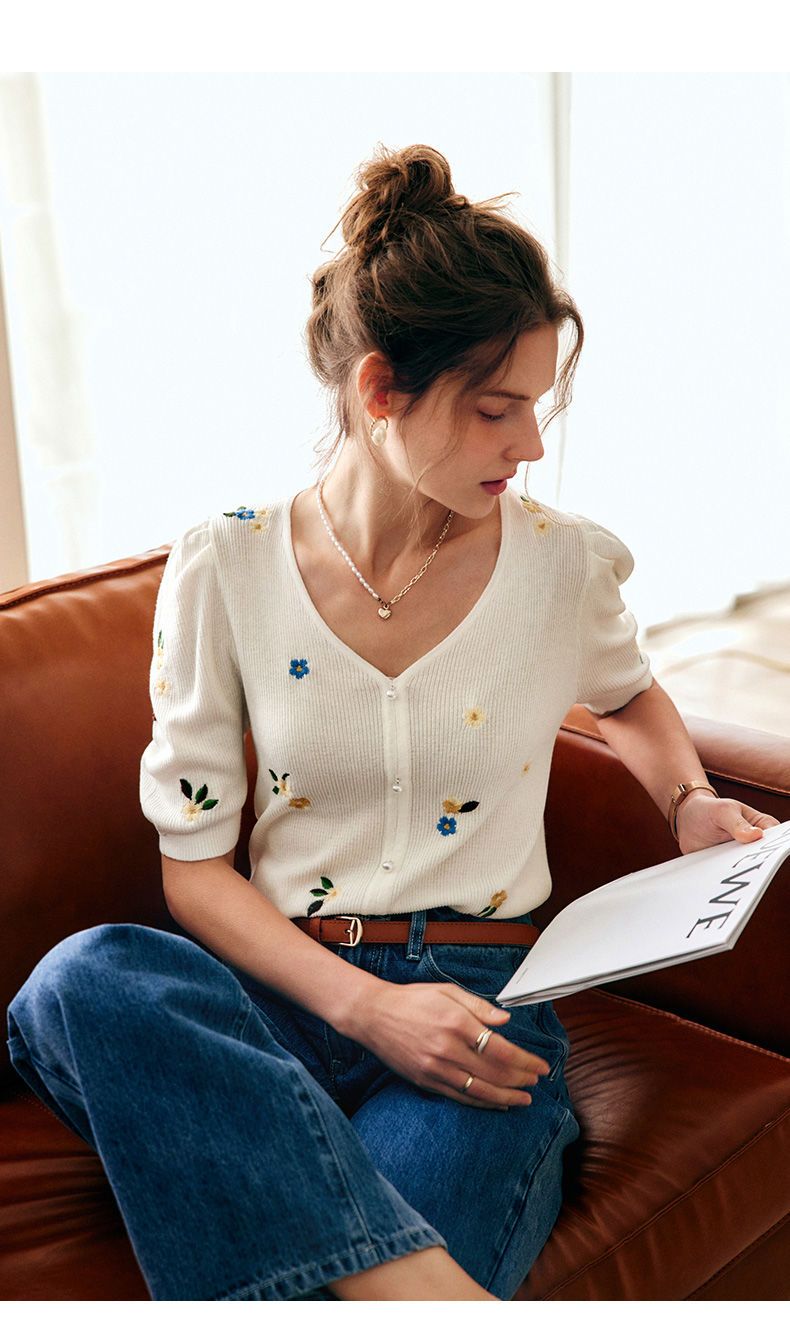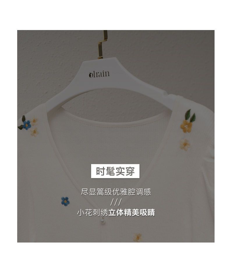 欧芮儿V领刺绣针织衫女夏季2022新款气质泡泡袖冰爽薄款白色上衣