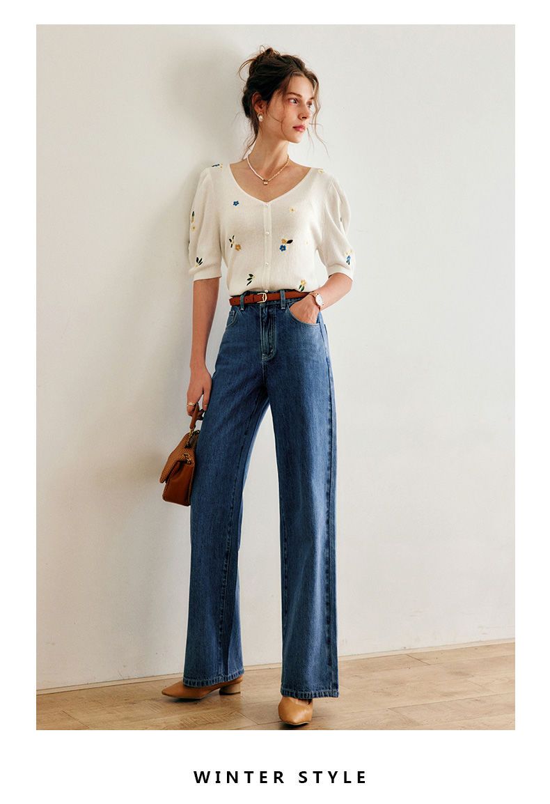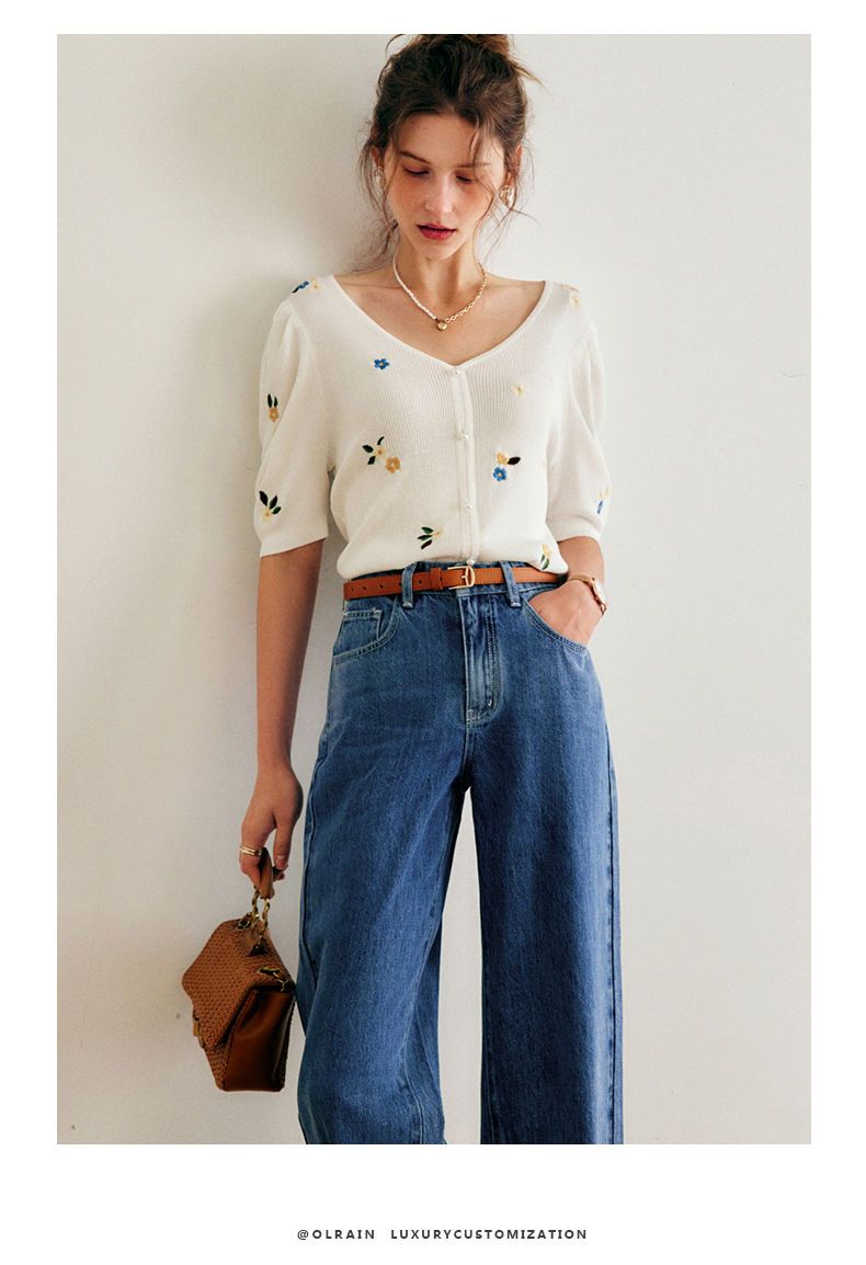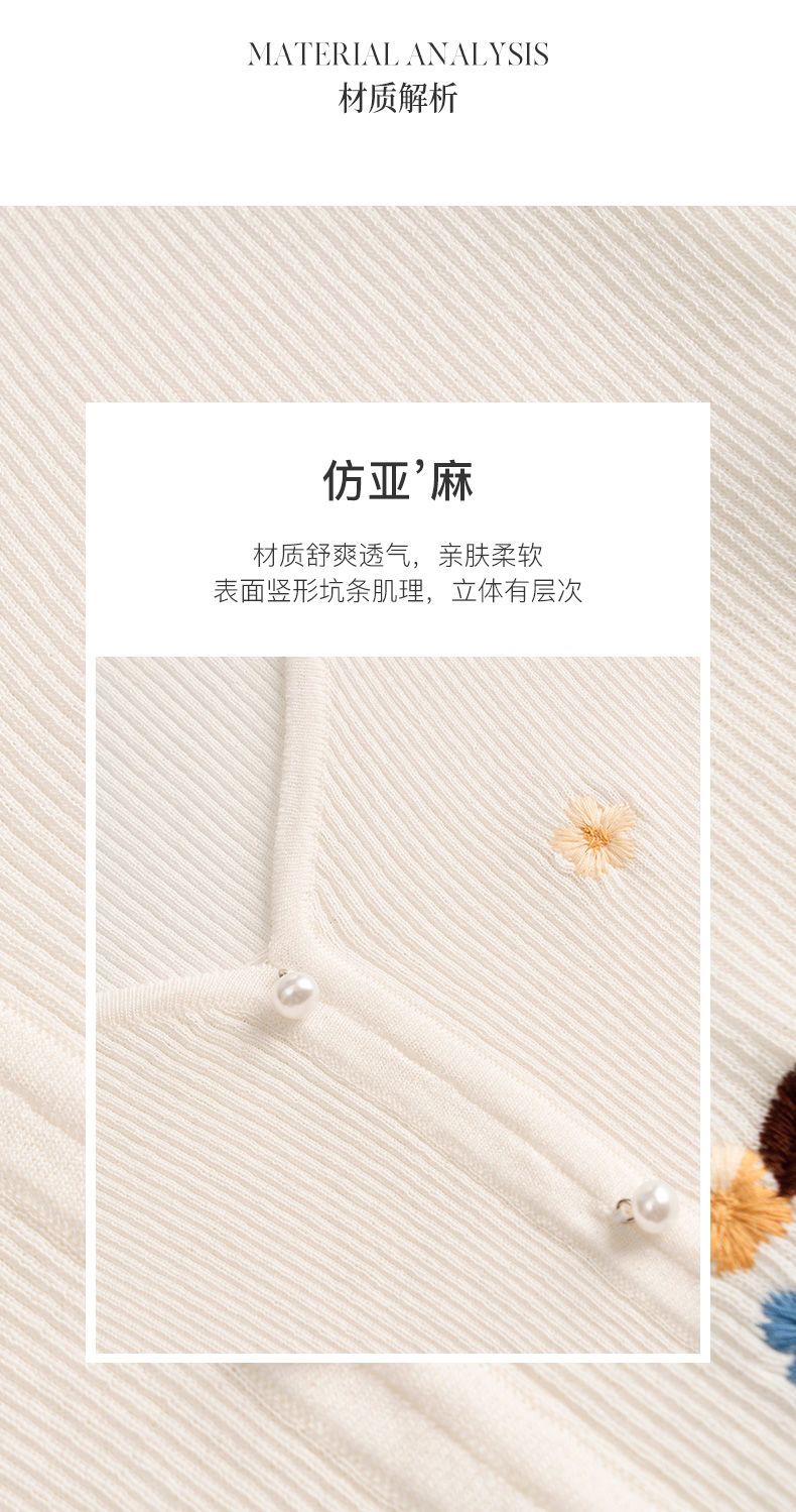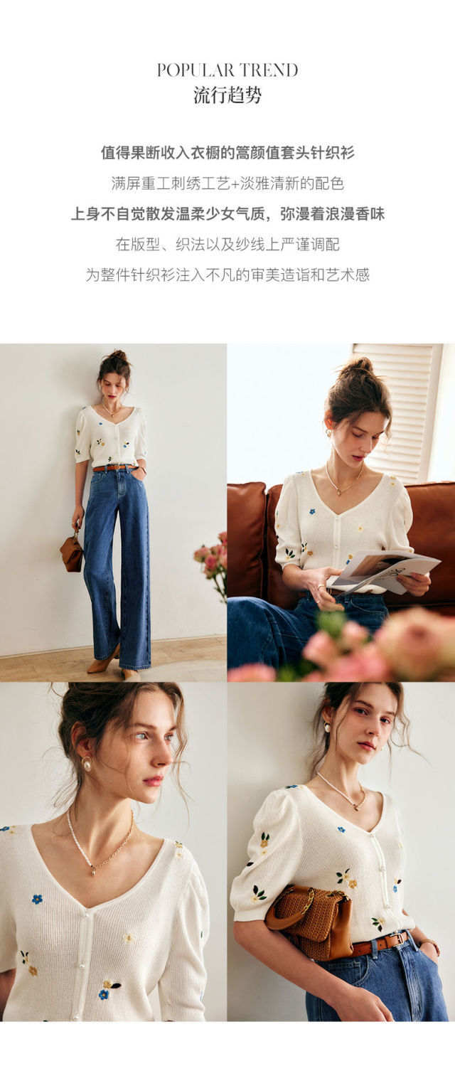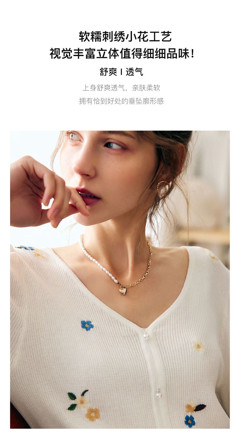 欧芮儿V领刺绣针织衫女夏季2022新款气质泡泡袖冰爽薄款白色上衣