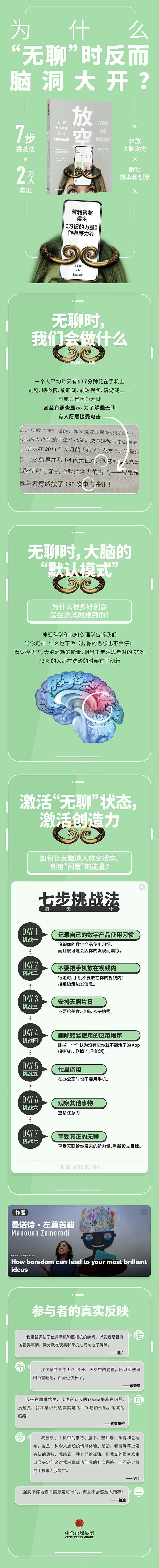《快公司》杂志“2018年创意人士”曼若诗发起,2万人实证的“什么都不做”项目,结合神经科学和认知心理学,独*7步挑战法,释放大脑动力,摆脱网络不掉线、信息迅速回复、长时间工作的“忙碌却低效”状态,解锁你的生产力和创造力。