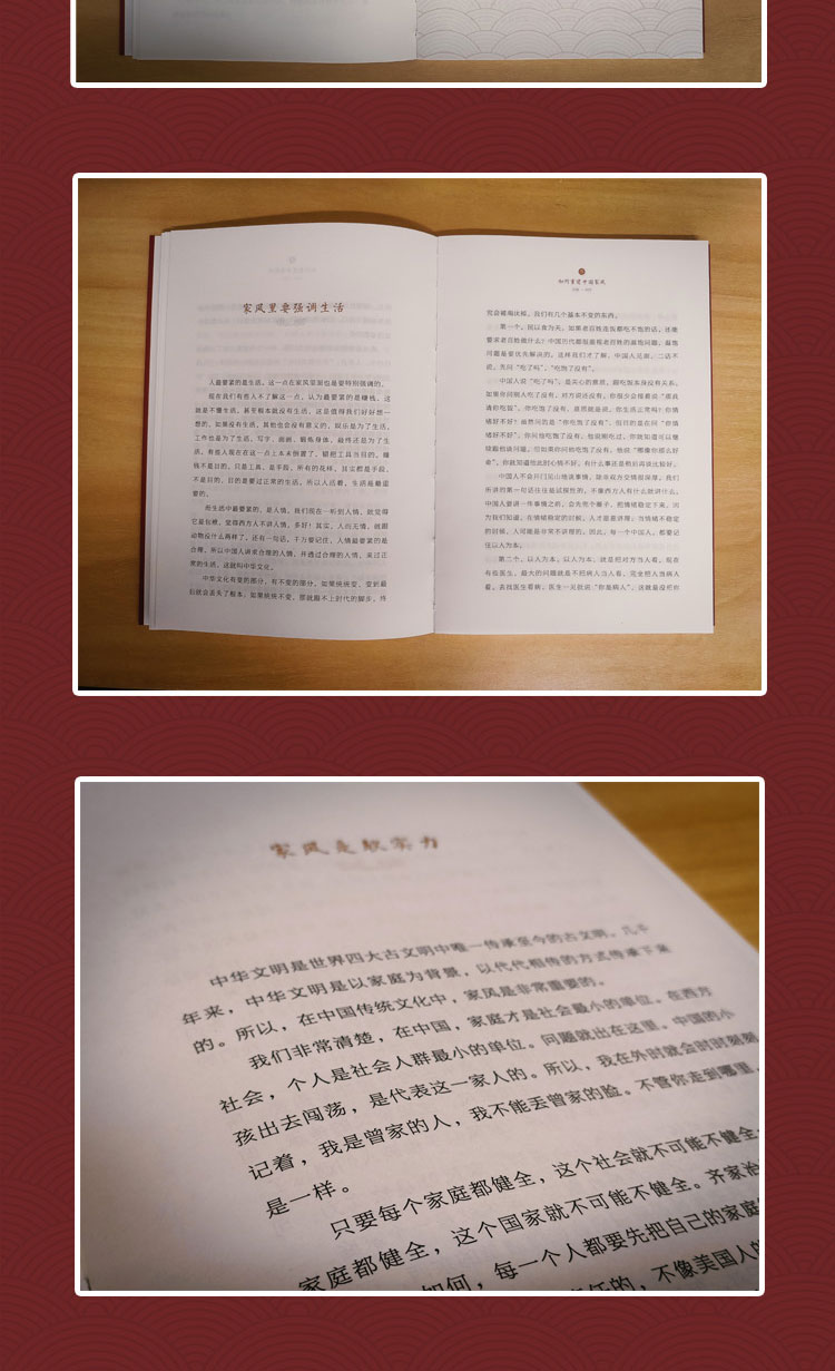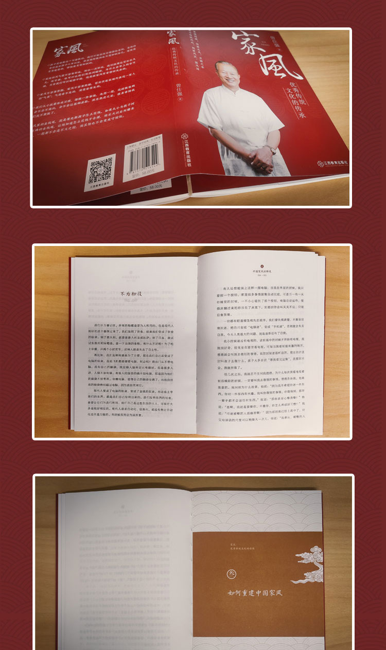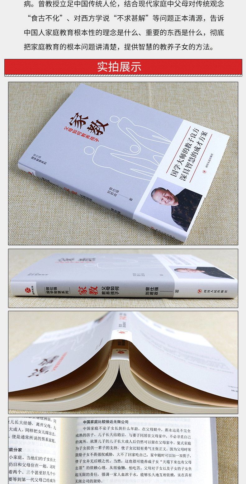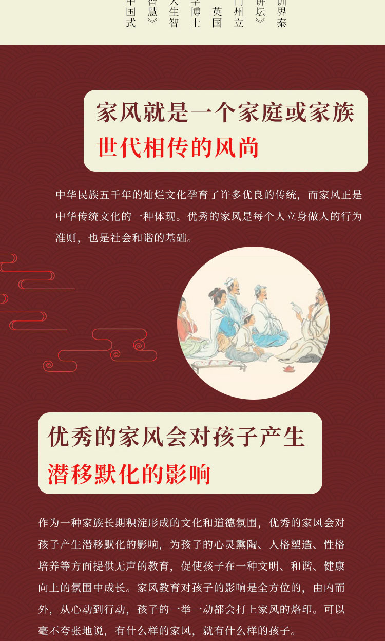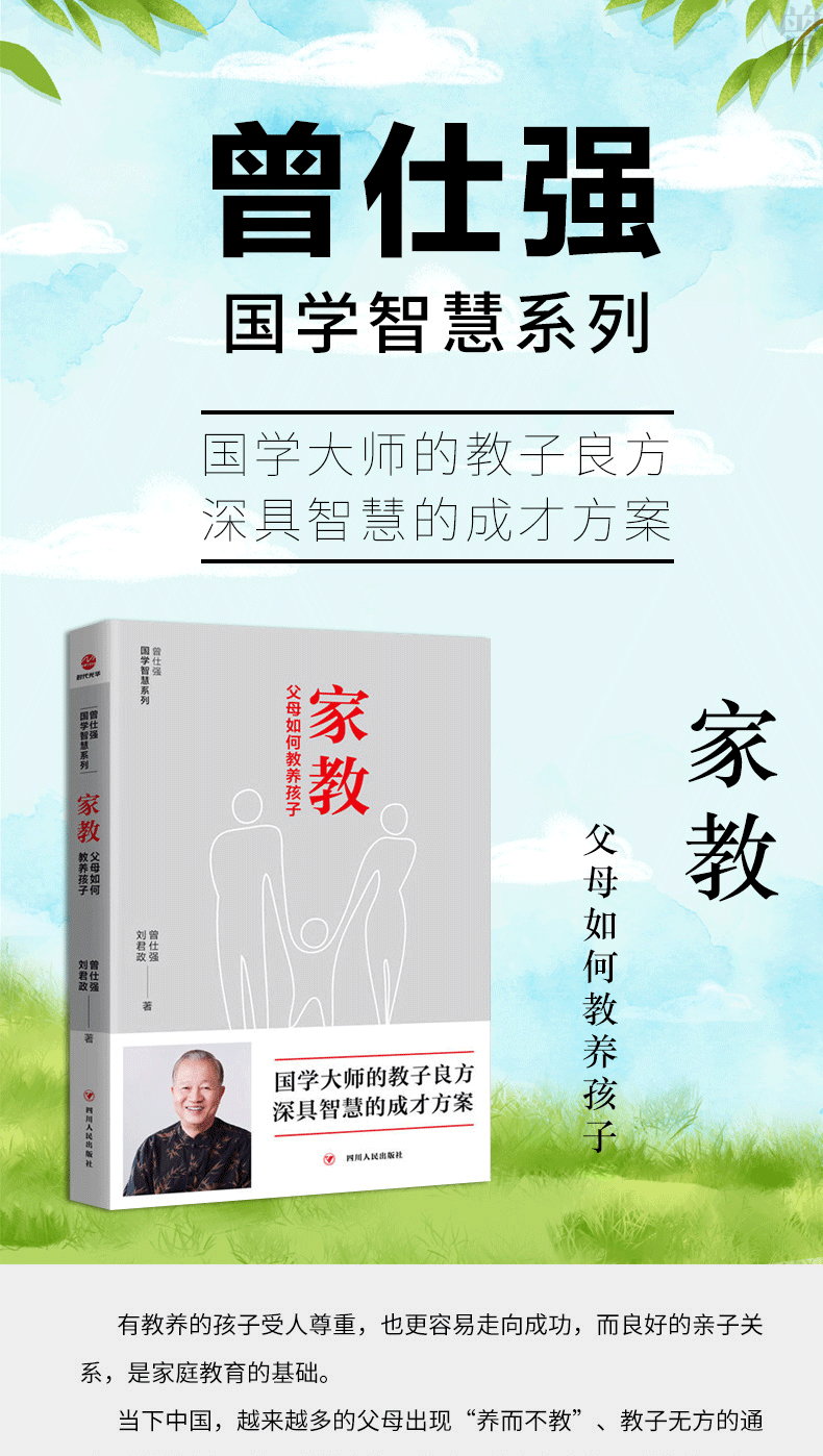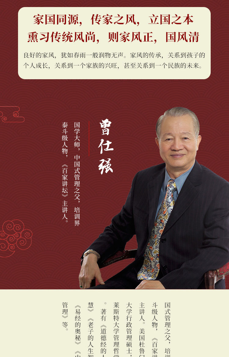 是基本、靠谱的家庭教育。重视小家建设,宣扬良好家风,引领孩子成长,是每对父母都应放在首位的课题。家庭的风气很不容易形成,所以一旦形成。曾仕强教授学贯中西,对中国传统文化有着深入而准确的理解。本书中,曾教授依托很好的中华传统文化,将家庭教育中的诸如孝道、婚恋、金钱、祖先,甚至生死等问题从多角度进行了深入浅出的阐释,说理通透,直达人心。曾教授认为,家庭是社会的细胞,若每个人都能维护好、传承好自己的家风,则世界无为而治,人间万象泰和。无论时代发生多大变化,无论生活格局发生多大变化,我们都要注重家庭、注重家教、注重家风,让被忽视,甚至被遗忘的传统家风重新复兴,让每个孩子的童年都充满中国味道。