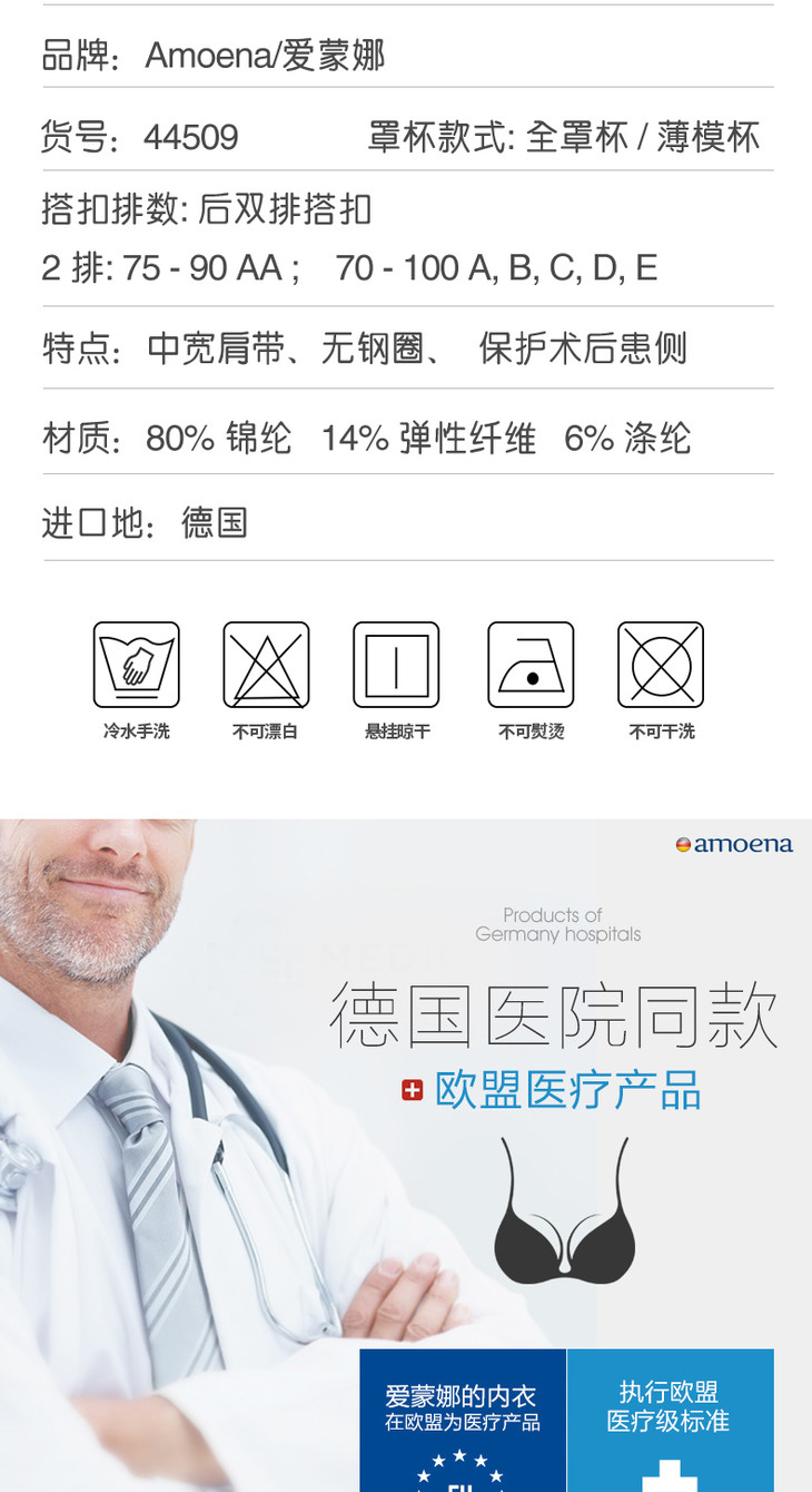【优惠详情咨询客服】爱蒙娜德国进口 乳腺癌术后无钢圈文胸44509