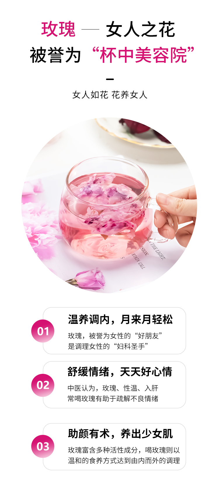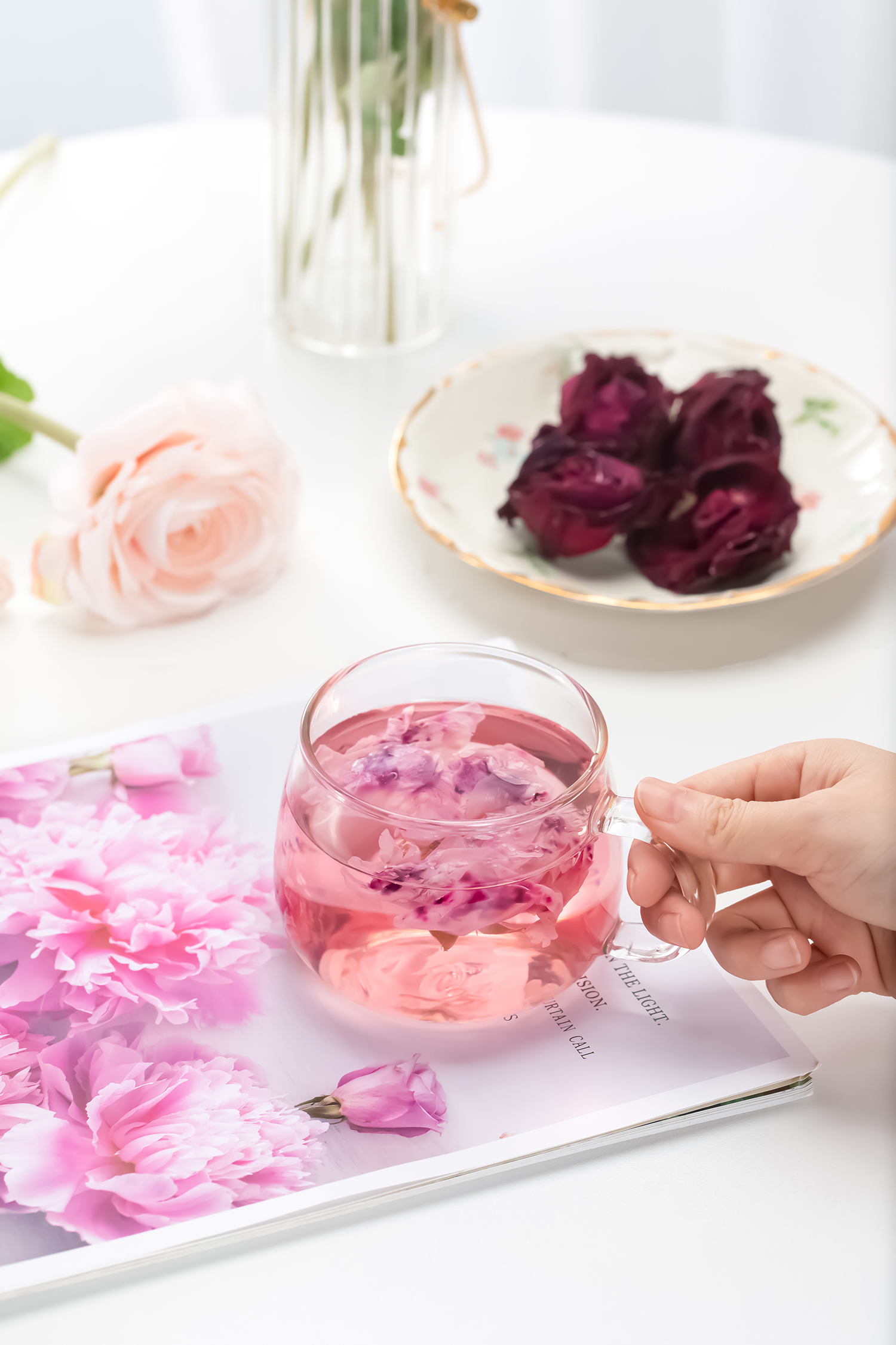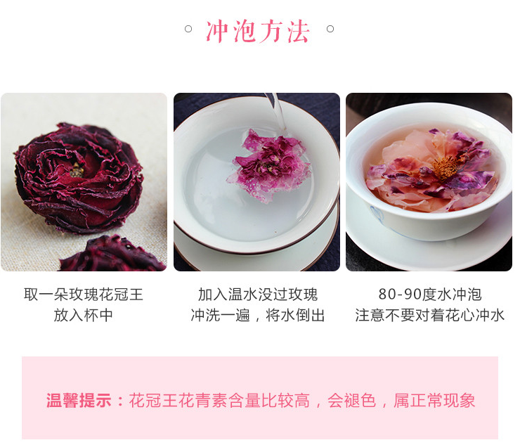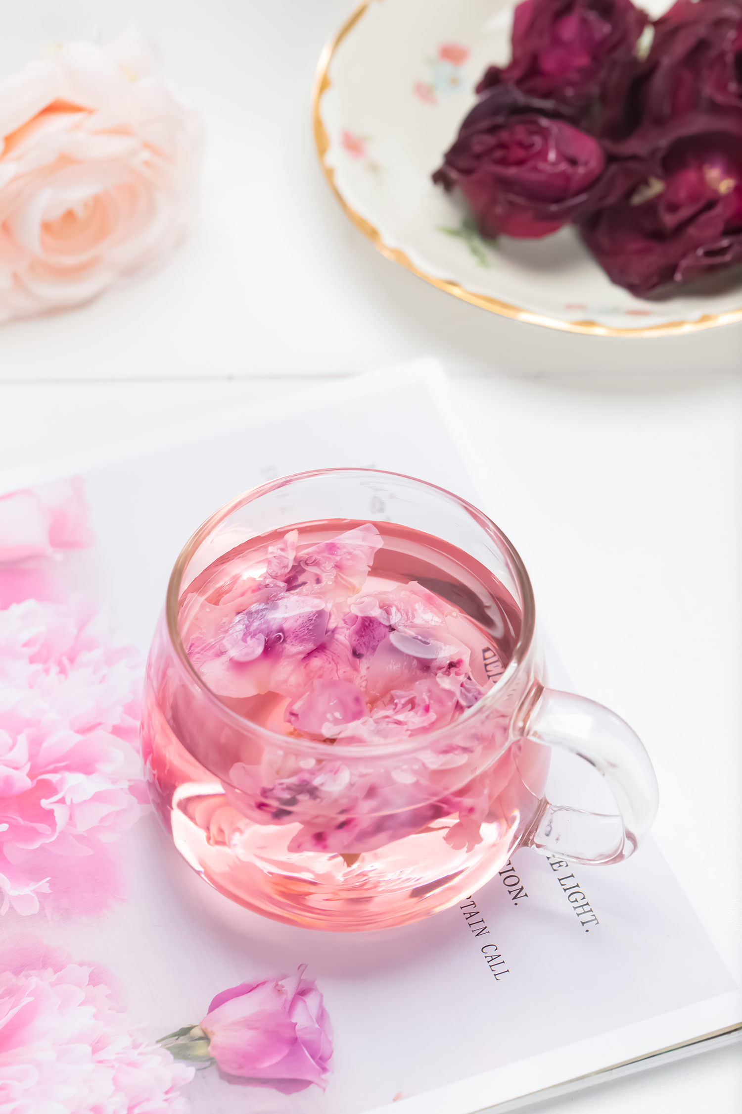 3、建议温水冲泡,开水会破坏玫瑰花的花青素。