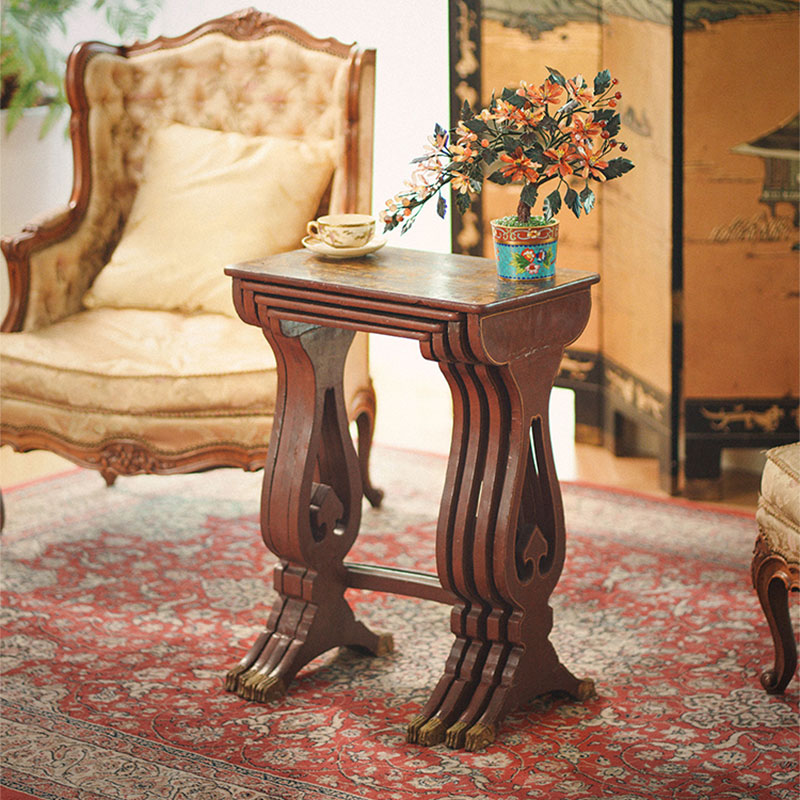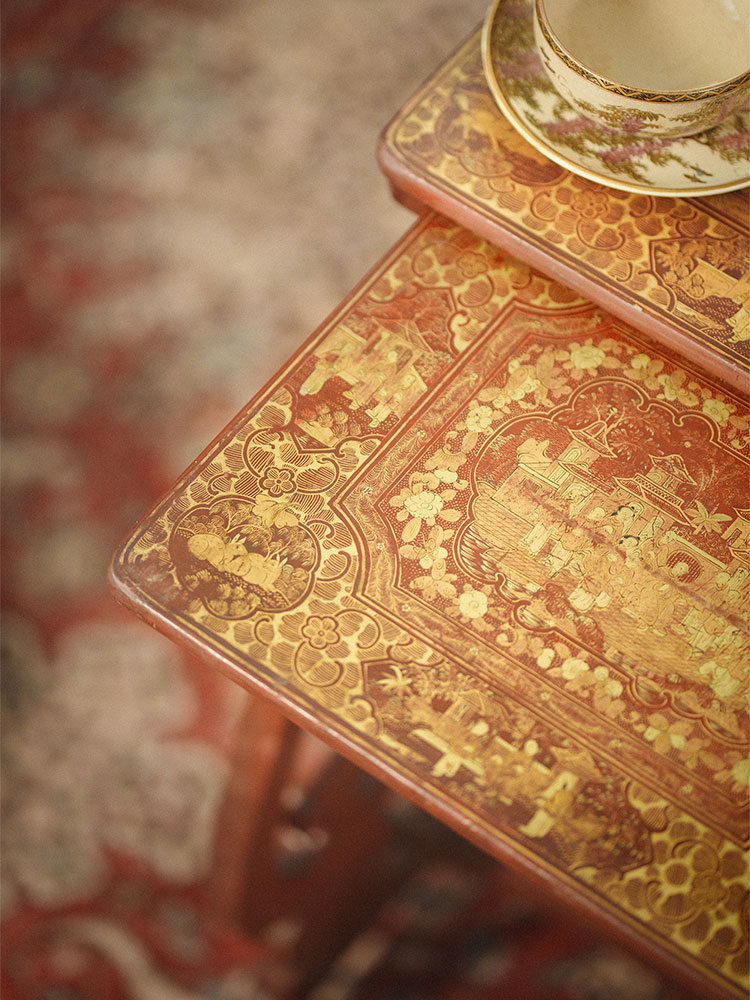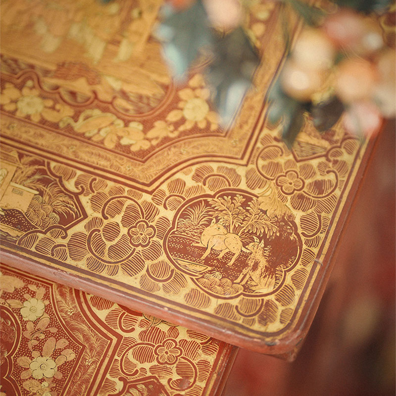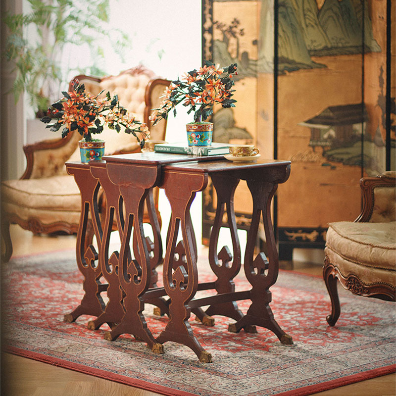 1880年代法国出品木上红漆桌面描金绘画装饰可叠放收纳小桌一套