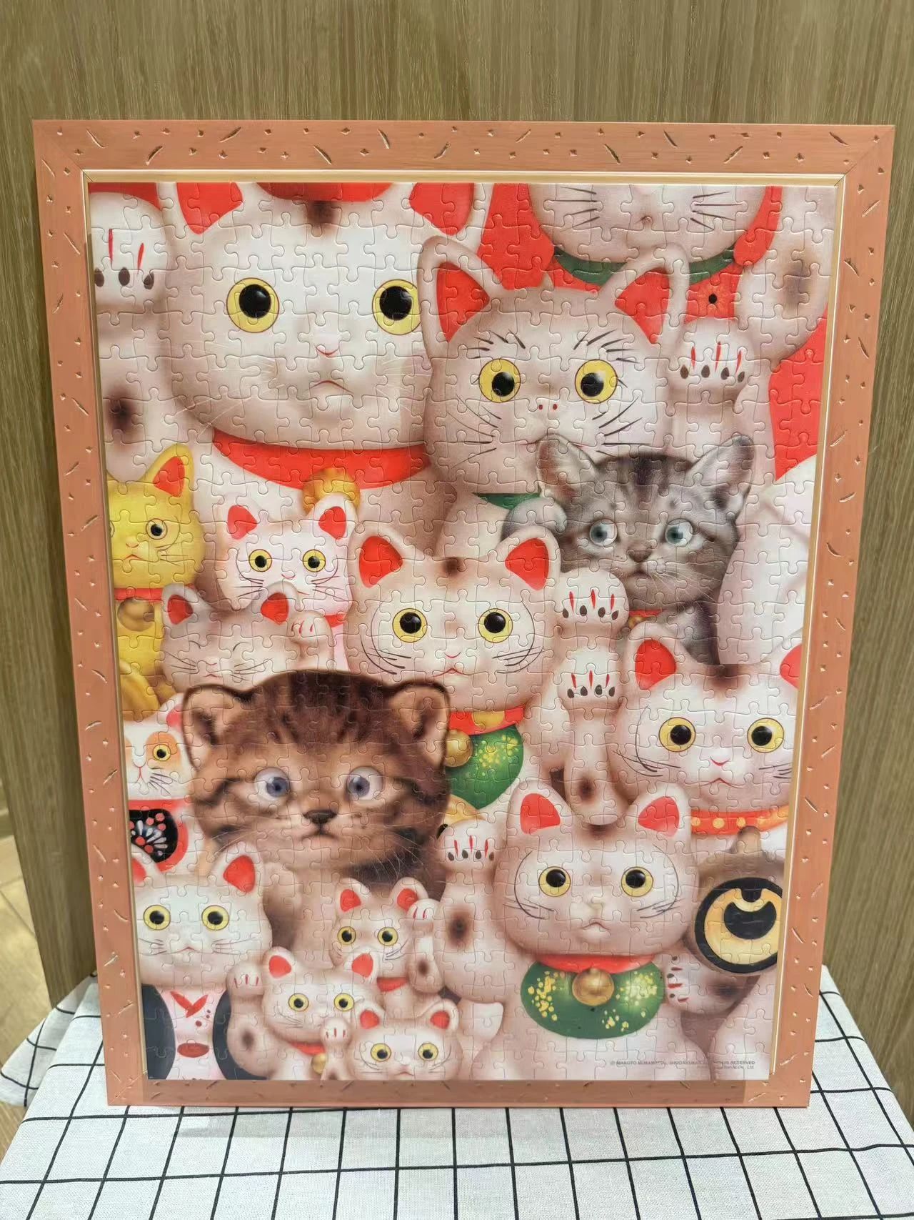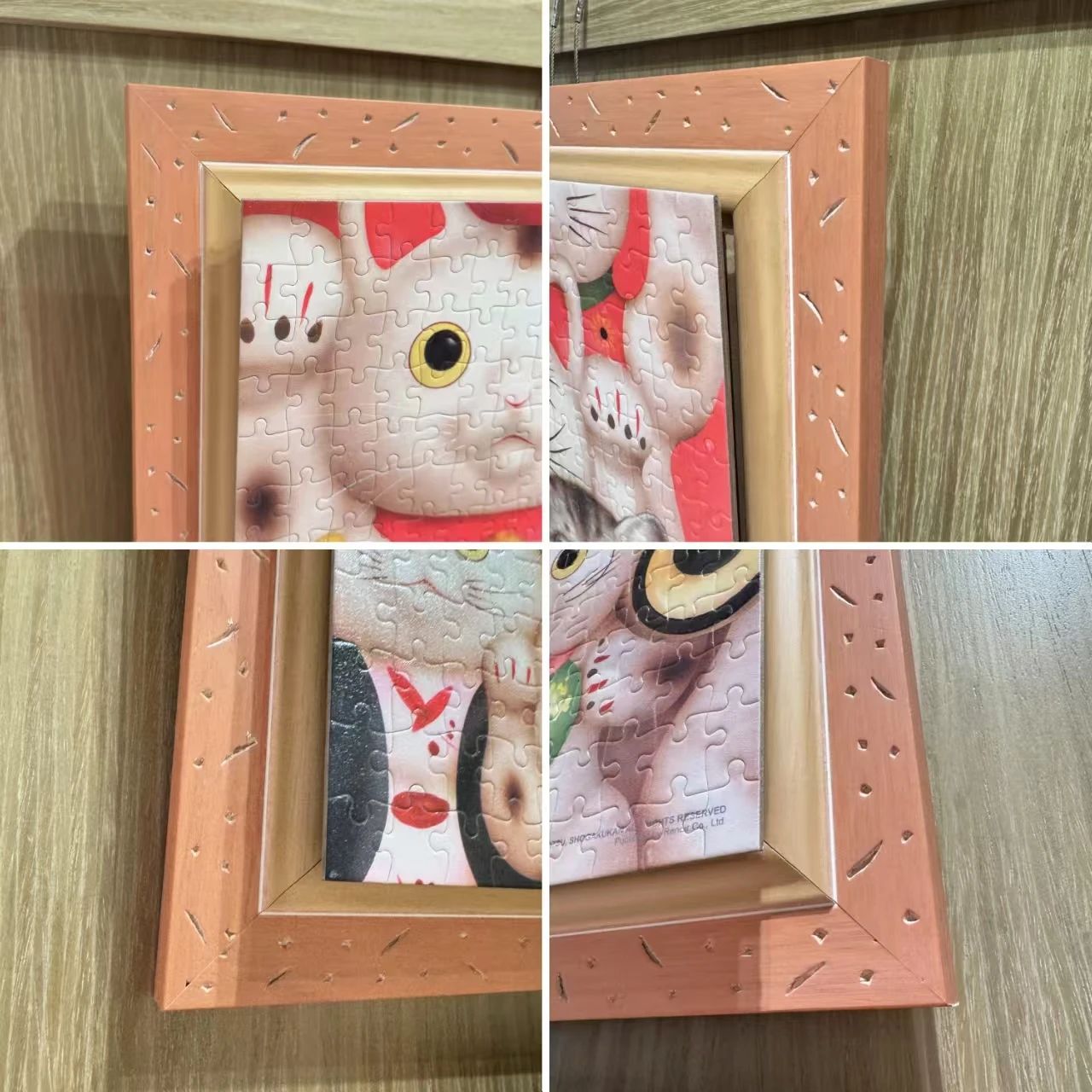 裱法解析:表面压膜+卡纸+框,拼图和框之间有卡纸相连,拼图呈凸起状