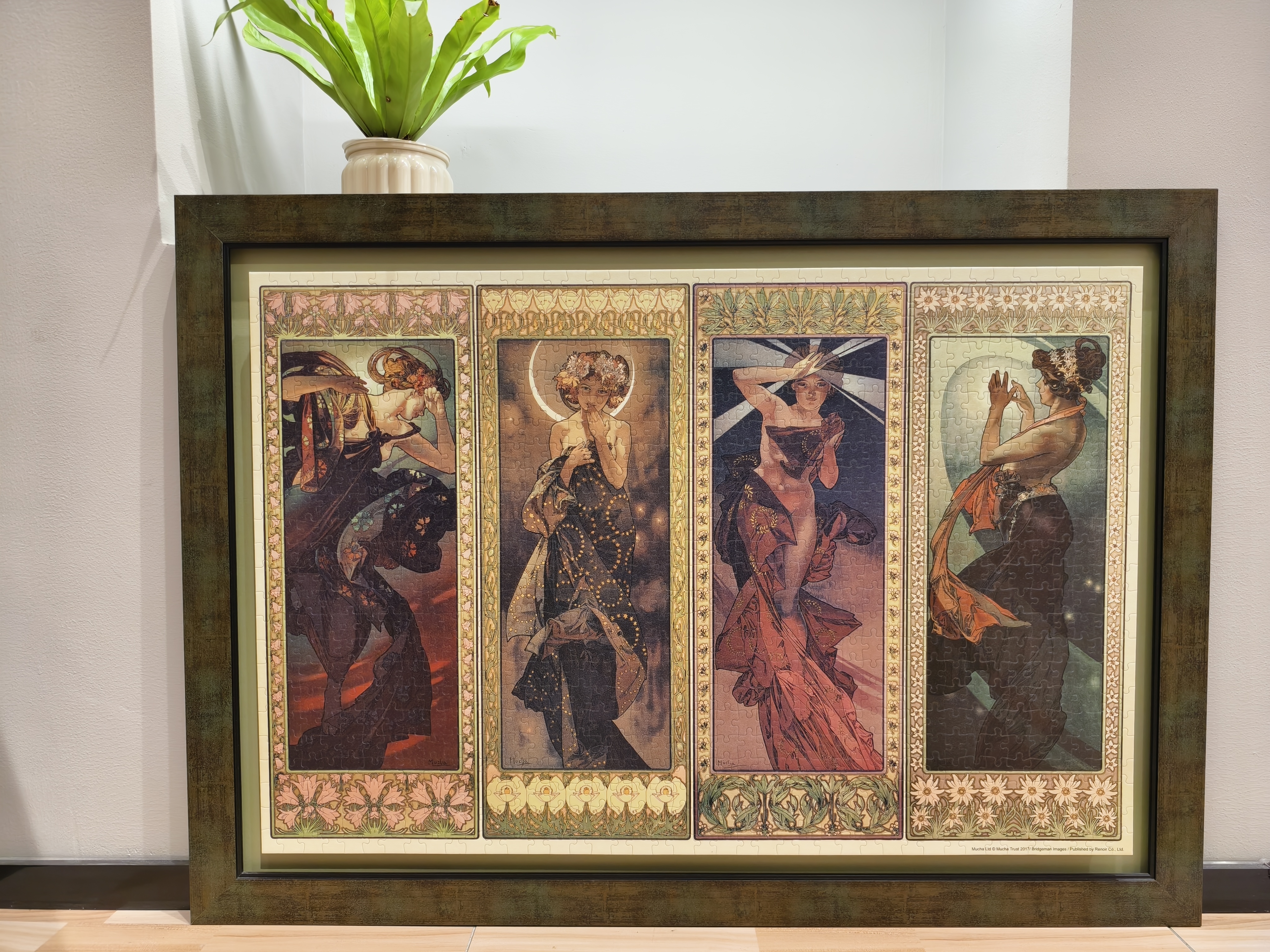 裱法解析:表面亚克力板+卡纸+框,拼图和框之间有卡纸相连,拼图呈现平面效果