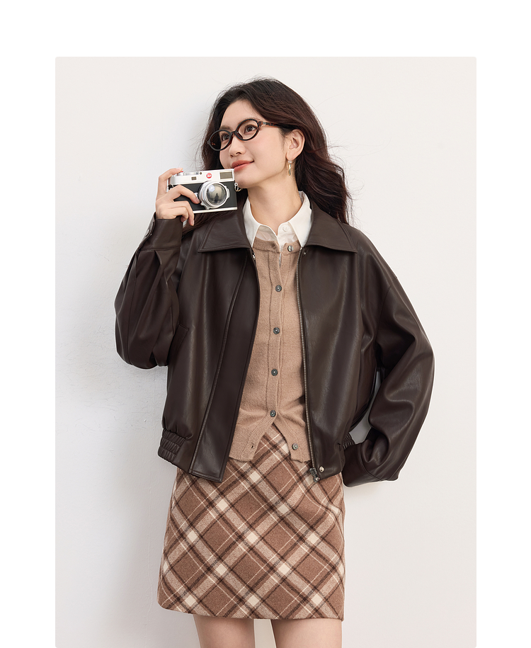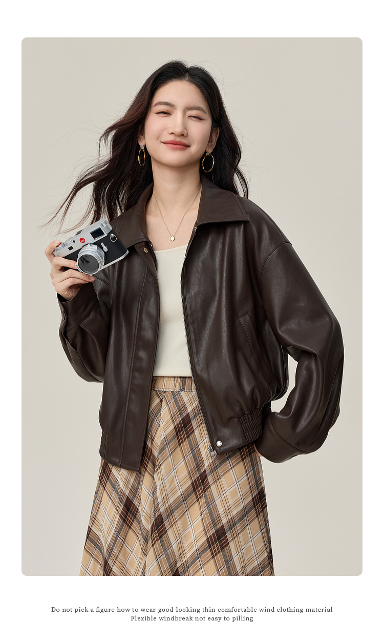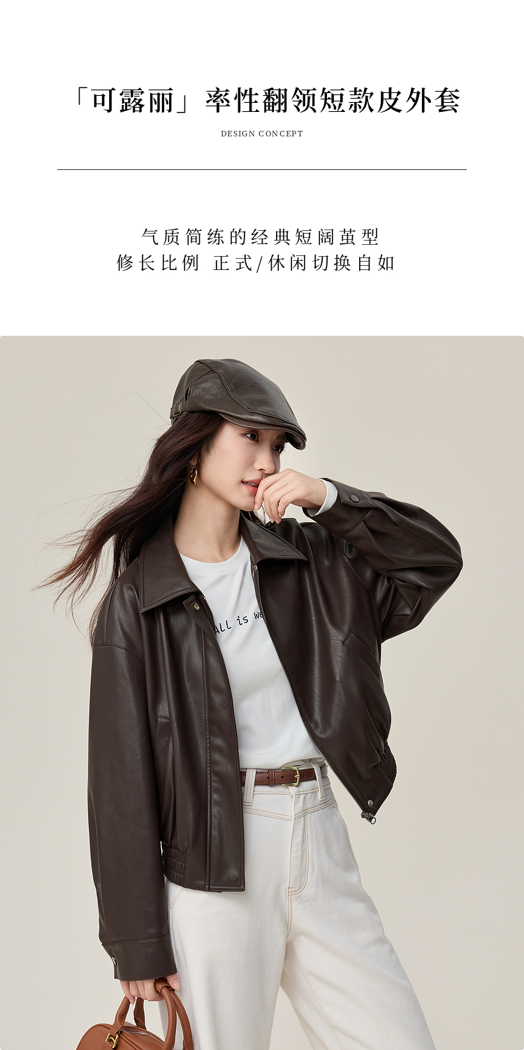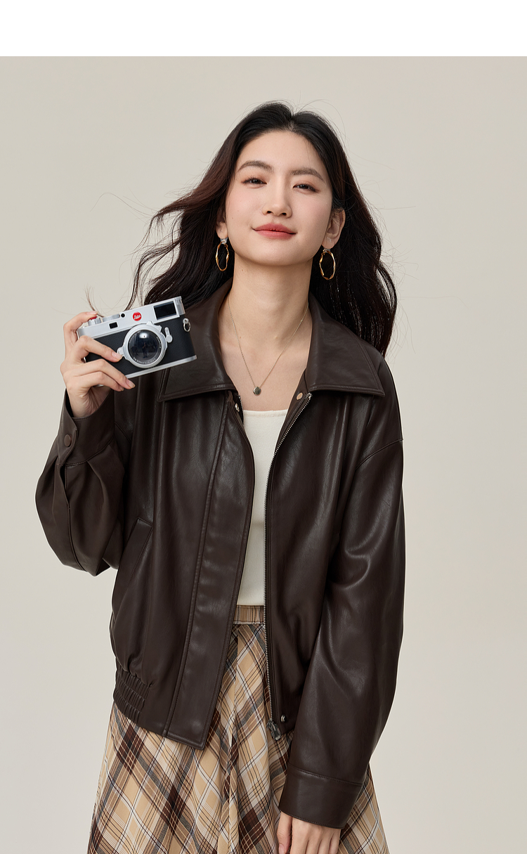 【09/17新品】熙世界可露丽风棕色皮外套女短款2025秋季新款复古PU夹克翻领皮衣