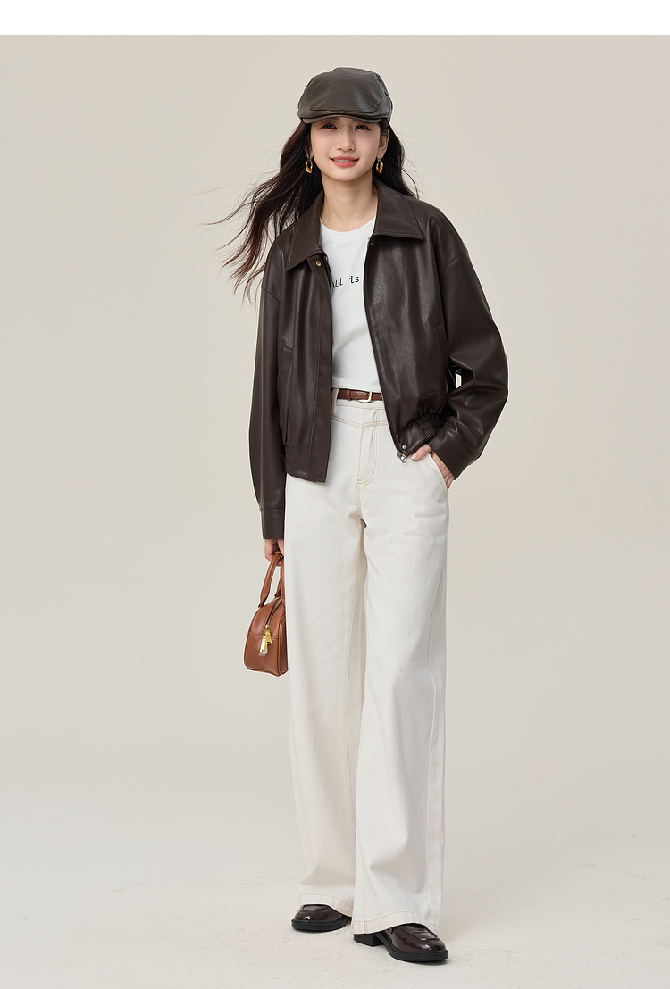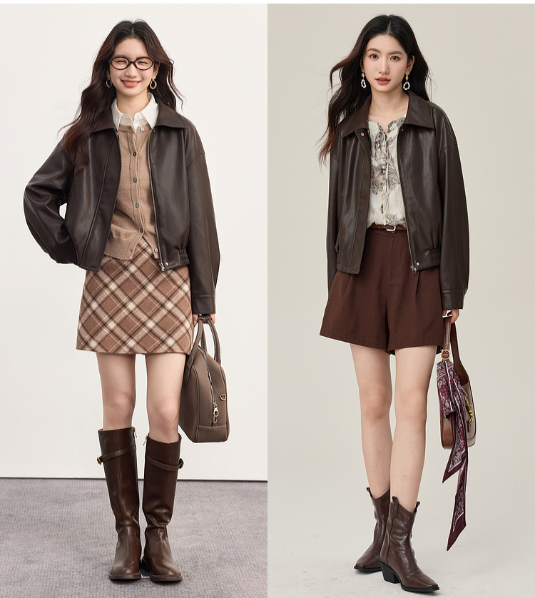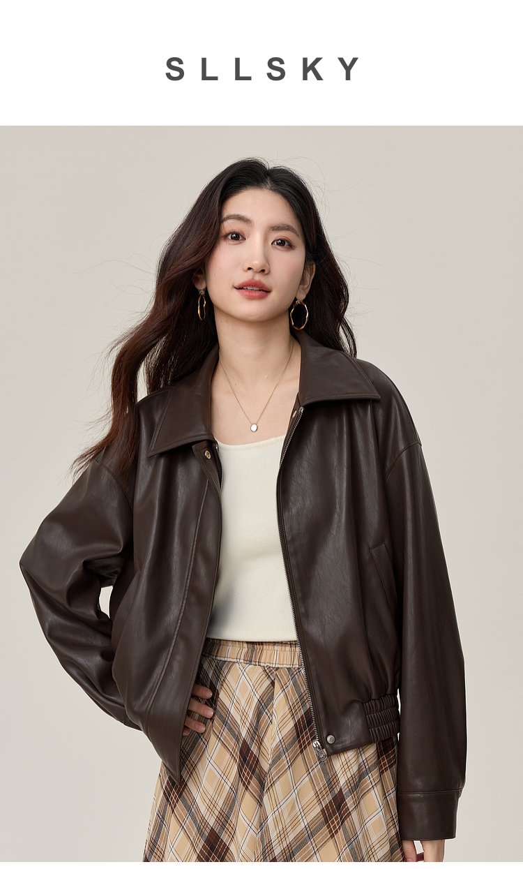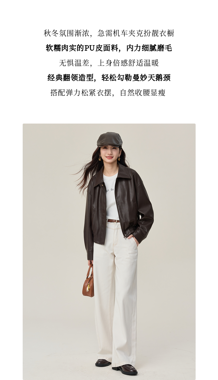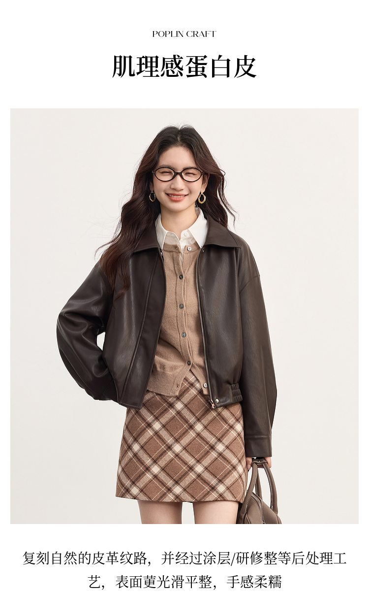 【09/17新品】熙世界可露丽风棕色皮外套女短款2025秋季新款复古PU夹克翻领皮衣