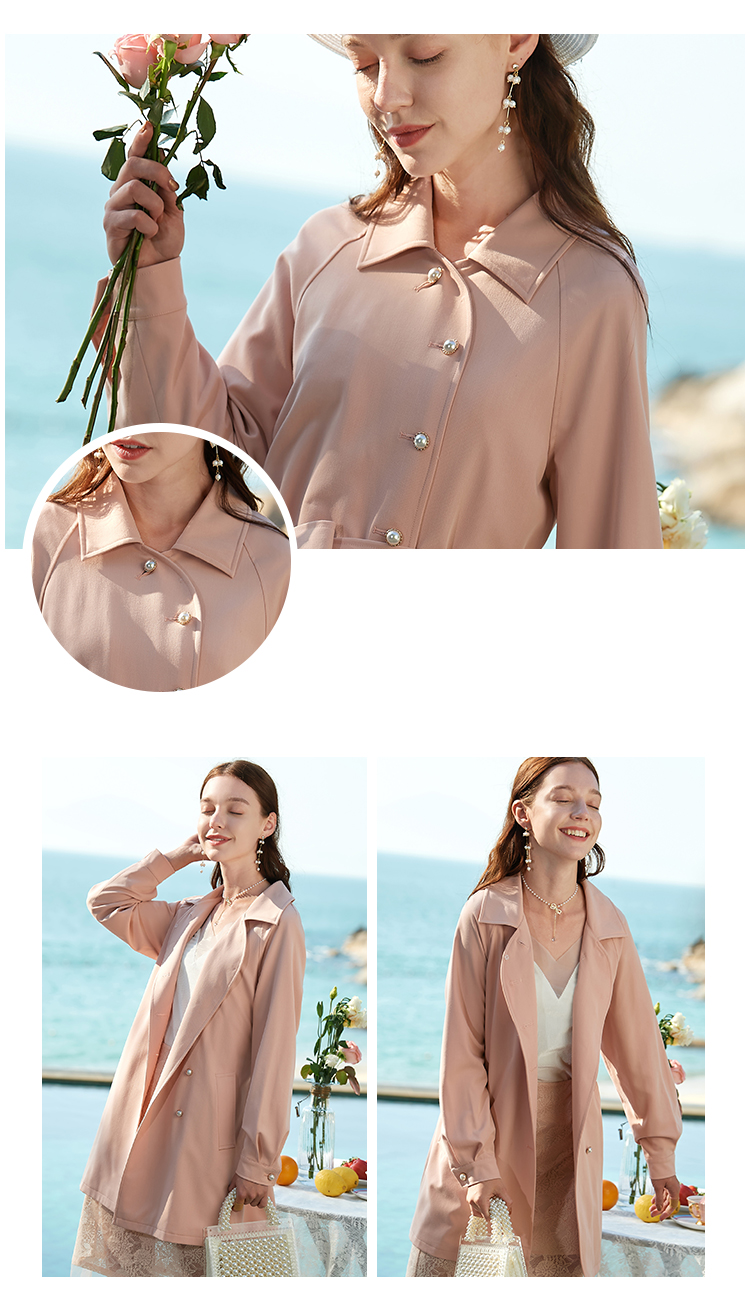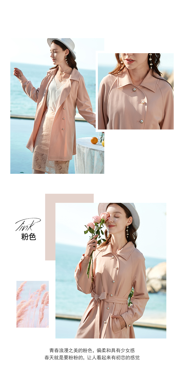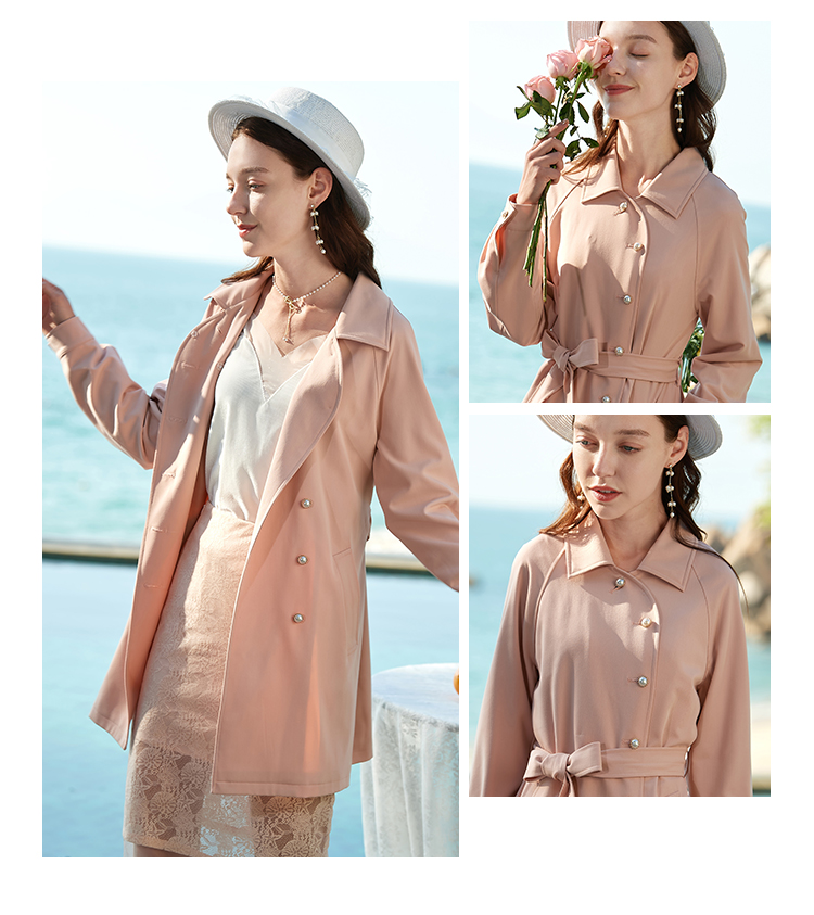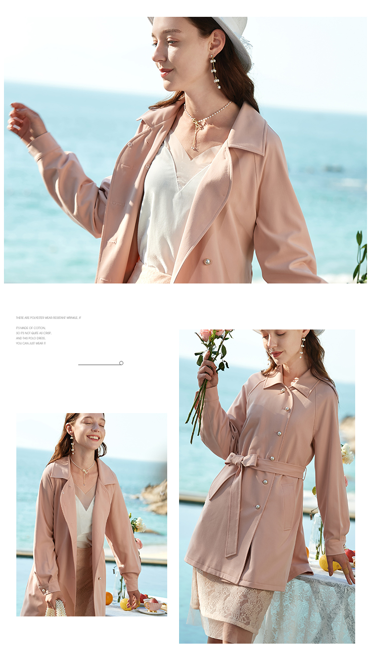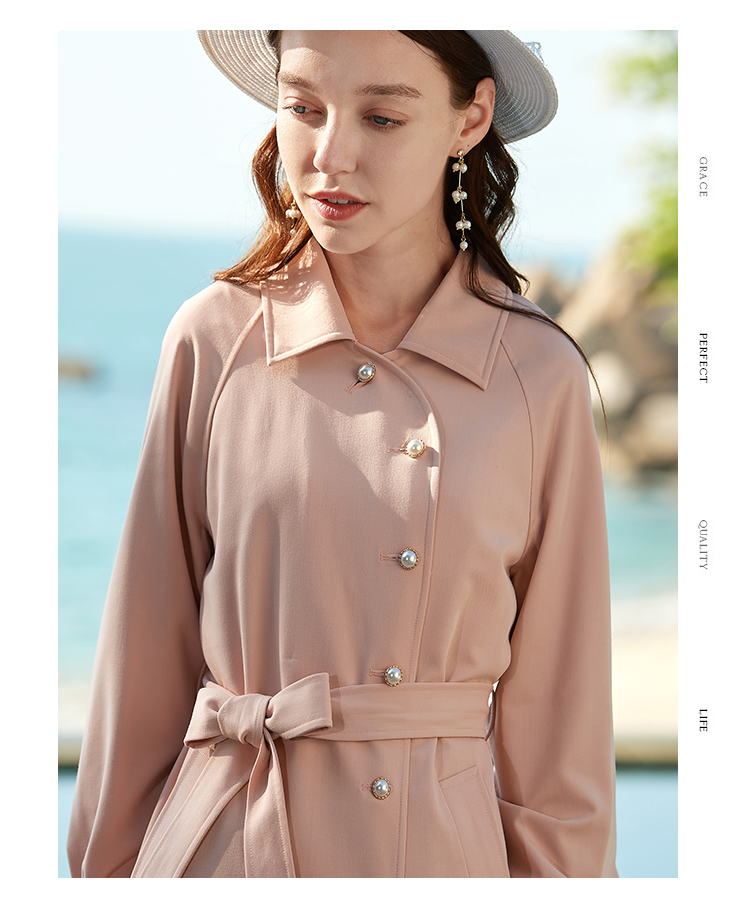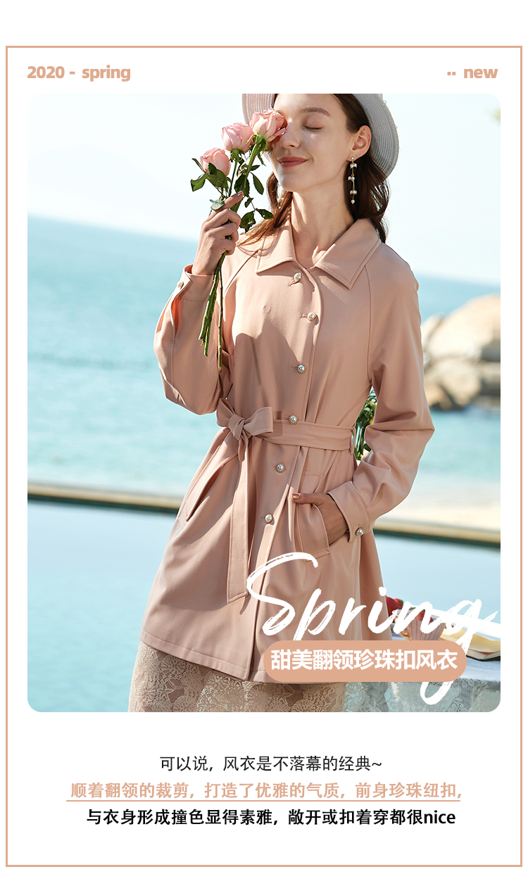 欧芮儿春夏新款长袖系带收腰风衣女中长款显瘦珍珠扣外套