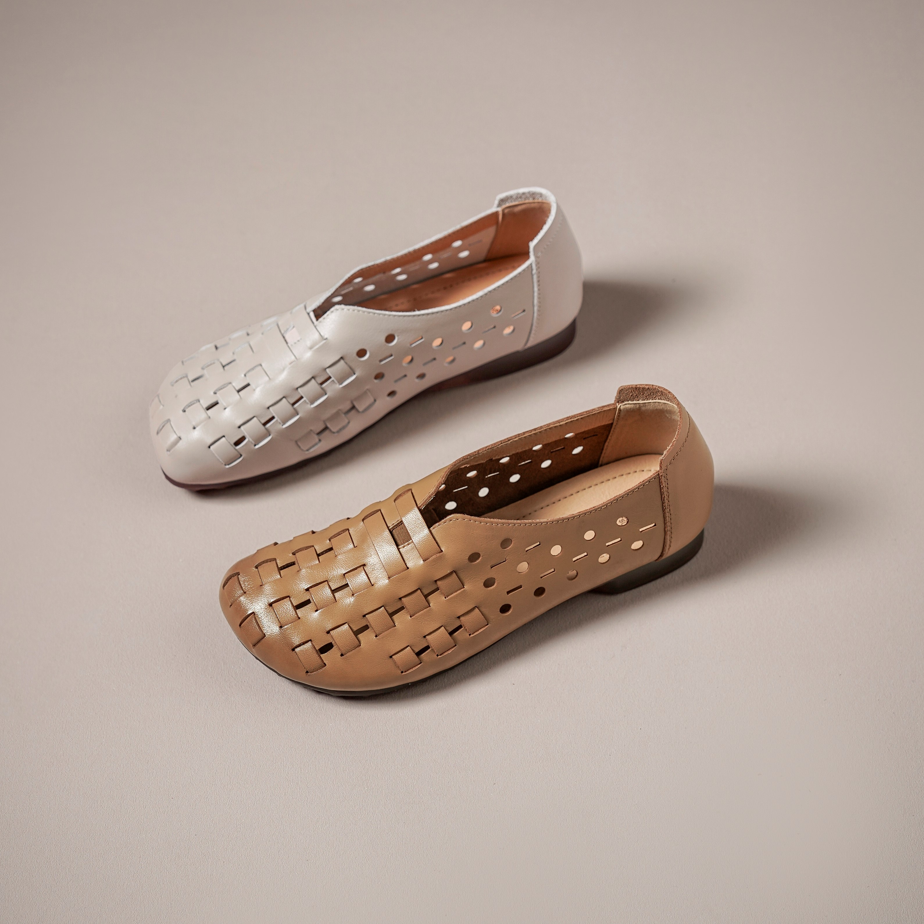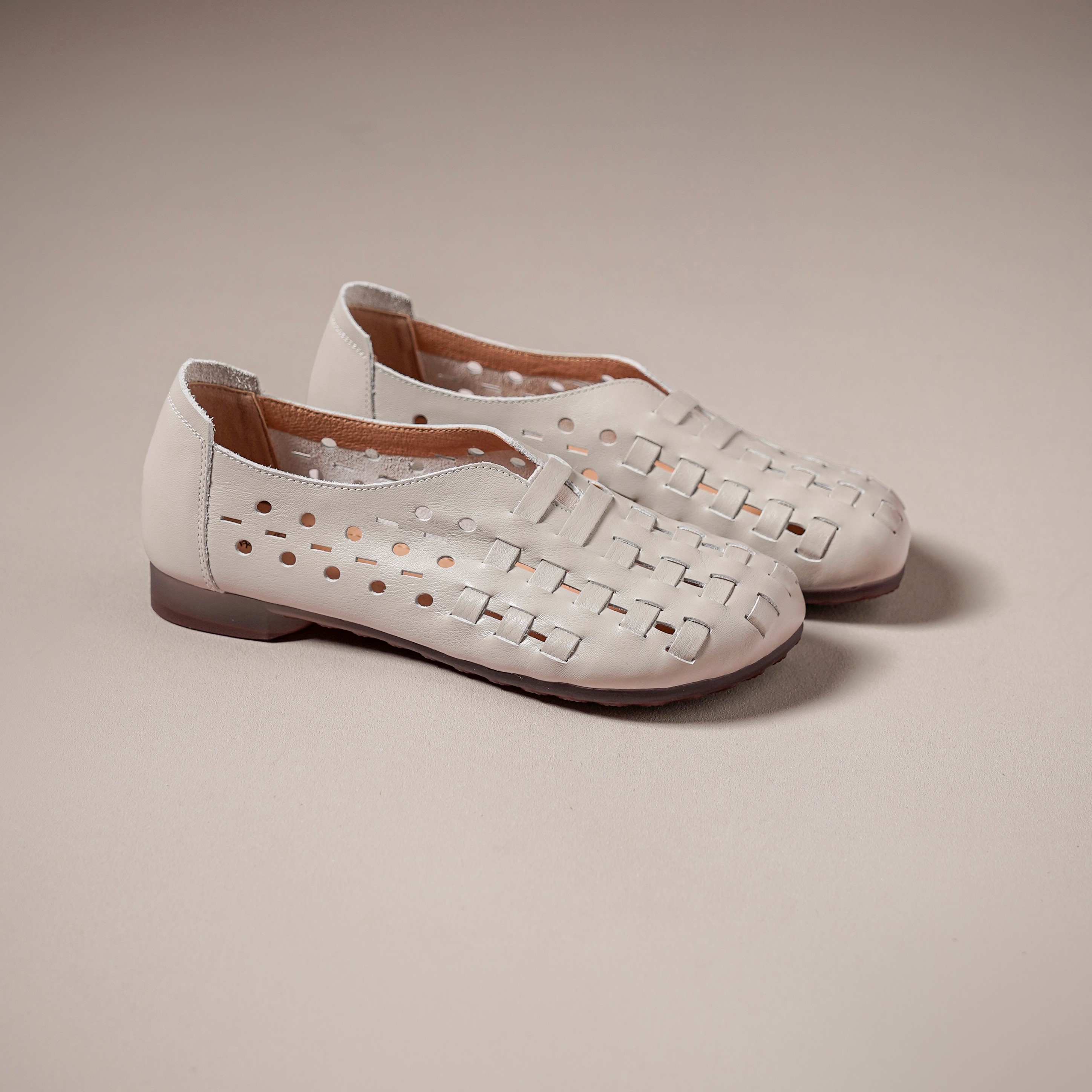 【牛皮革】西村名物2026年春季新款舒适平底猪皮内垫编织冲孔镂空洞洞空鞋T26AH18401