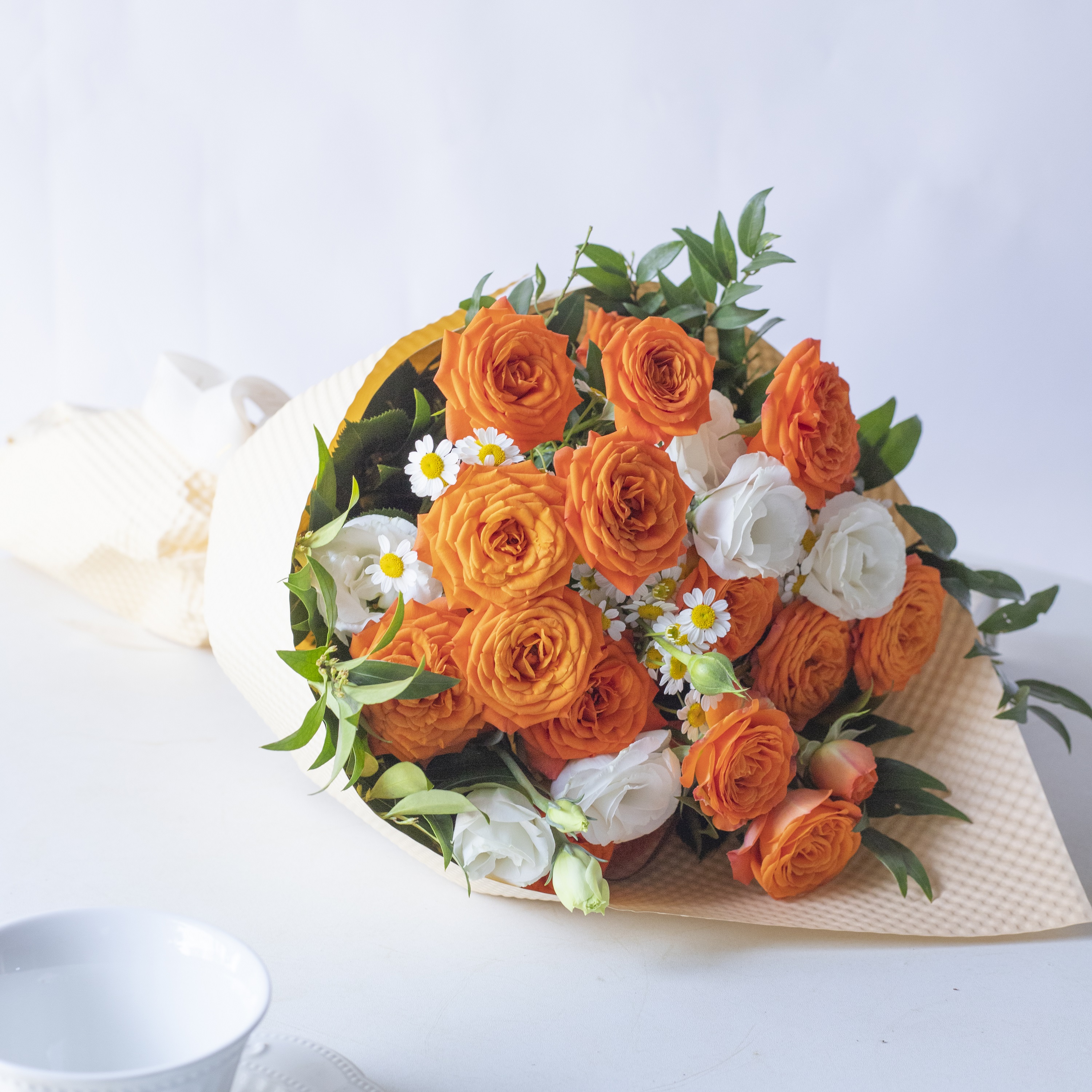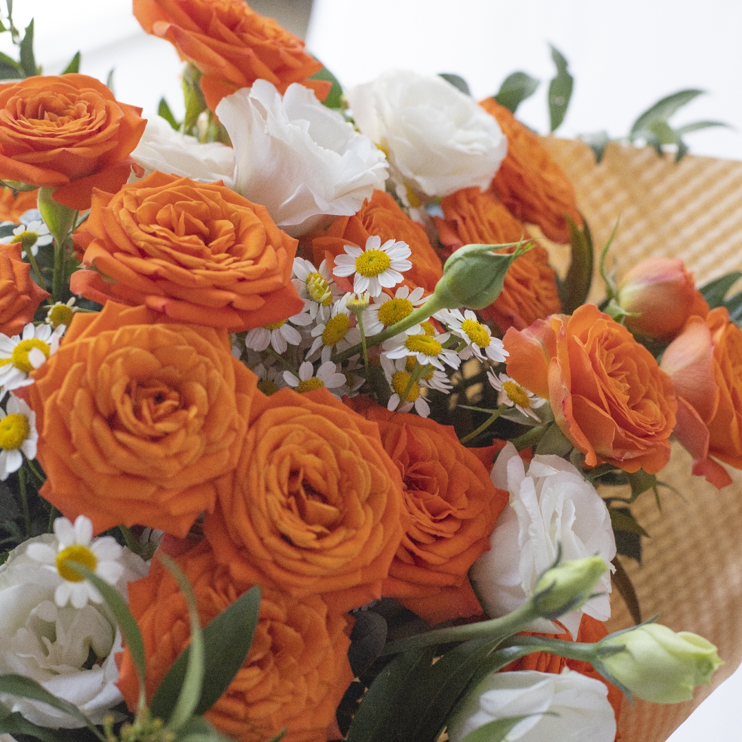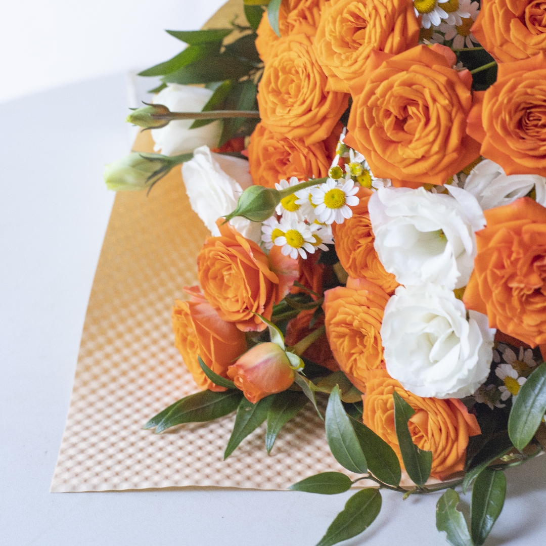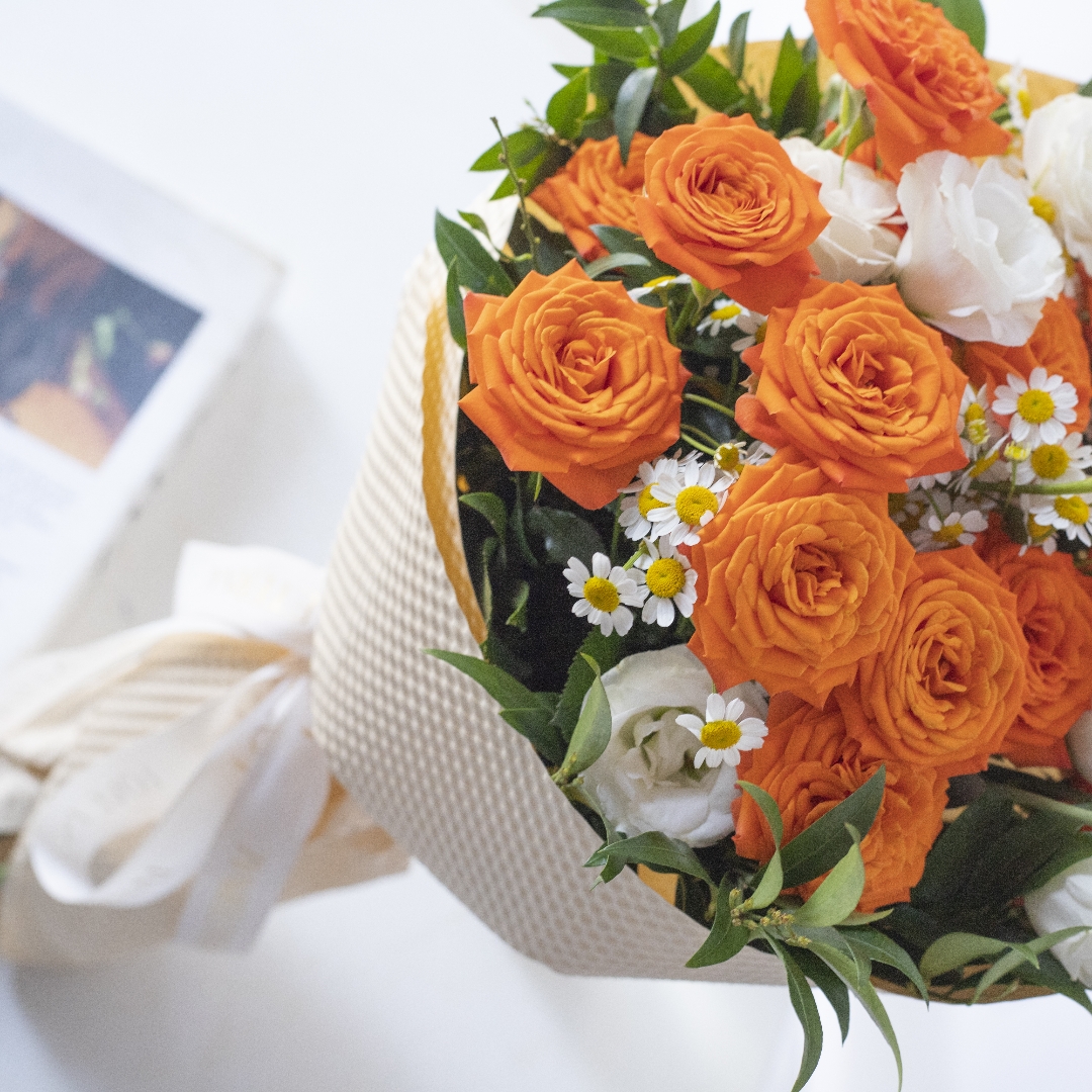 简包装花束:橙芭比5支+洋甘菊3支+白色桔梗2支+万年青1-2支