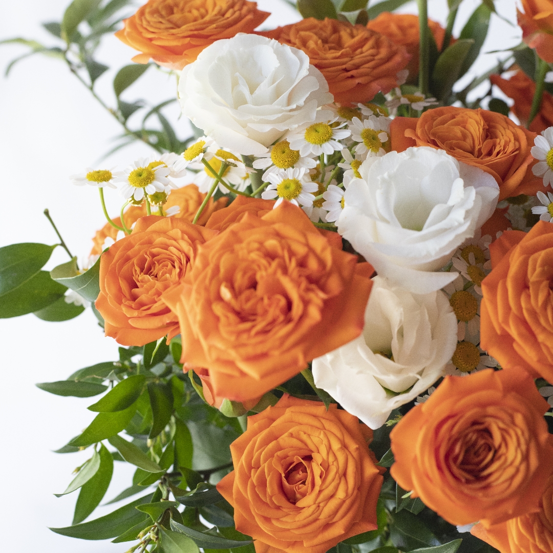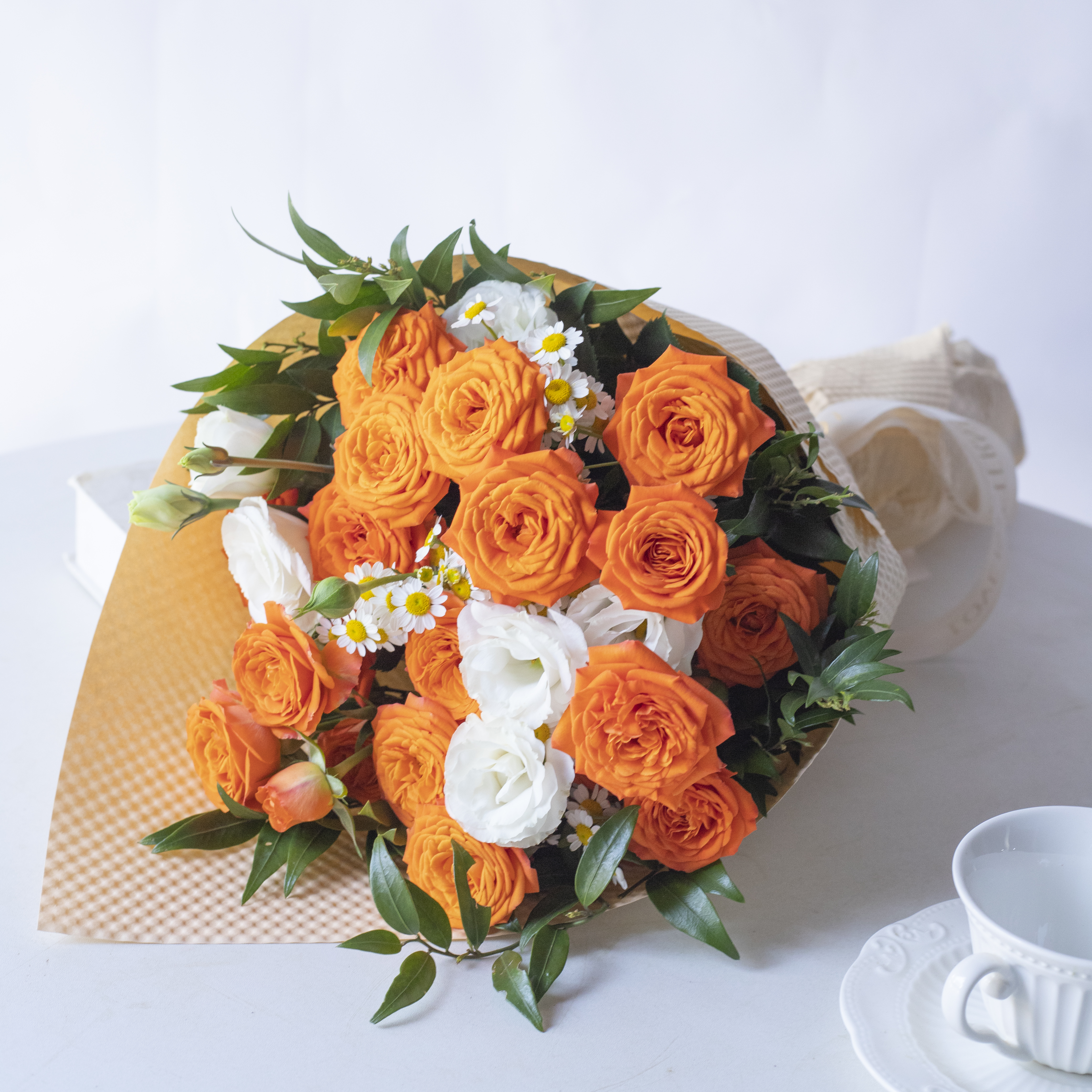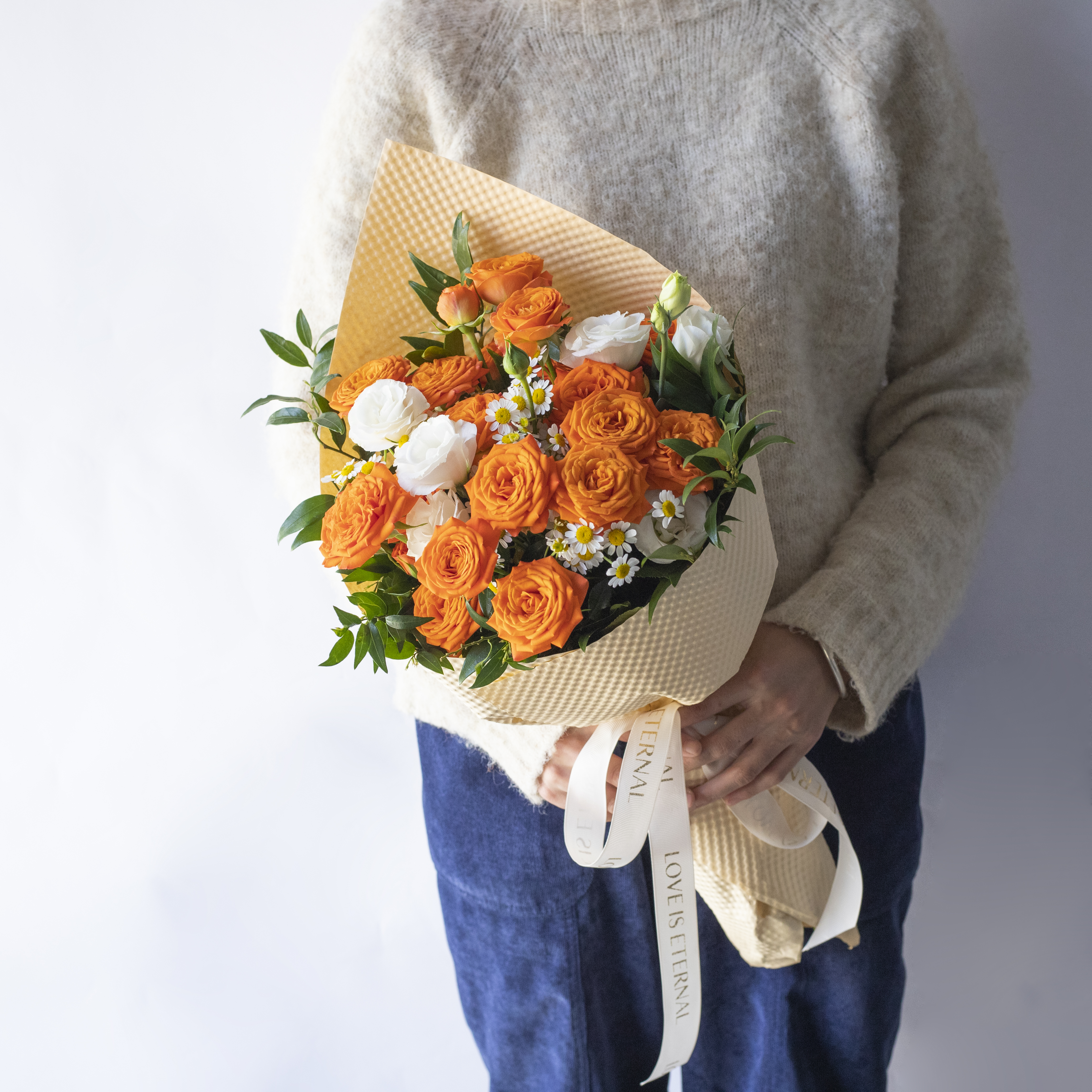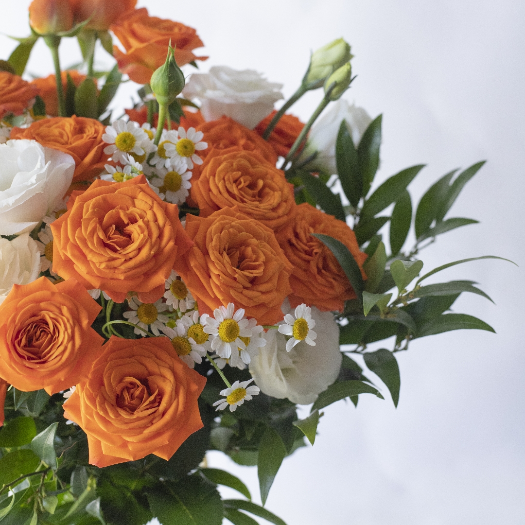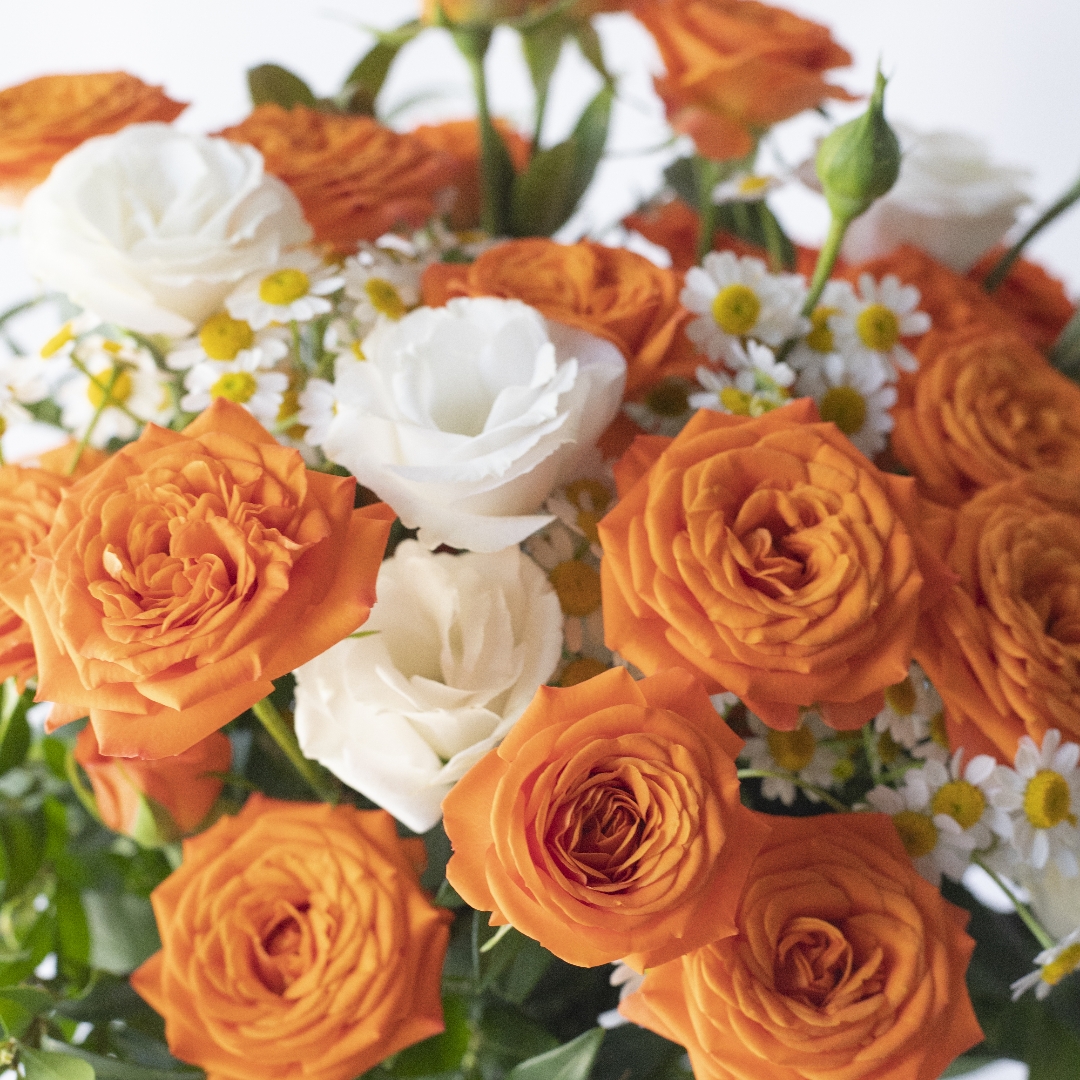 简包装花束:橙芭比5支+洋甘菊3支+白色桔梗2支+万年青1-2支