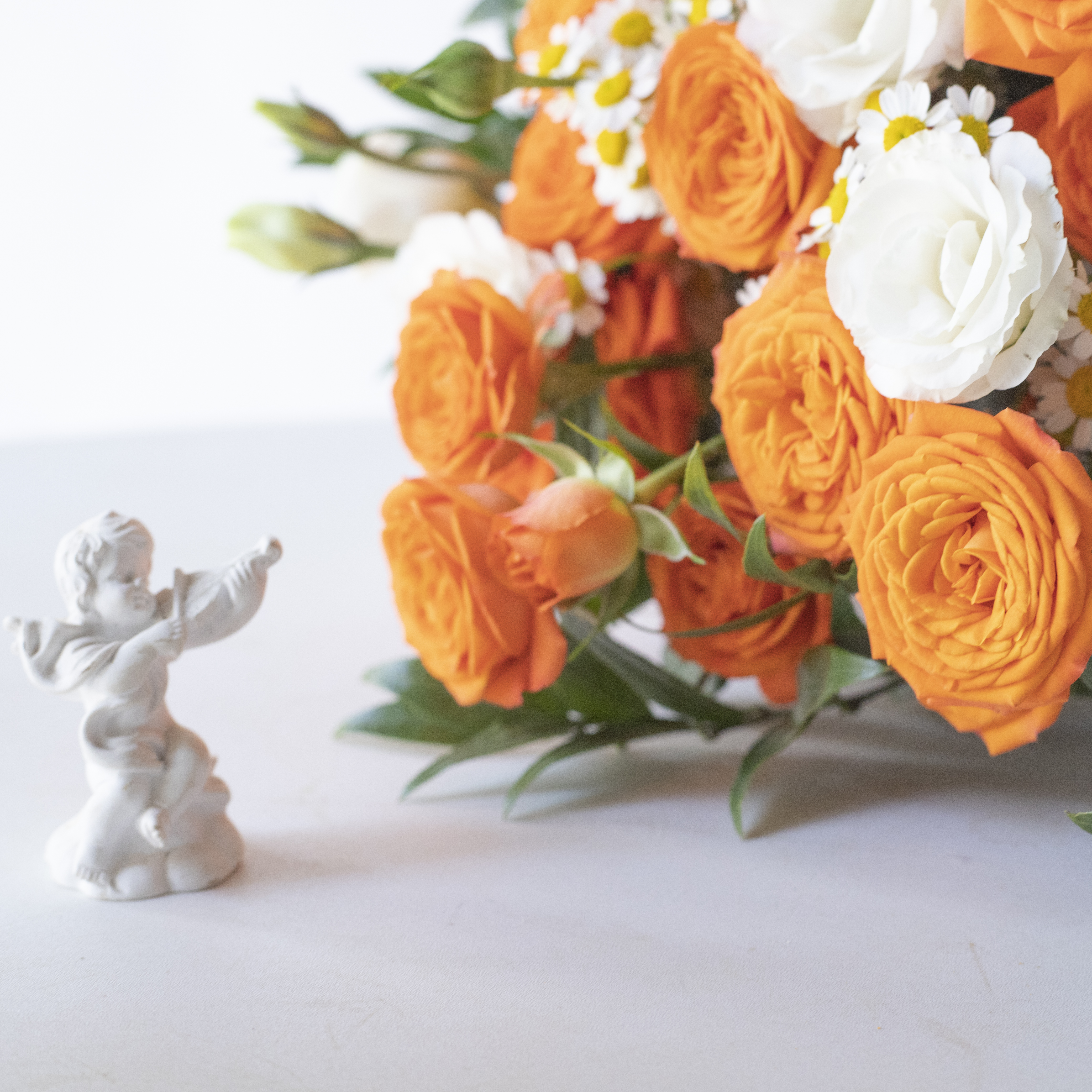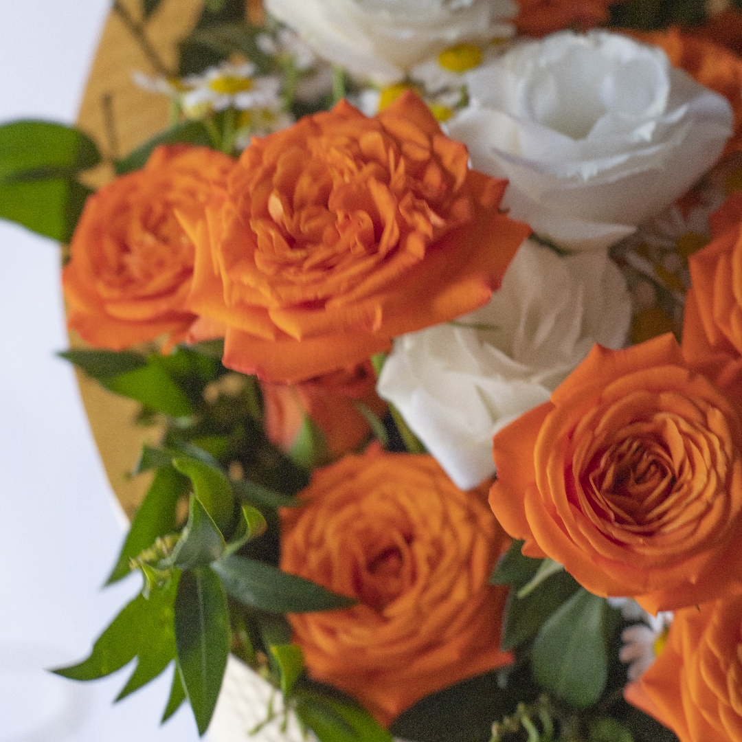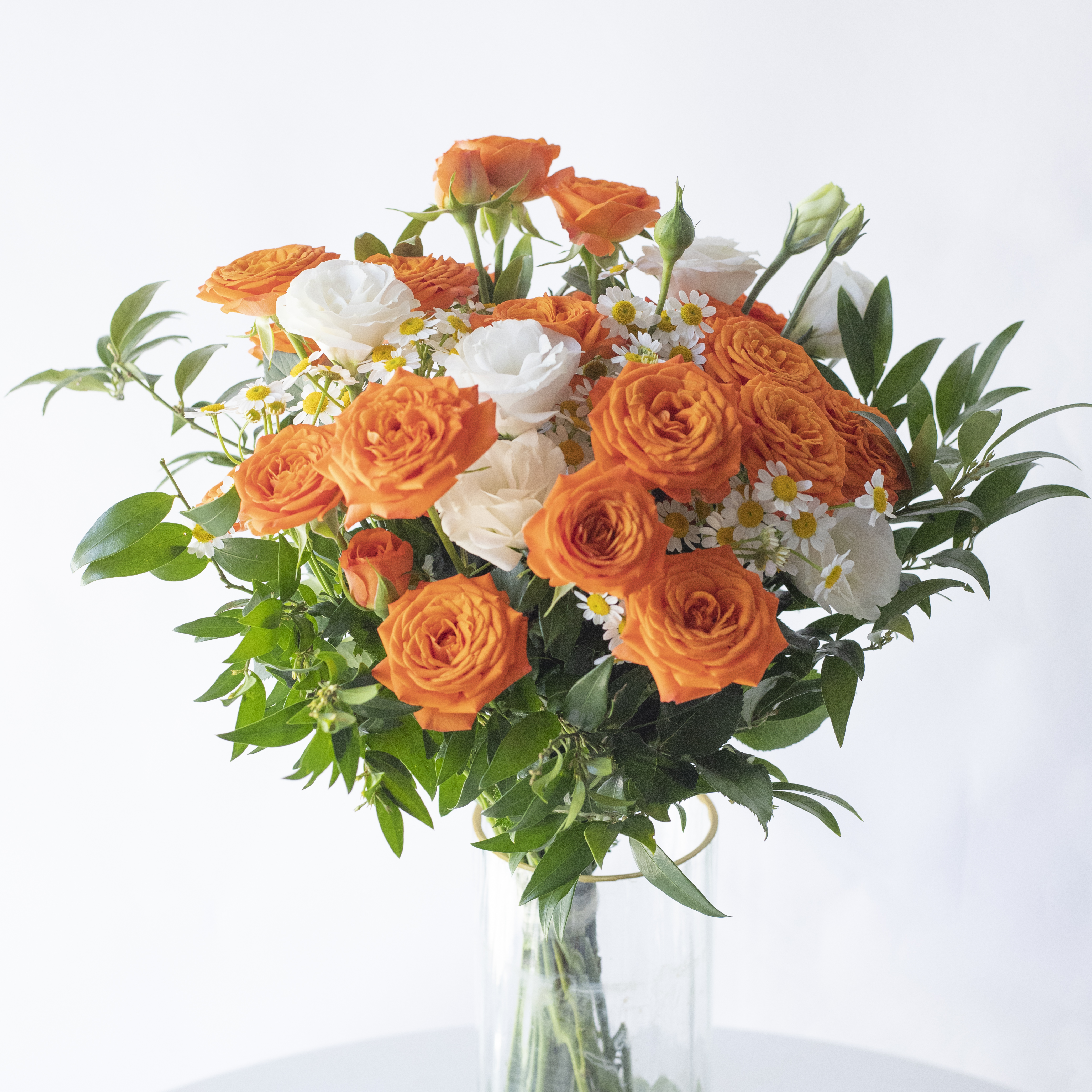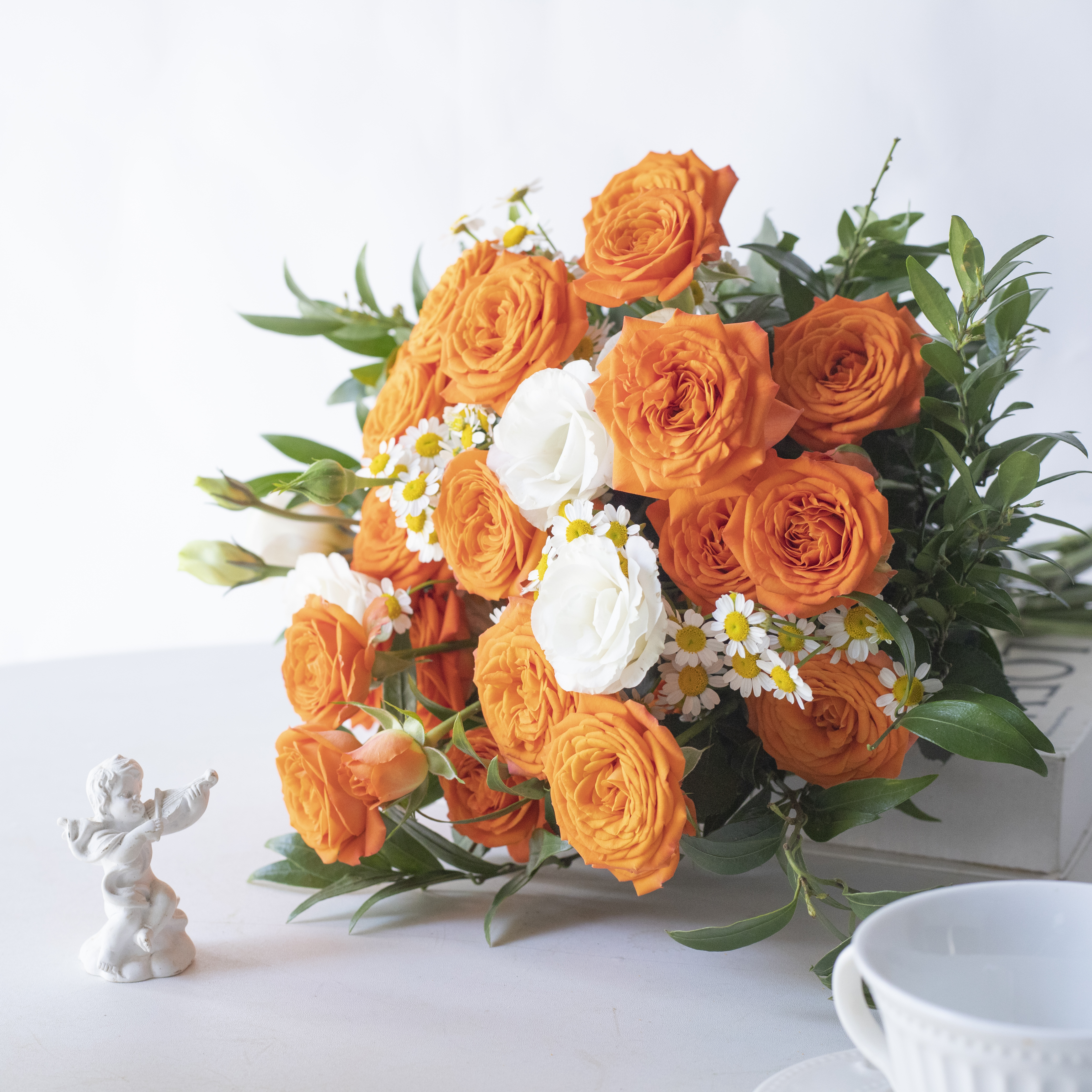 简包装花束:橙芭比5支+洋甘菊3支+白色桔梗2支+万年青1-2支