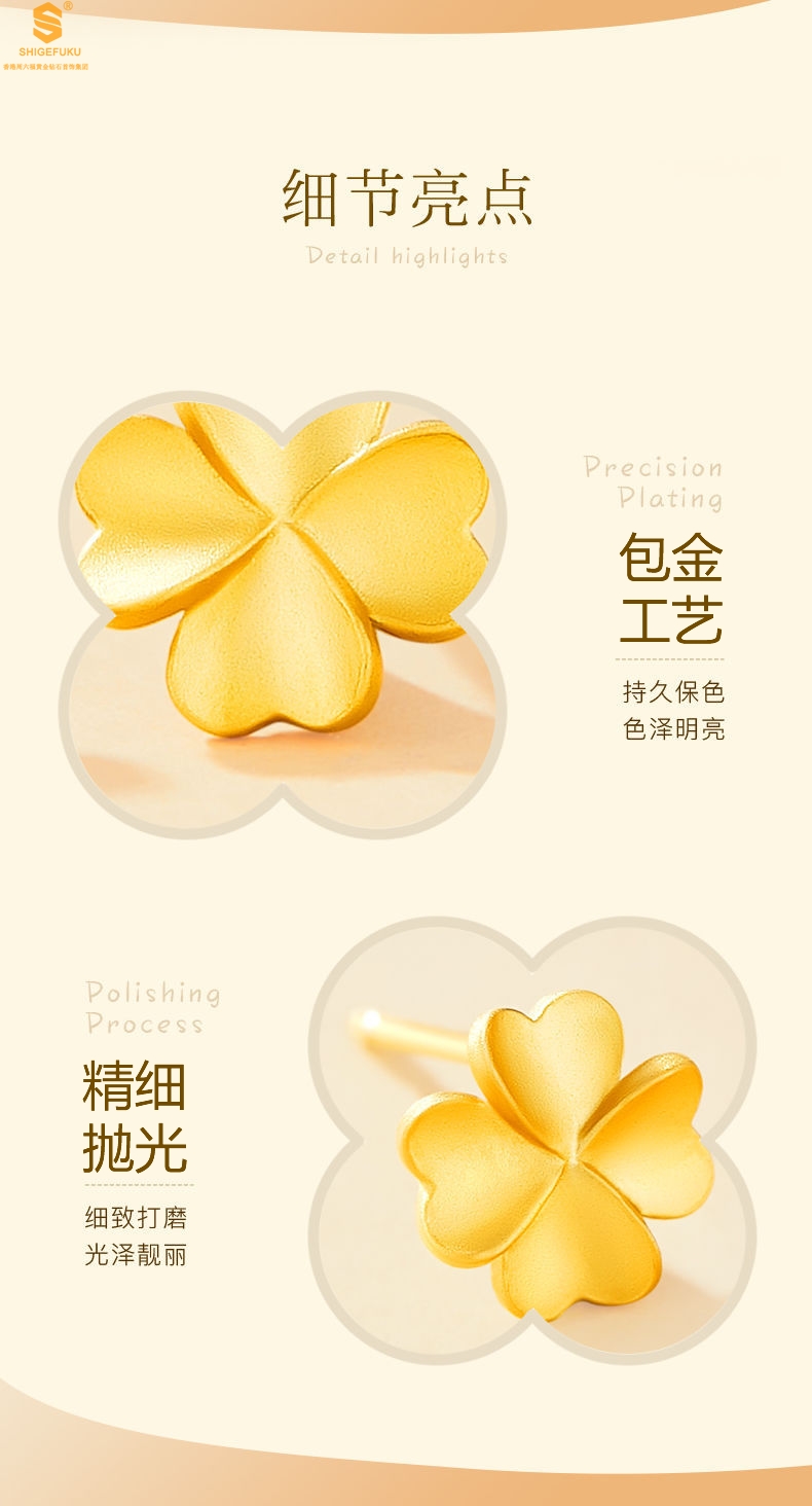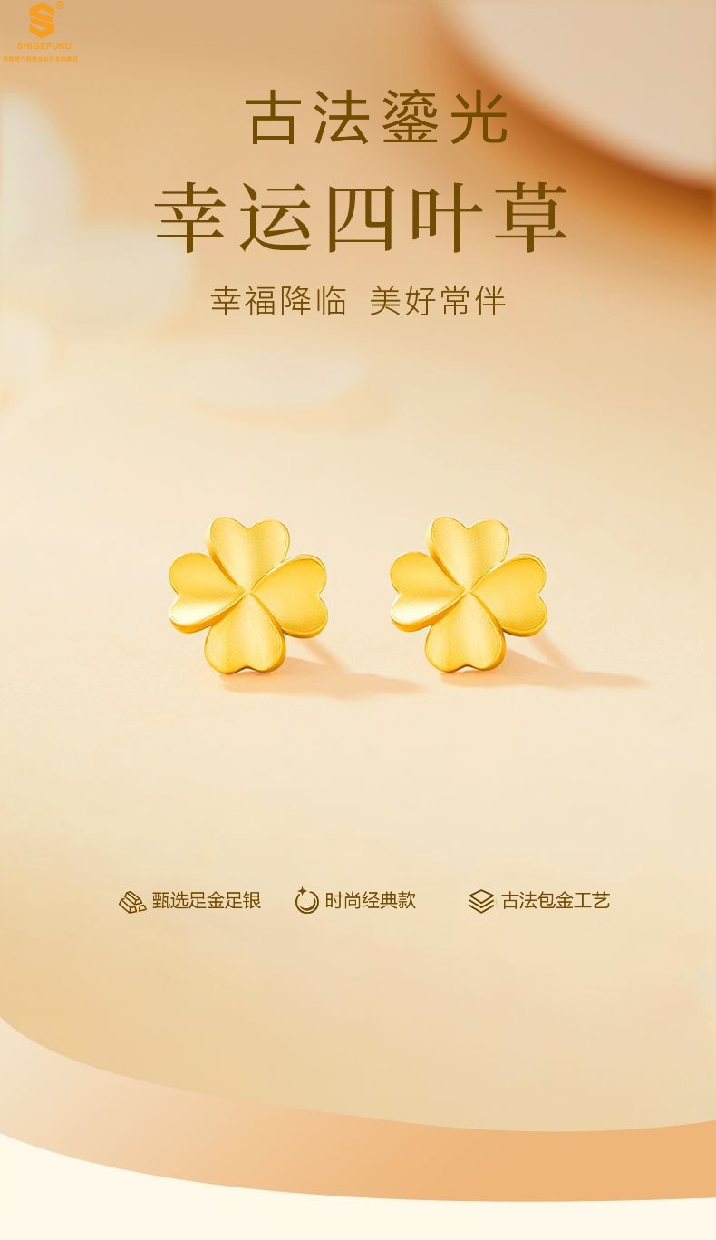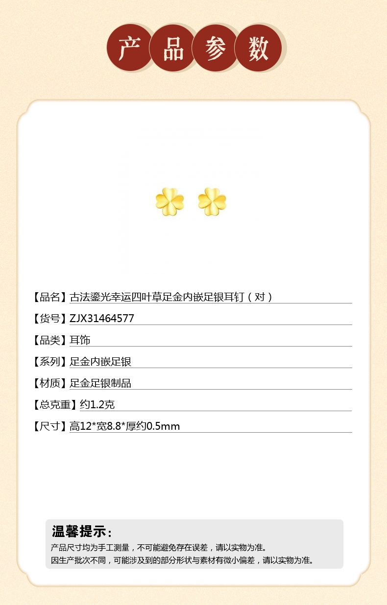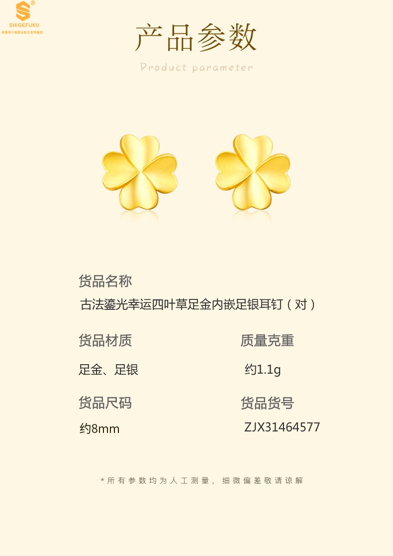 【品名】古法鎏光幸运四叶草足金内嵌足银耳钉(对)