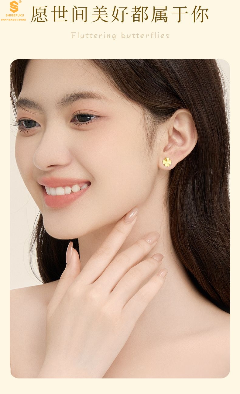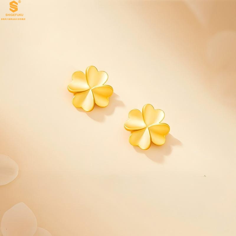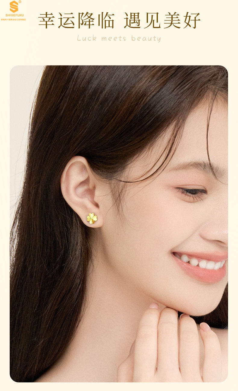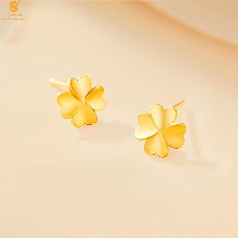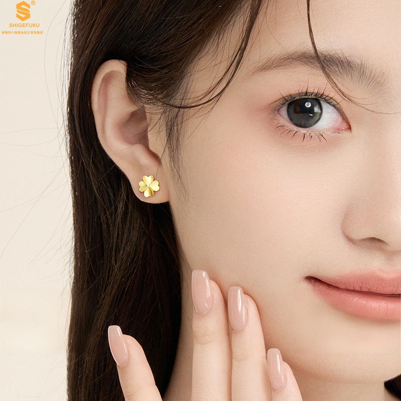 【品名】古法鎏光幸运四叶草足金内嵌足银耳钉(对)