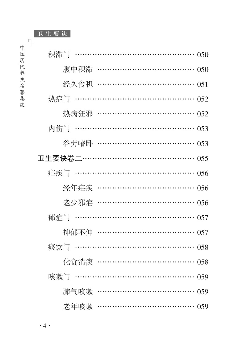 《卫生要诀》是一部系统阐述中医养生与疾病防治的珍贵典籍,收录于《中医历代养生名著集成》丛书之中。全书分为四卷,内容涵盖药性相恶、饮食禁忌、疾病诊治等多个方面,旨在指导人们通过合理用药、饮食调养和生活调理来达到养生保健的目的。书中不仅探讨了药物配伍的禁忌与补益之道,还对孕妇用药、饮食相克等具体问题进行了深入分析,提供了诸多实用的养生建议。此外,书中还对多种常见疾病如中风、伤寒、感冒等的病因、症状及治疗方法进行了详细论述,体现了中医理论与实践相结合的特点。全书以科学严谨的态度和通俗易懂的语言,为后世留下了宝贵的养生与医疗智慧。