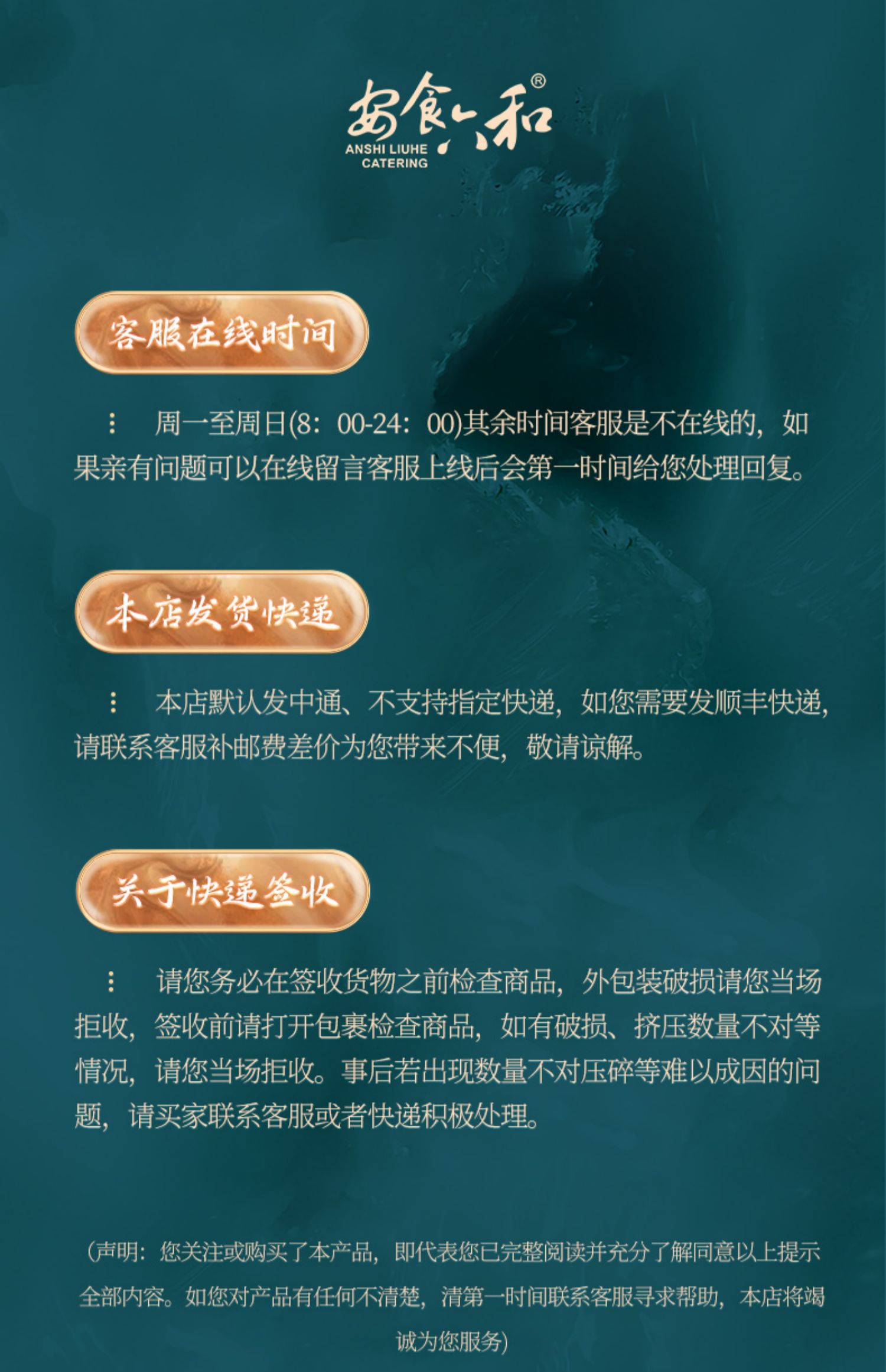 1、本产品食品下单后不支持7天无理由退换货,不支持拦截&拒收,执意要拦截拒收的需承担10元拦截或拒收的物流费,请您谨慎下单。
