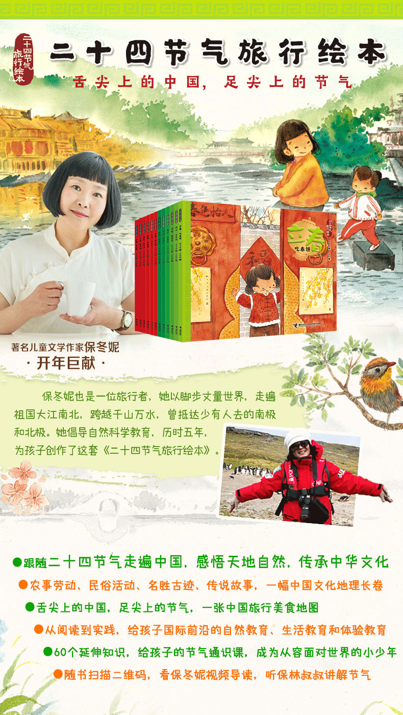 本系列以二十四节气为时间线,通过贝儿和家人的旅行故事,展现了中国24个城市和乡村的风土人情、美食美景,融合了有关节气的知识、文化历史故事、重要的农事劳动、有趣的民俗活动,时令饮食与养生,带领读者不仅走进中国传统文化,也走遍祖国大好河山,领略舌尖上的中国,足尖上的中国,从书本走进生活,拥抱大自然。