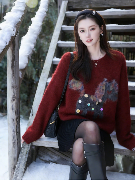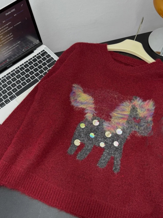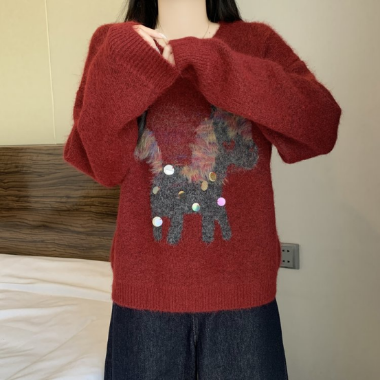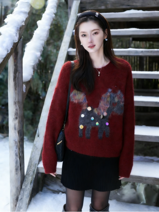 1、梦幻木马童趣亮片提花羊毛混纺毛衣N1386(安卡拉红色)