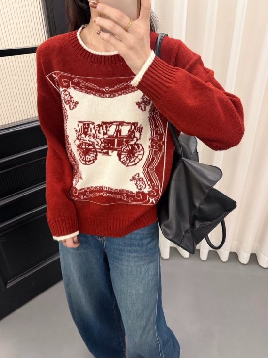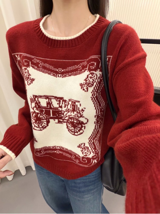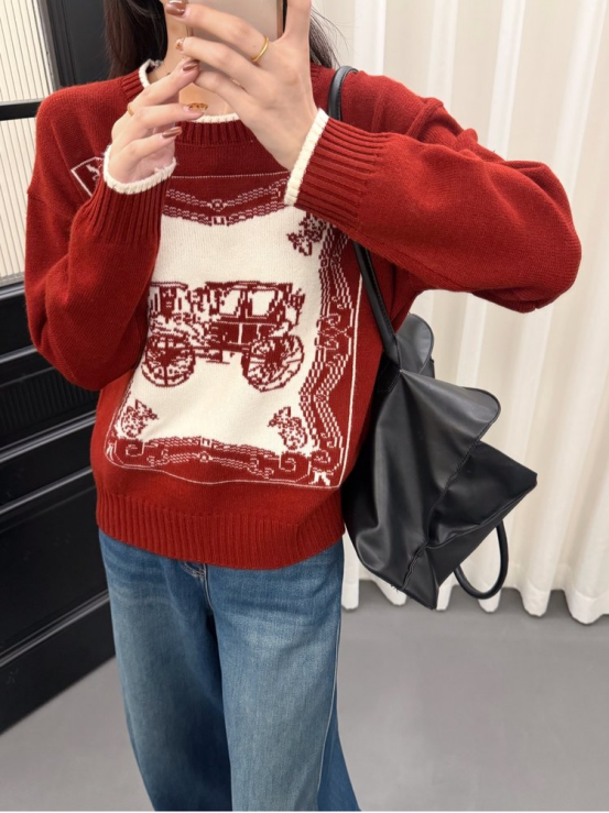 N1444马车款 底色 + 米白马车图案 像素风纹理自带 90 年代画报滤镜 精致的边框花纹 + 复古马车元素 穿出门被问 800 次链接! 针织面料软乎乎不扎肉 罗纹收口刚好藏住手臂小肉肉 搭牛仔裤是韩系松弛感,配半裙秒变温柔大小姐