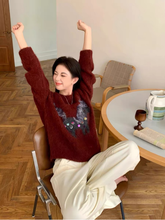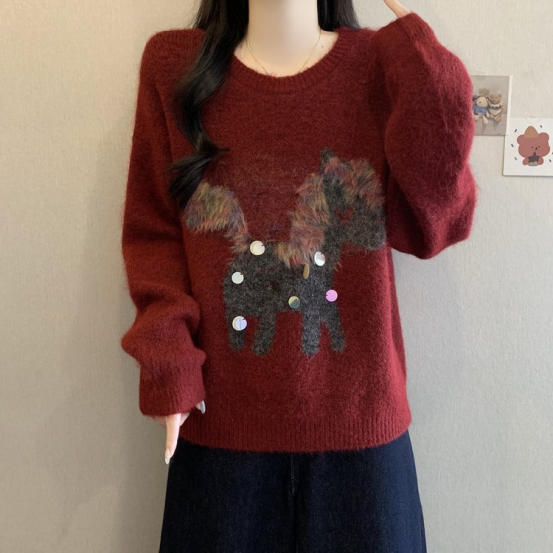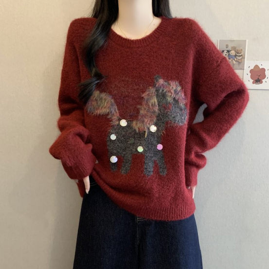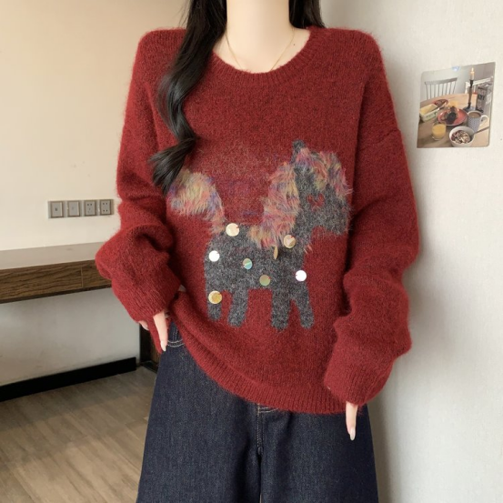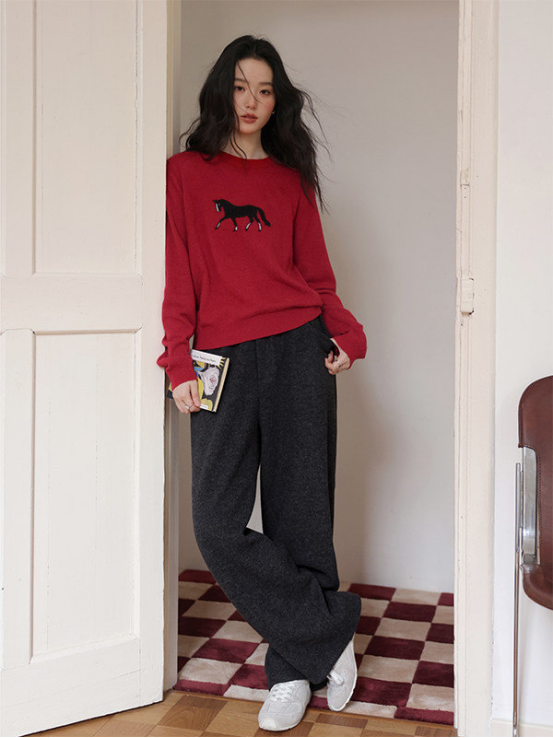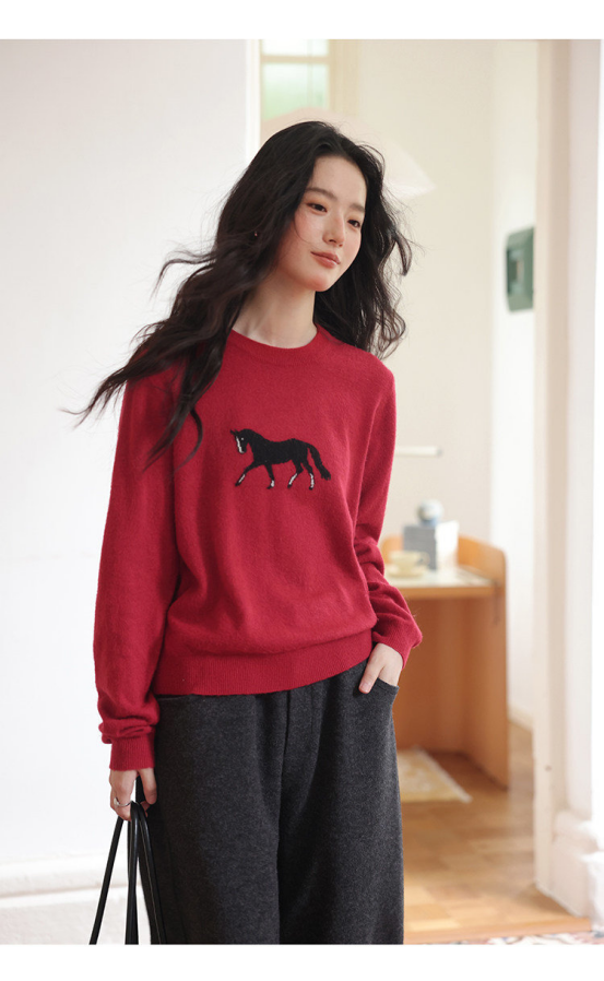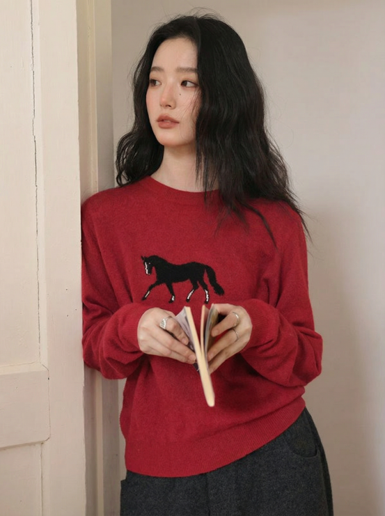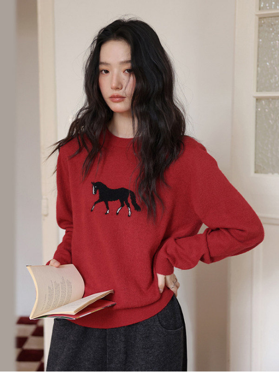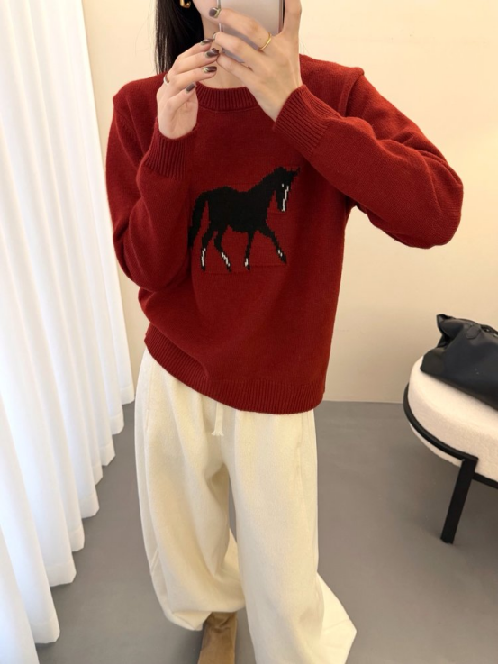 2、慵懒风小马提花圆领毛衣 N1443(红色)