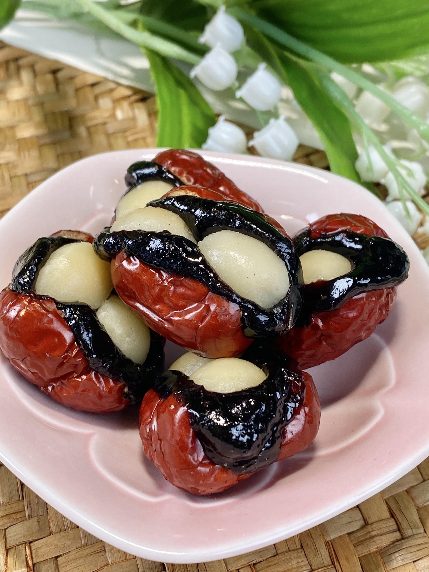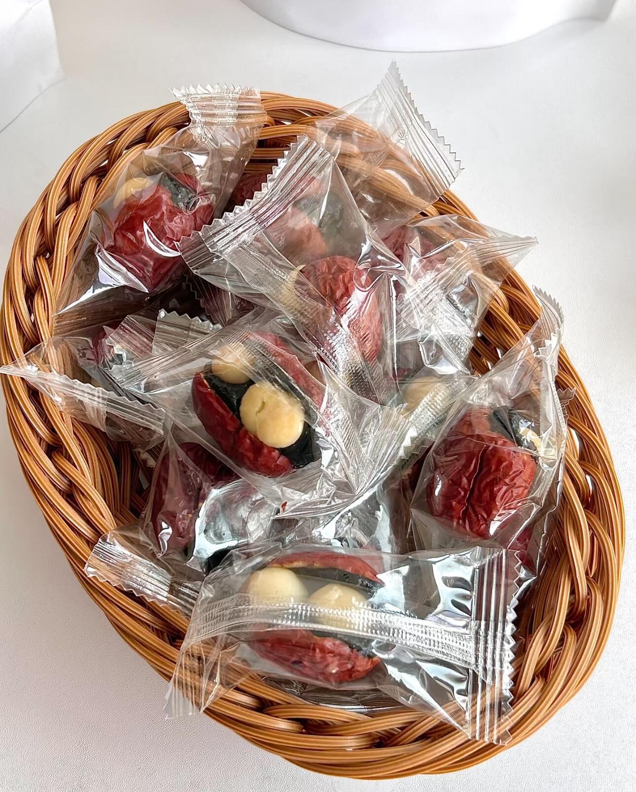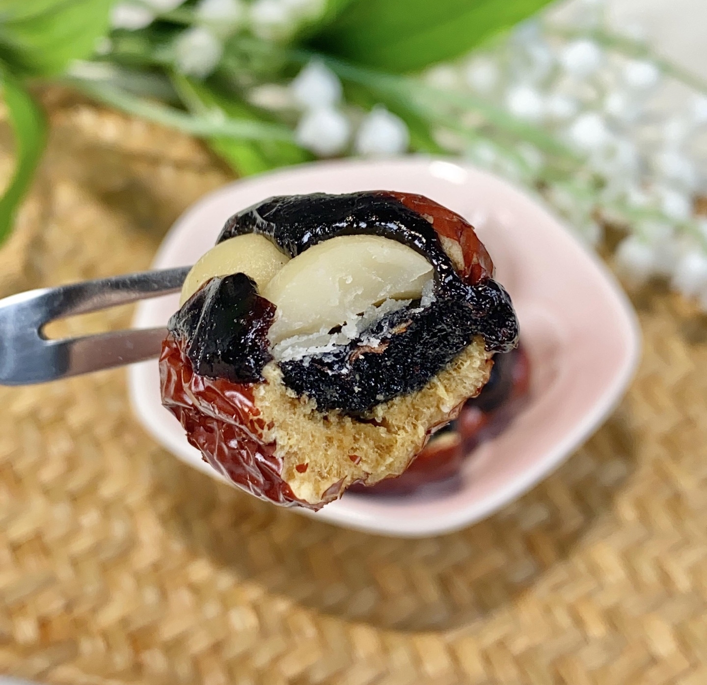 选用皮薄肉厚的特级新疆红枣,去核之后的枣子,肚子夹上手炒低甜血糯米糕,每颗枣上点缀两粒夏威夷果,入口甜甜糯糯,香香脆脆,口感别提多丰富了。