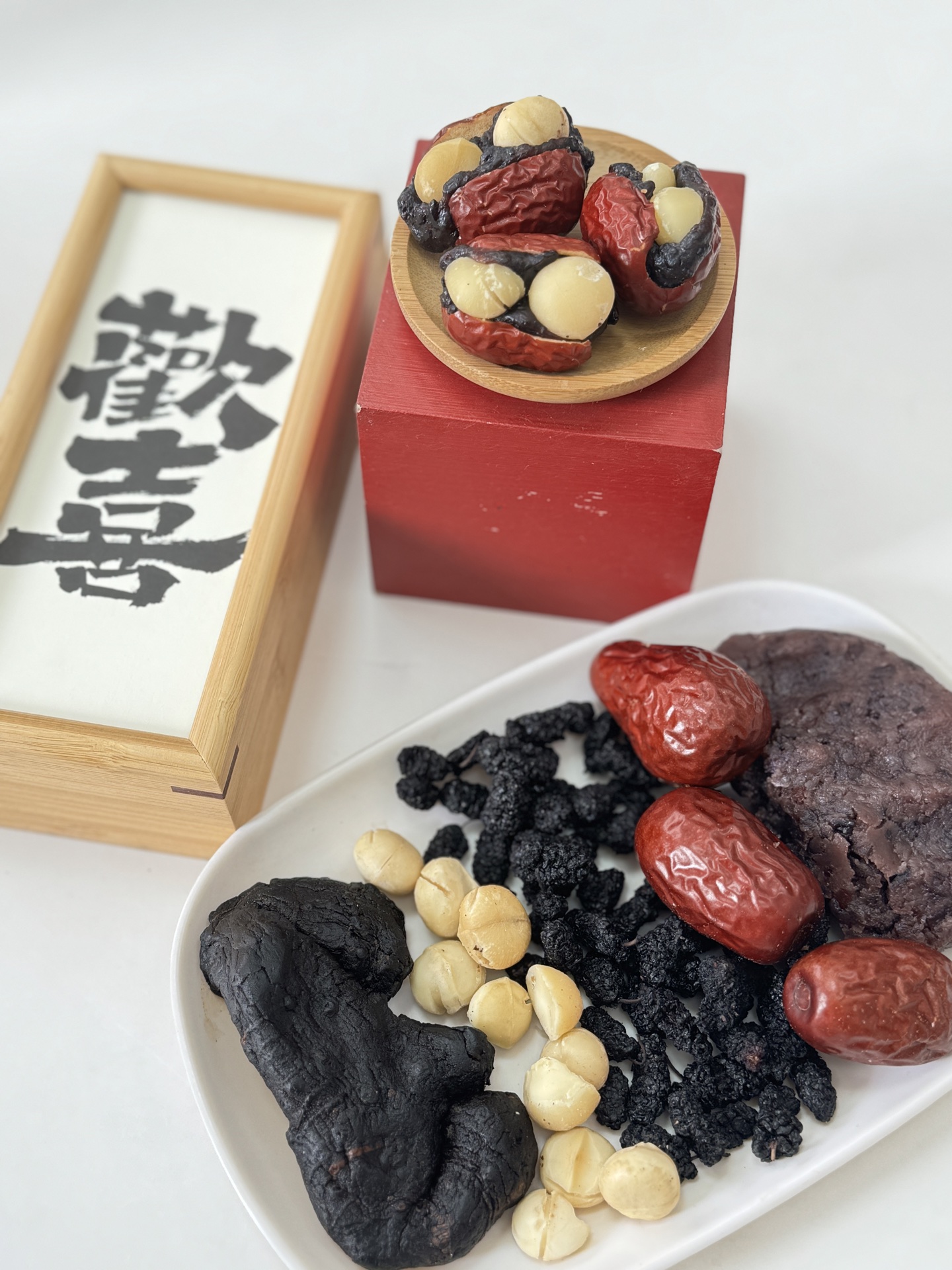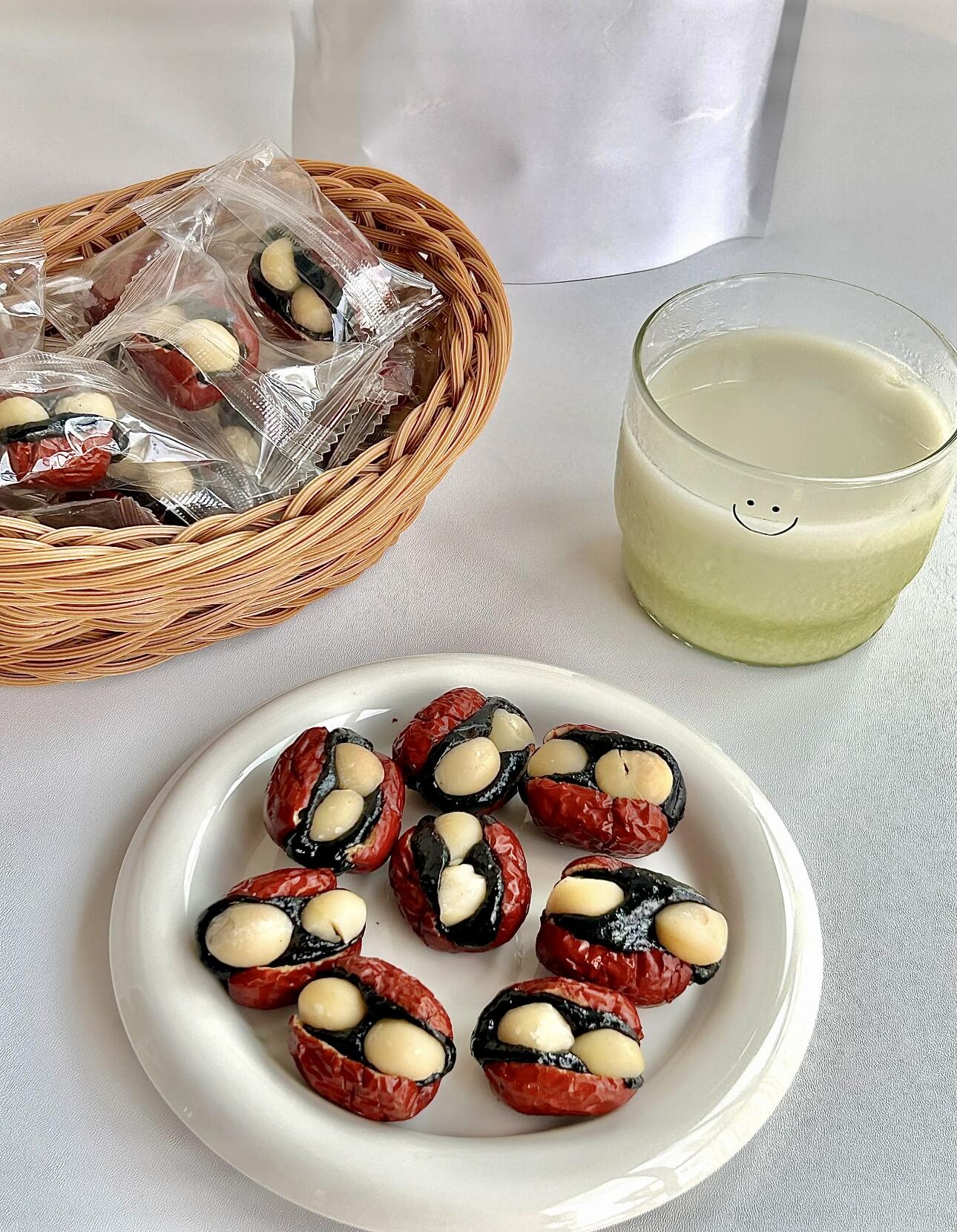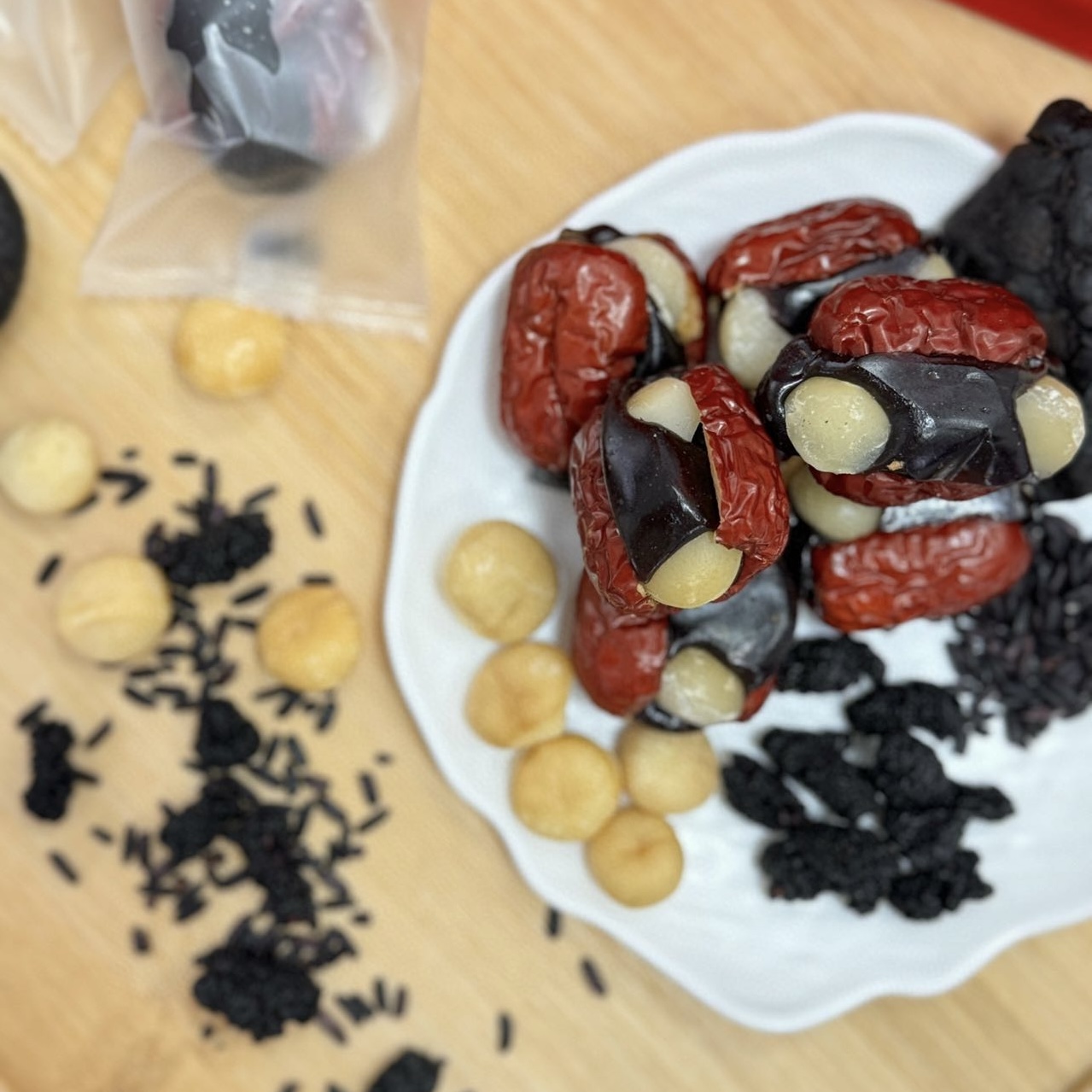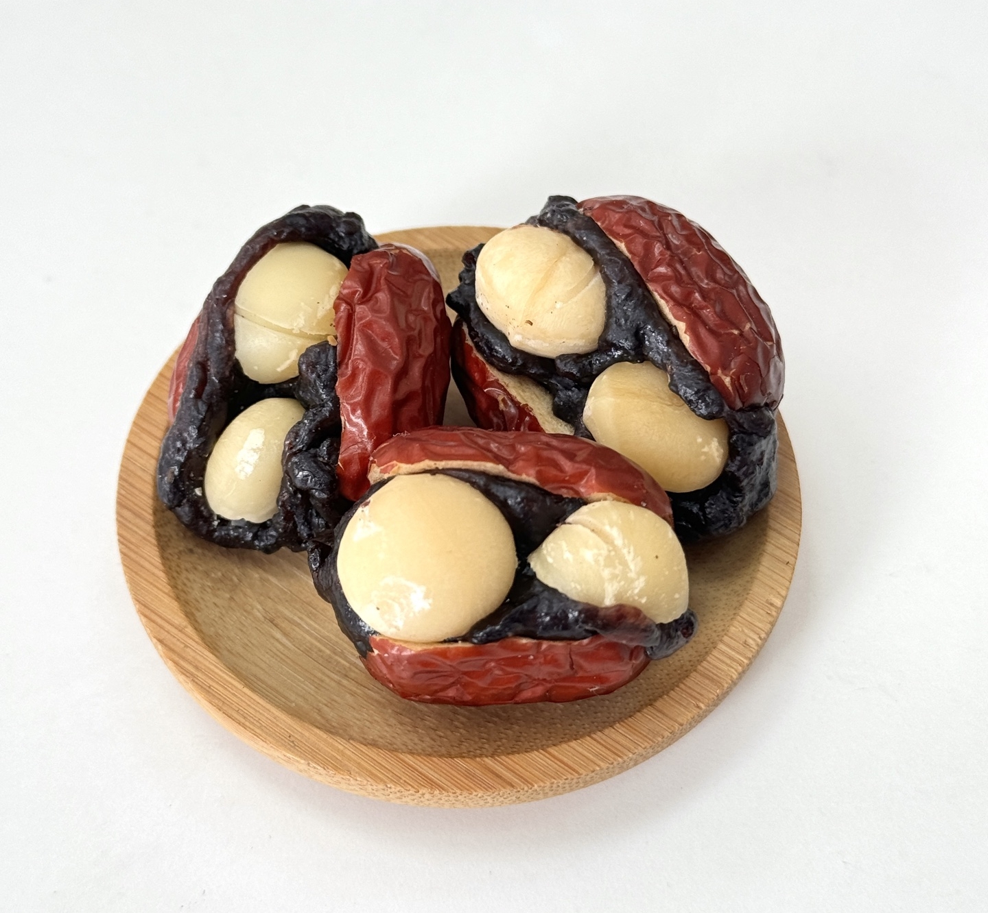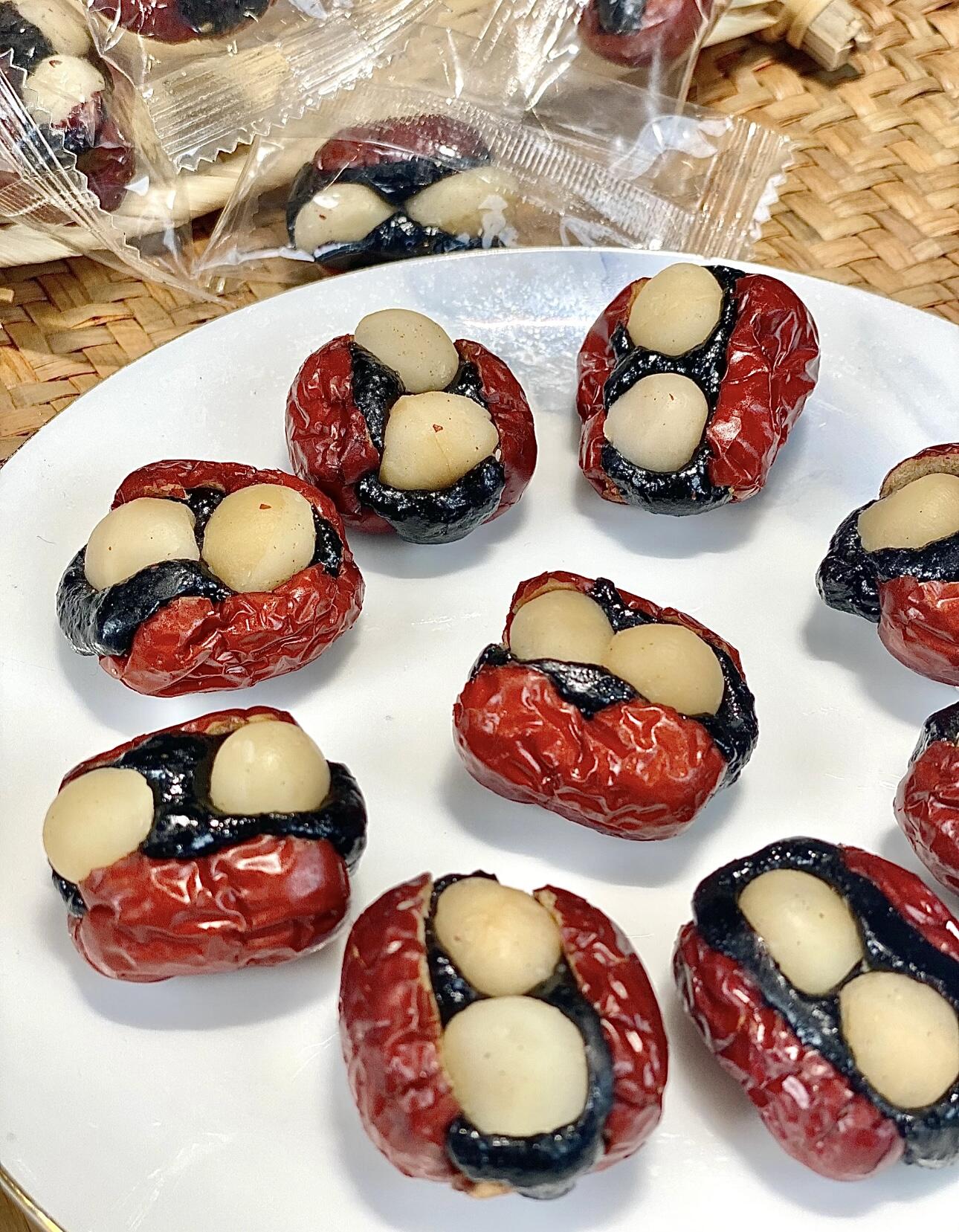 【配料表】若羌红枣、血糯米馅、夏威夷果、黄精、桑葚
