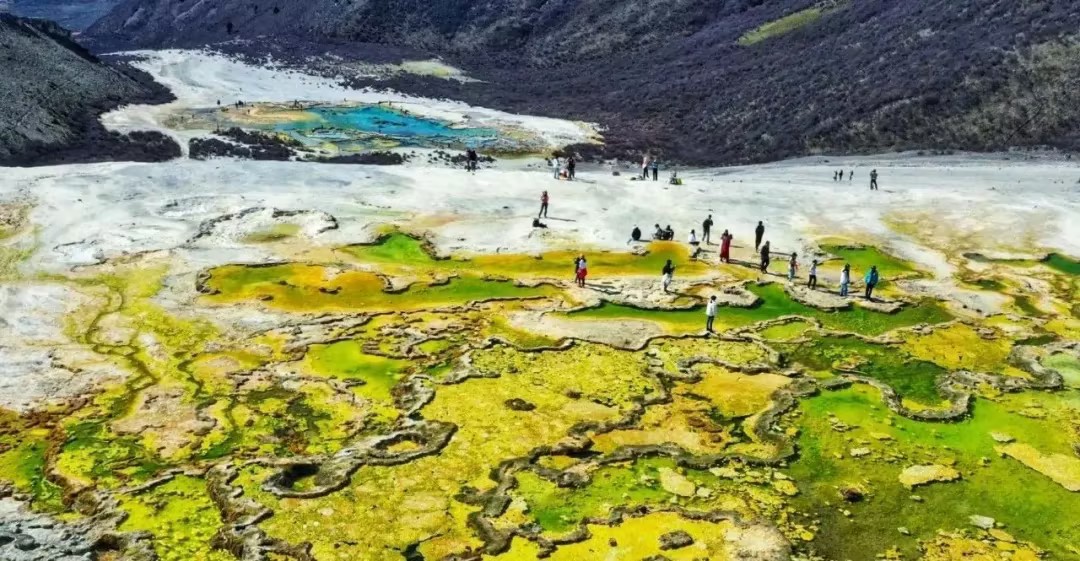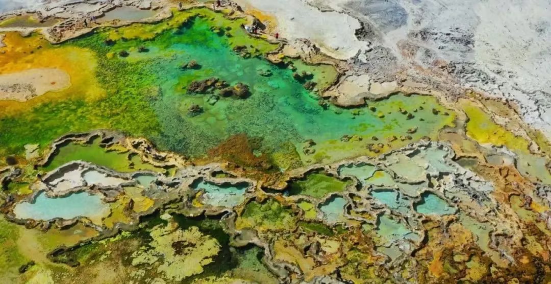 【泉华滩】一个隐藏在群山之间得自然奇观,以其独特的泉华地貌而闻名。这里经过水流长时间的沉积和钙化,形成了层层叠叠、形态各异的五彩滩涂,相似大自然的调色盘,色彩斑斓,绚丽夺目。