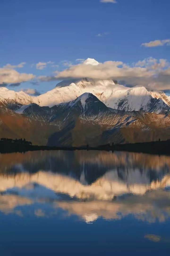 早上从酒店前往泉华滩游玩。我们下午在冷噶措骑马上山游玩,贡嘎雪山倒影拍摄。