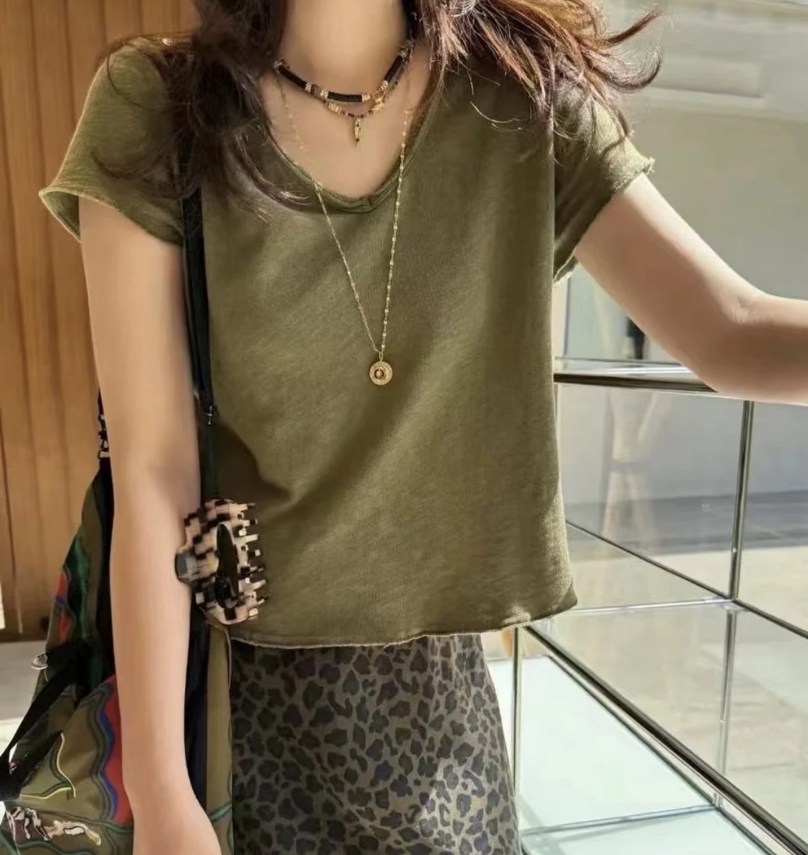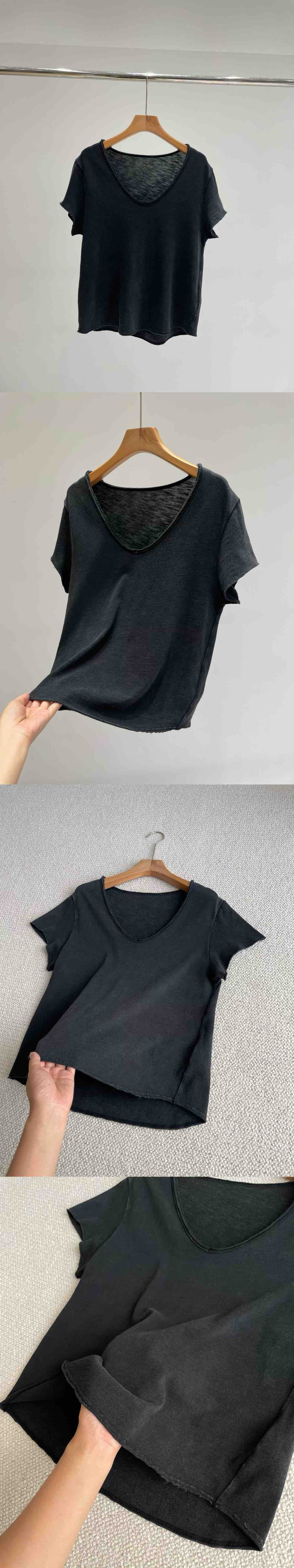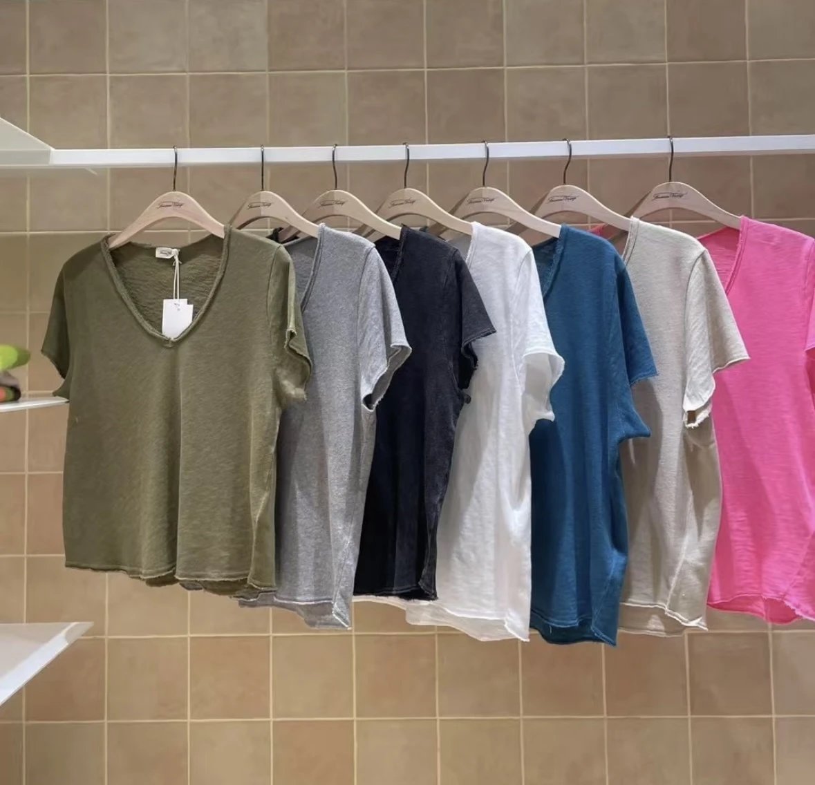 自留5色!AMV章小惠同款 竹节棉短袖T恤 小V领 老钱松弛感短袖 多巴胺TEE恤