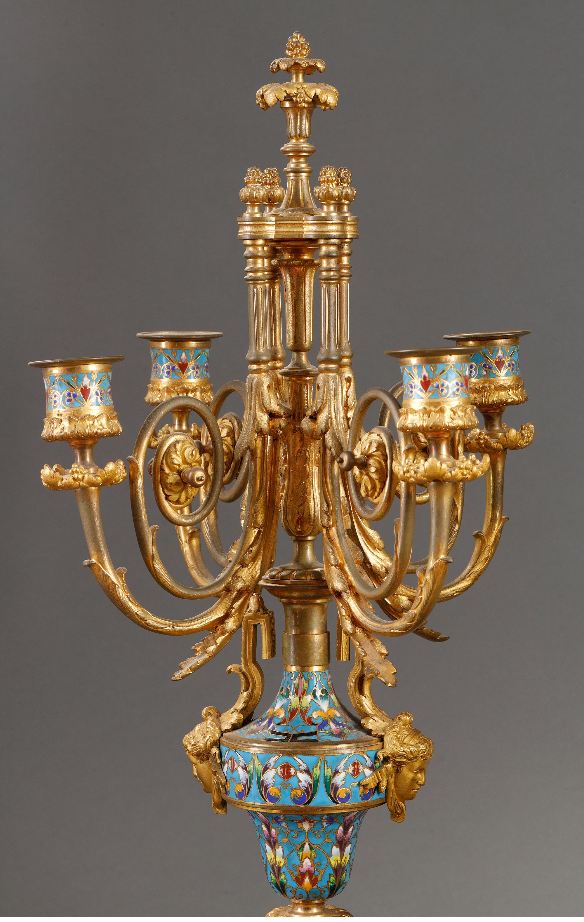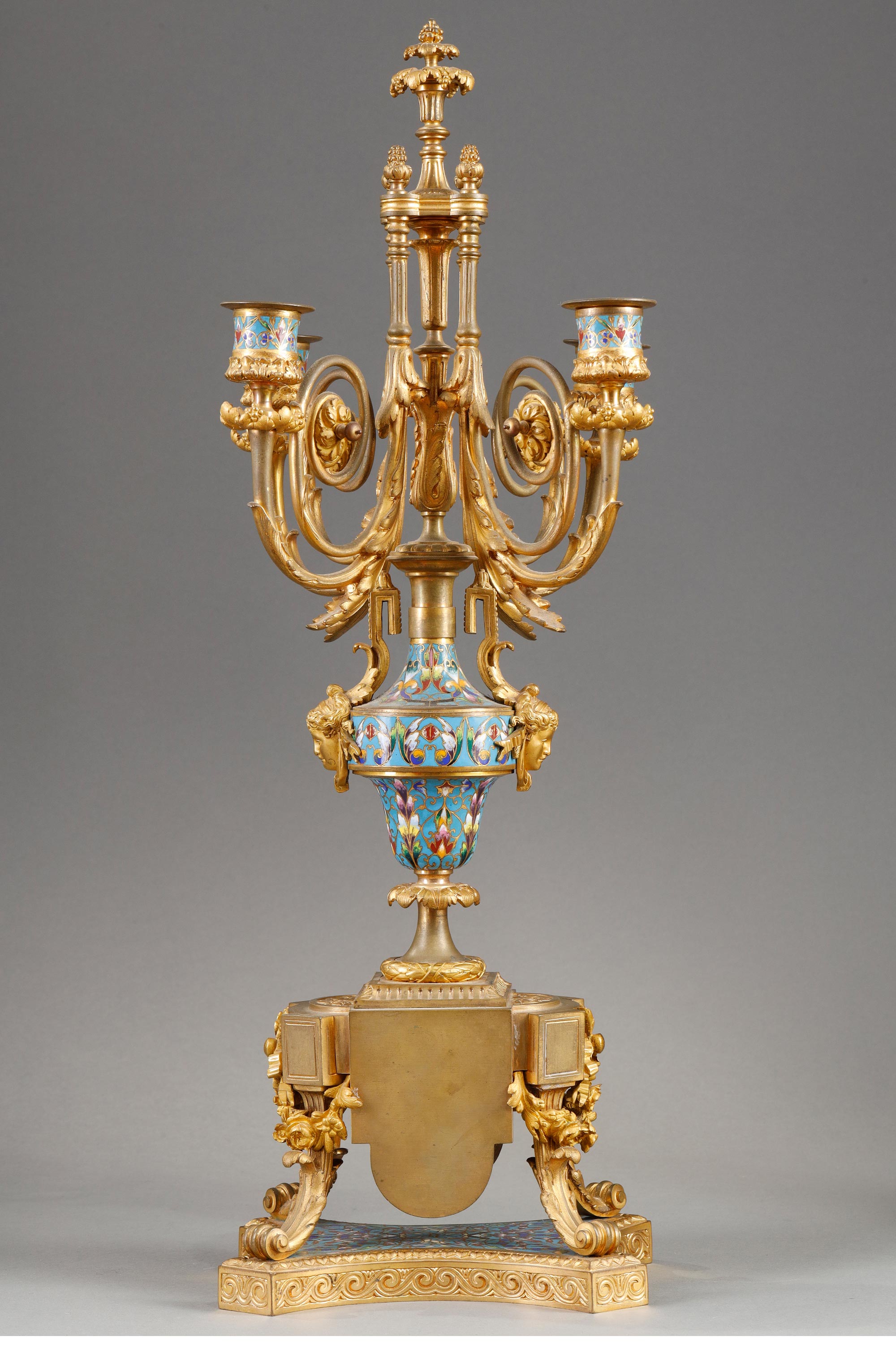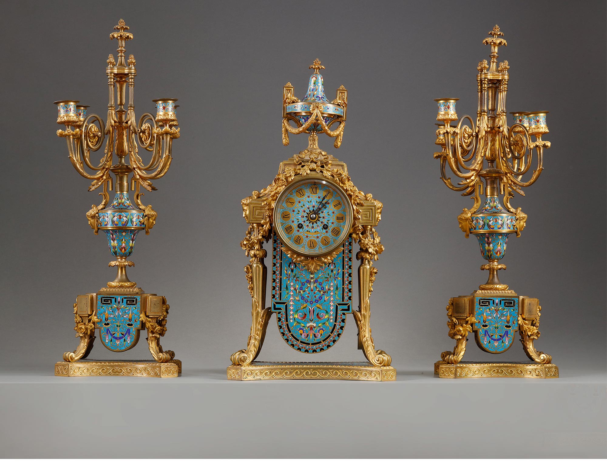 19世纪法国出品古典女神繁花主题铜鎏金精雕装饰錾胎珐琅座钟烛台三件套
