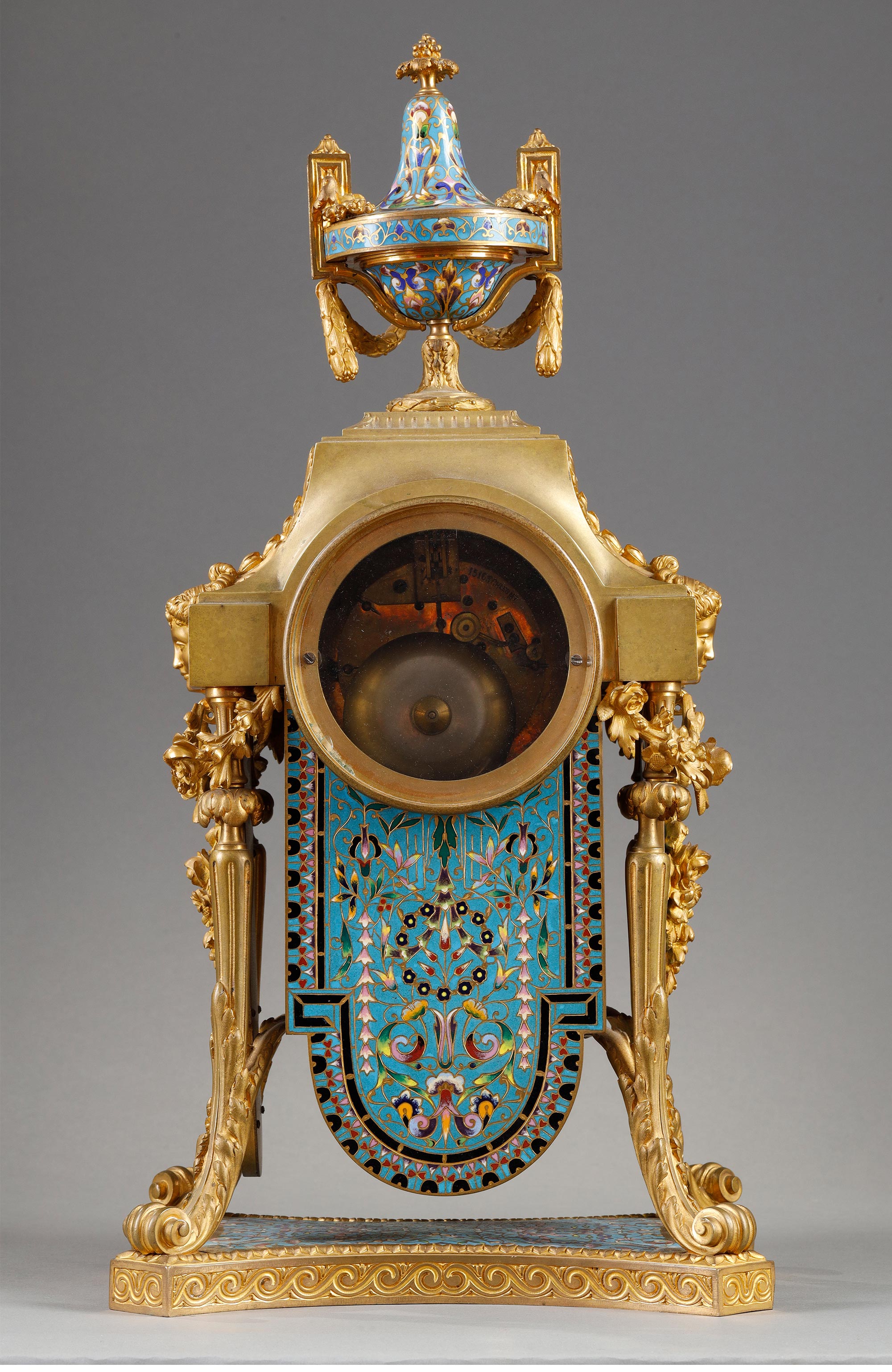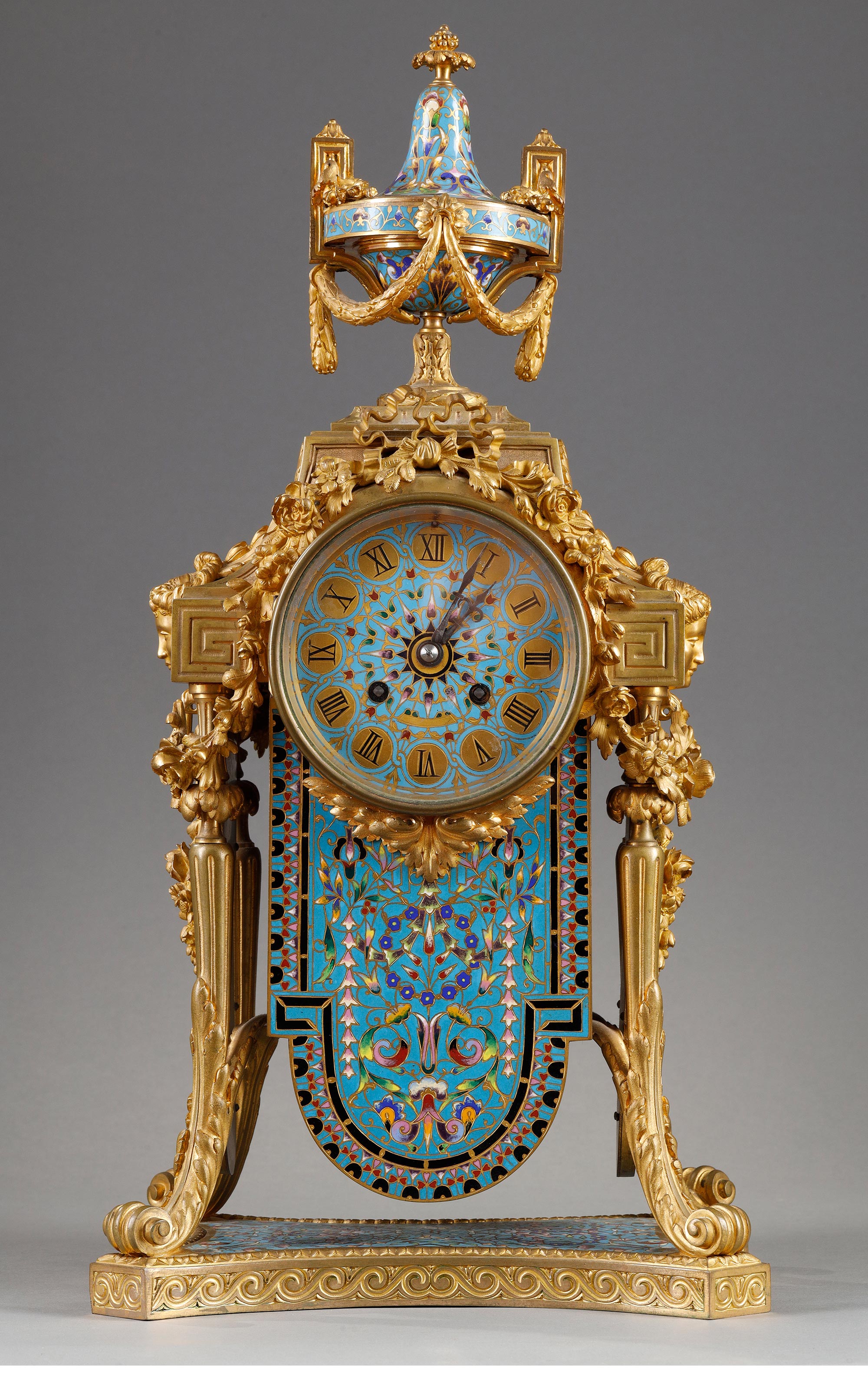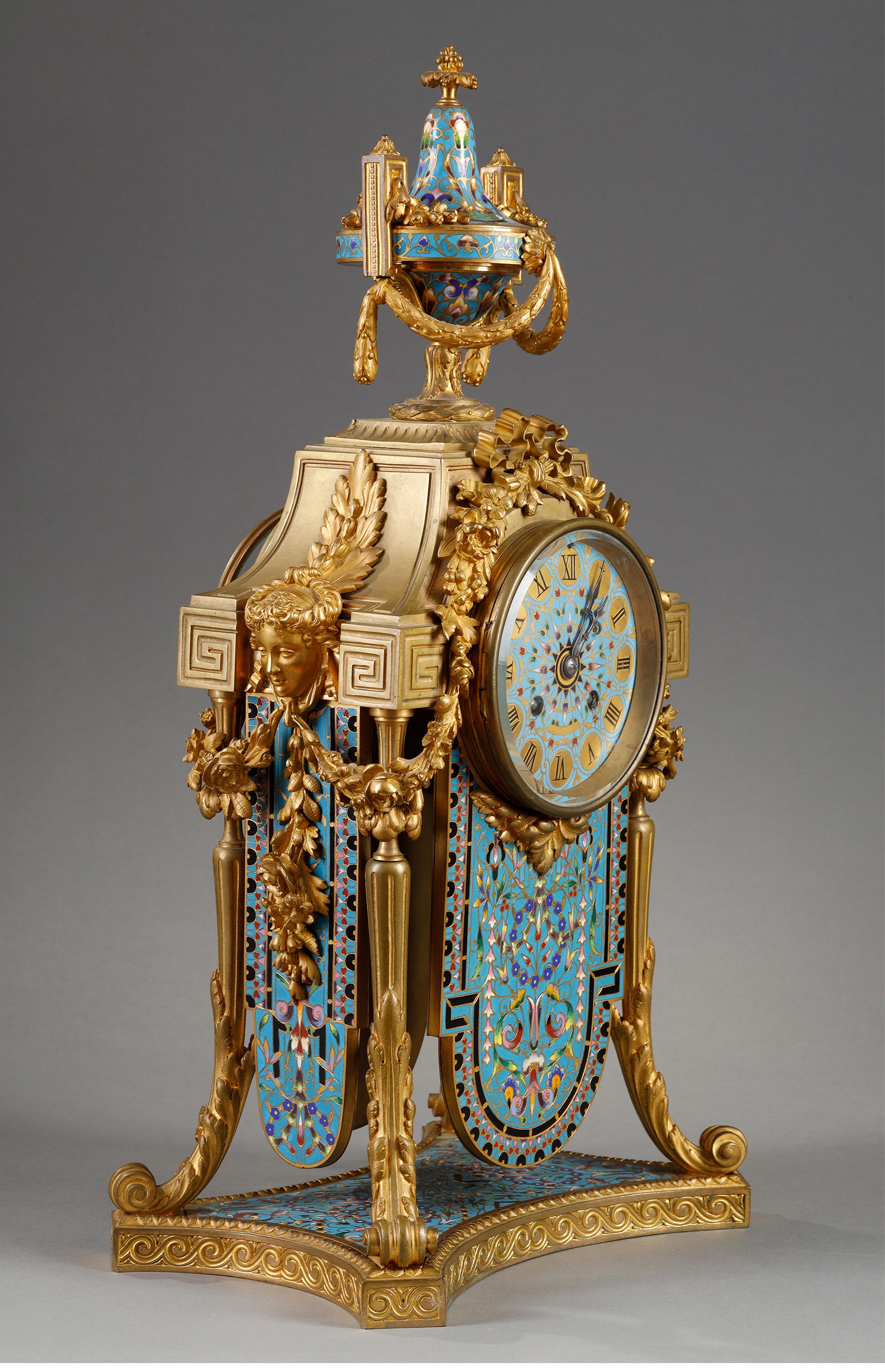 19世纪法国出品古典女神繁花主题铜鎏金精雕装饰錾胎珐琅座钟烛台三件套