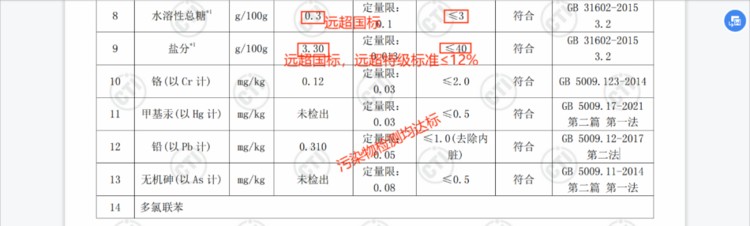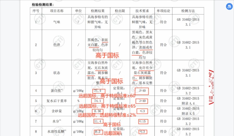 从数据可以看出,我们的淡干海参不仅达标,而且品质更要高于标准很多。