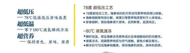 跨越千里终不负,我们的特技淡干刺参和七、五星超低压即食海参两款产品,无论从原料、工艺、品质,还是从营养、口感、价格来讲,都已经是碾压级别的存在。