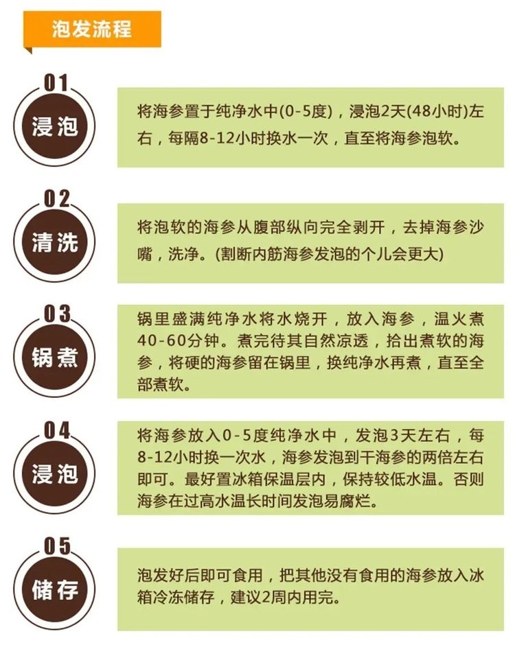 这里要注意,干海参根据加工方法不同大体还分为:淡干海参、盐干海参和糖干海参,其中糖干海参是属于国家禁止的假冒伪劣产品。而我们的海参是品质要求最高的淡干海参,制作过程中不仅不添加盐,还会有专门的脱盐工序。