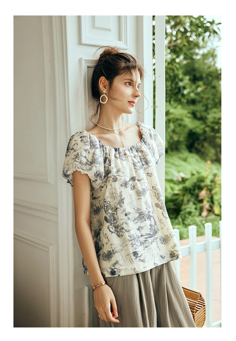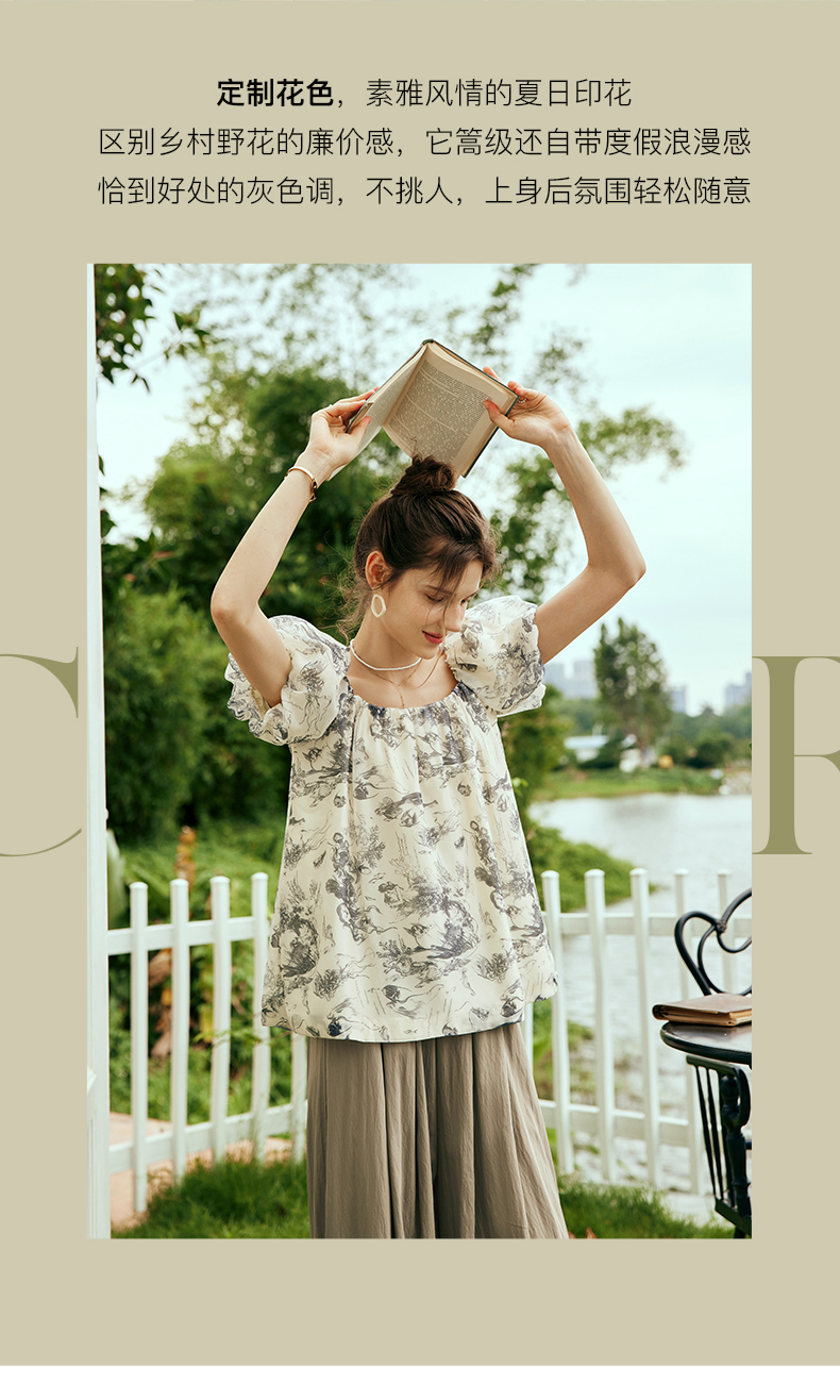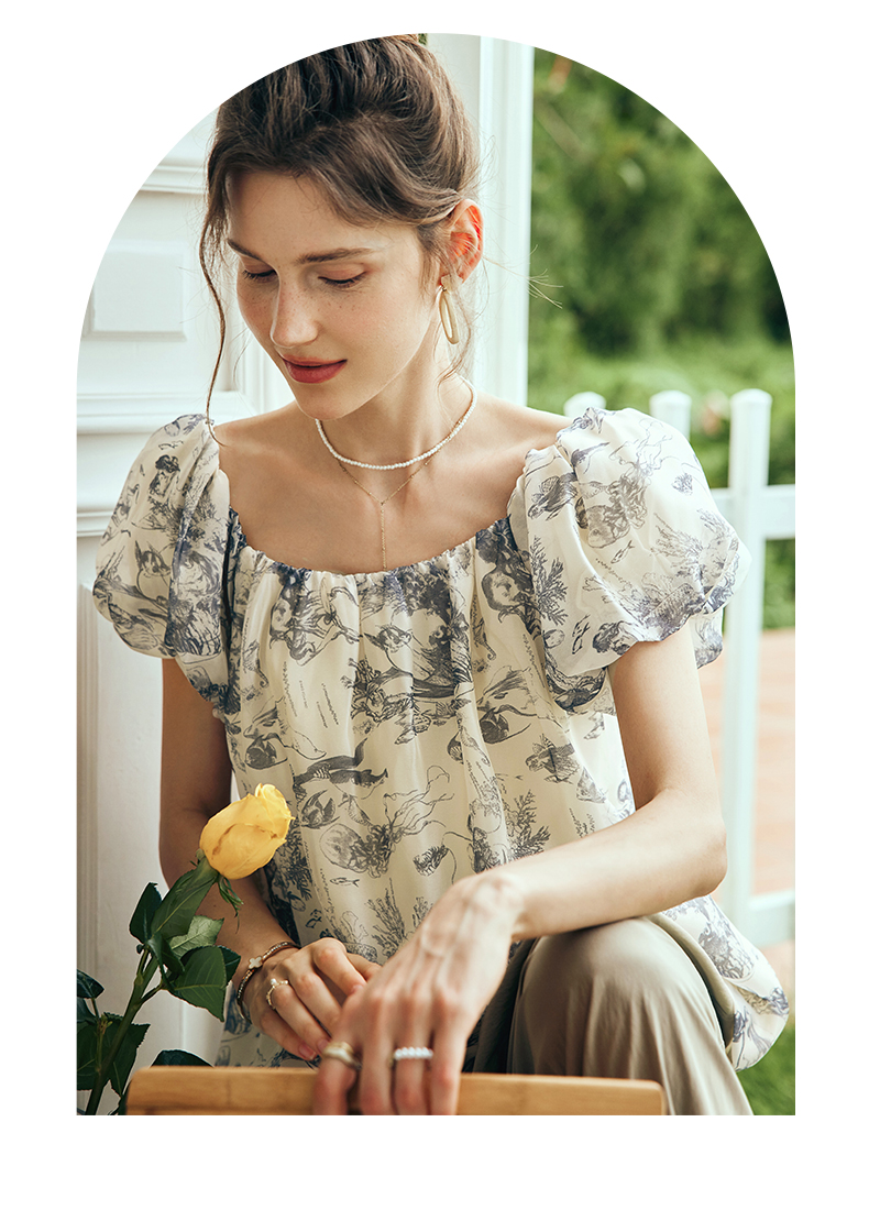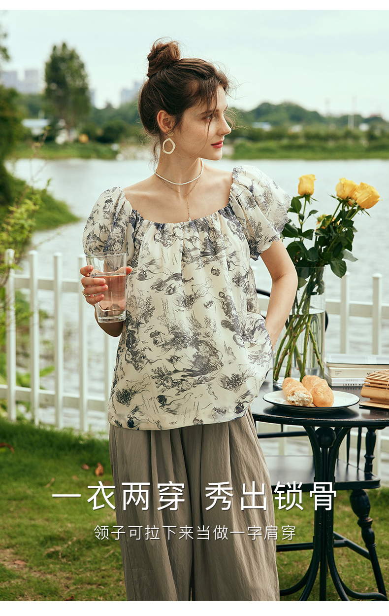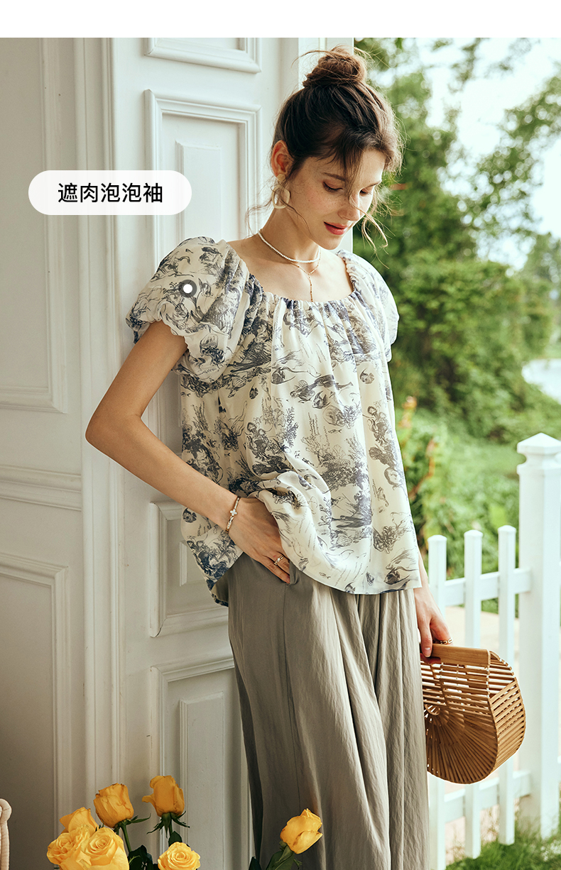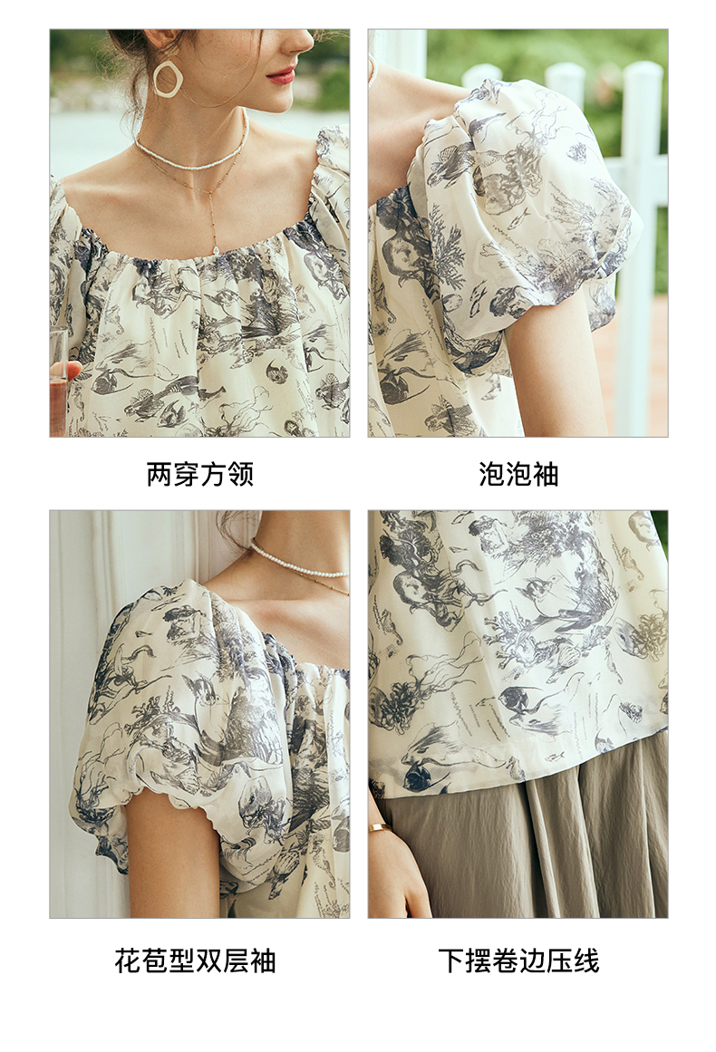 OLrain欧芮儿法式碎花方领蕾丝雪纺衫女夏季2023新款宽松度假小衫