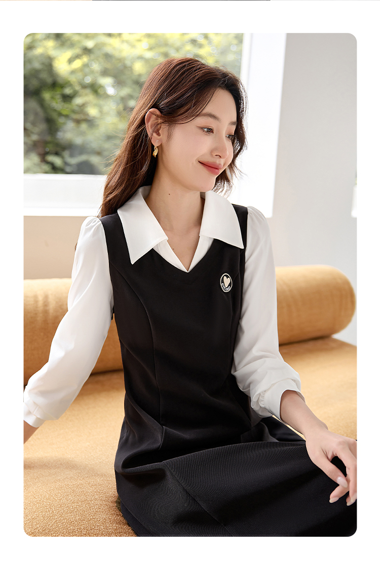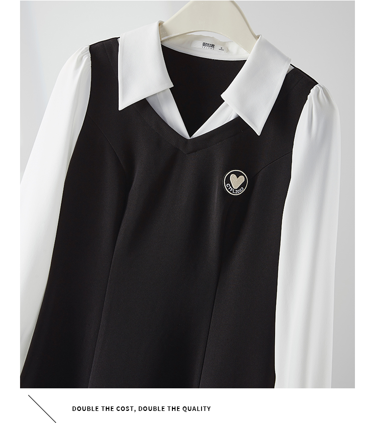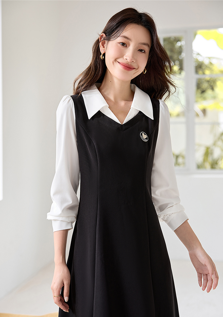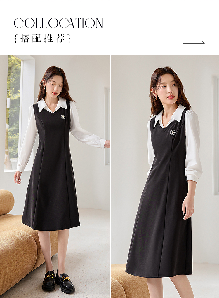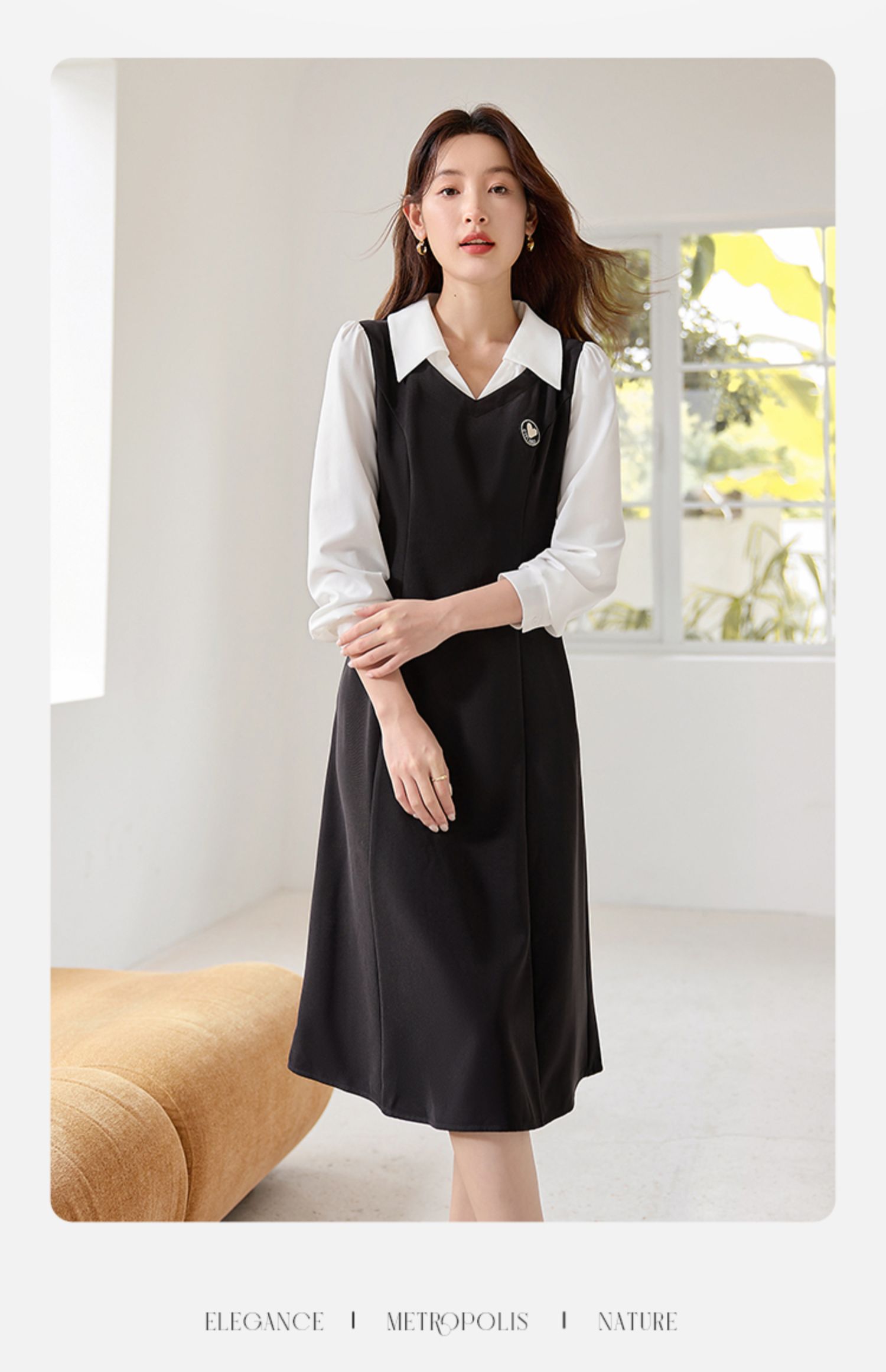 【专属特价】熙世界2025秋季新款学院风假两件连衣裙长袖通勤撞色衬衫领裙子