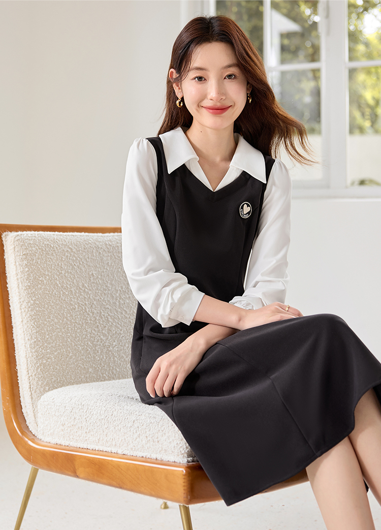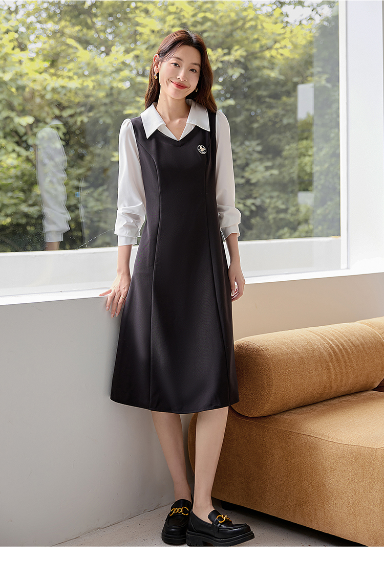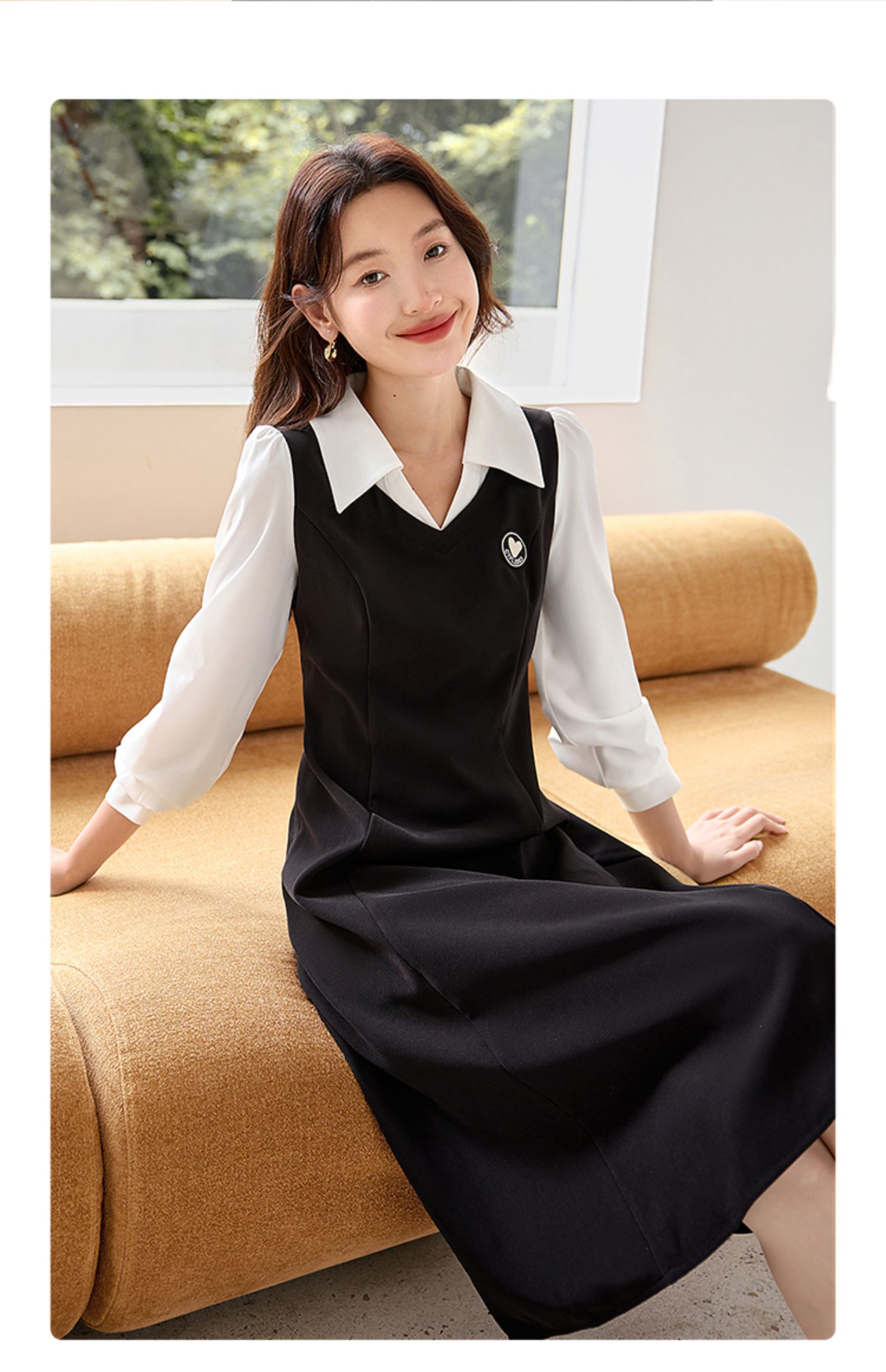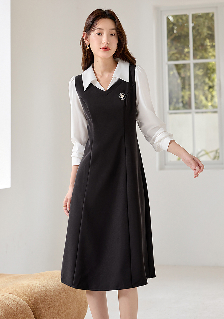 【专属特价】熙世界2025秋季新款学院风假两件连衣裙长袖通勤撞色衬衫领裙子