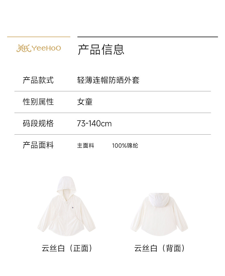 英氏儿童防晒衣女童遮阳外套夏季新款白色连帽户外服YRWVJ2S014A