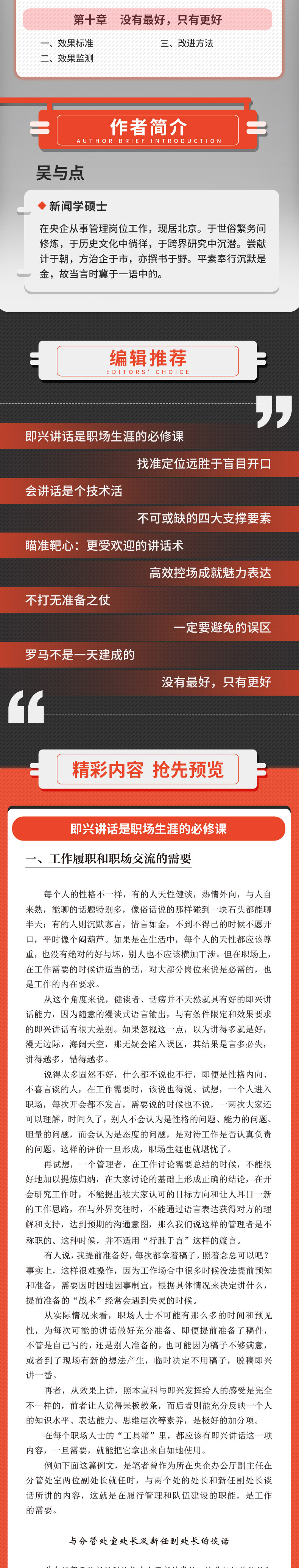《即兴讲话:造就人生高光时刻》一书针对广大读者希望提高即兴讲话能力的迫切需求,从全新的理念和思路出发,对当下中国语境中尤其是职场环境下的即兴讲话进行深度认知和全面审视,对其加以理论剖析、结构分析和方法指引。在阐述即兴讲话能力重要性、准确把握其定位特点的基础上,梳理总结即兴讲话的原则、方法、技巧与核心要素,并从做好准备、把握重点、增强控场能力、规避误区等方面加以讲述,同时指出能力进阶的长效路径以及效果评估与改进方法。在理论与方法讲解之中,穿插使用作者的大量即兴讲话案例,进一步加深读者理解,给予实际指导和借鉴。这是一本集理论探讨、方法解析与案例精粹于一体的书,也是一本兼具创新性、可读性、实用性的书,主要读者对象是对即兴讲话能力提升有需求的社会各界人士。