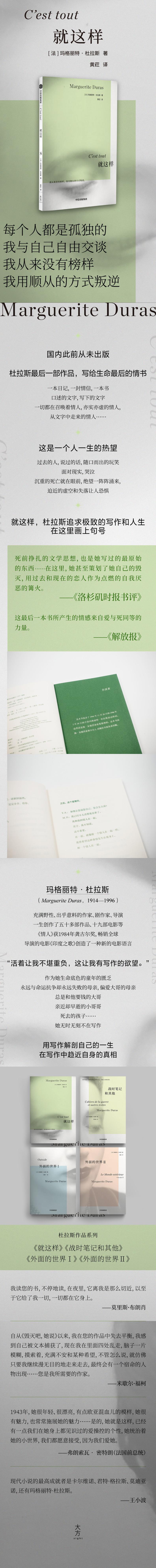 这本书收入从1994年11月20日到1996年2月29日(杜拉斯逝世于1996年3月3日)杜拉斯重病卧床期间口述或写下的文字,由她最后的伴侣扬·安德烈亚收集整理而成。一本日记,一封情信,一本书。口述的文字,写下的文字,一切都在召唤着情人,亦实亦虚的情人,从文字中走来的情人,与她相伴的情人,注定要离开她的情人。这是一个人一生的热望。过去的人,说过的话,随口而出的玩笑,面对现实,哭泣。沉重的死亡就在眼前,绝望一阵阵涌来,迫近的虚空和失落让人恐惧。就这样,杜拉斯追求很好的写作和人生在这里画上句号。
