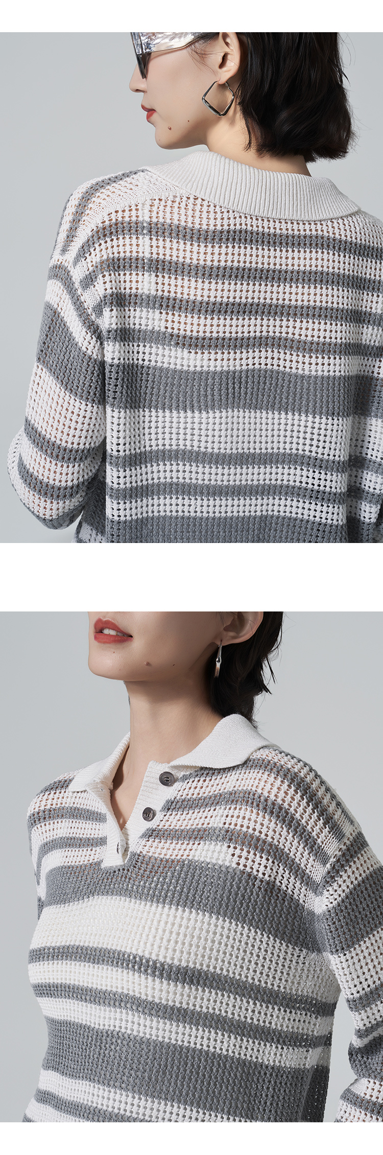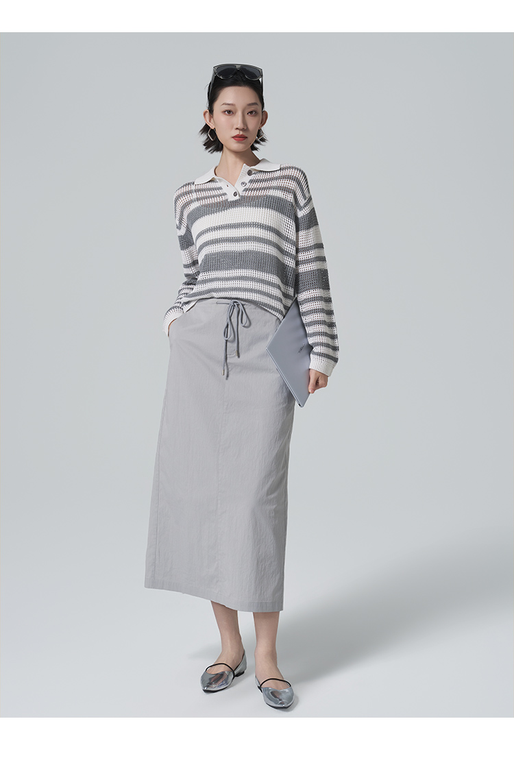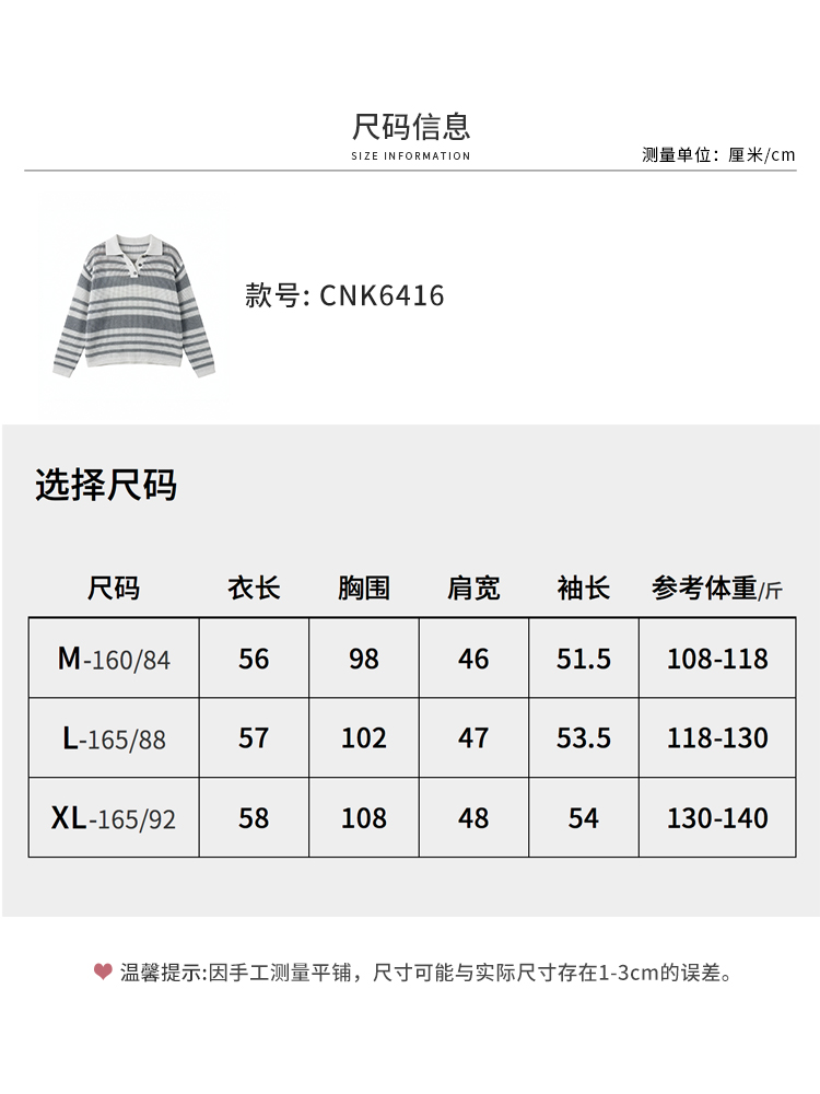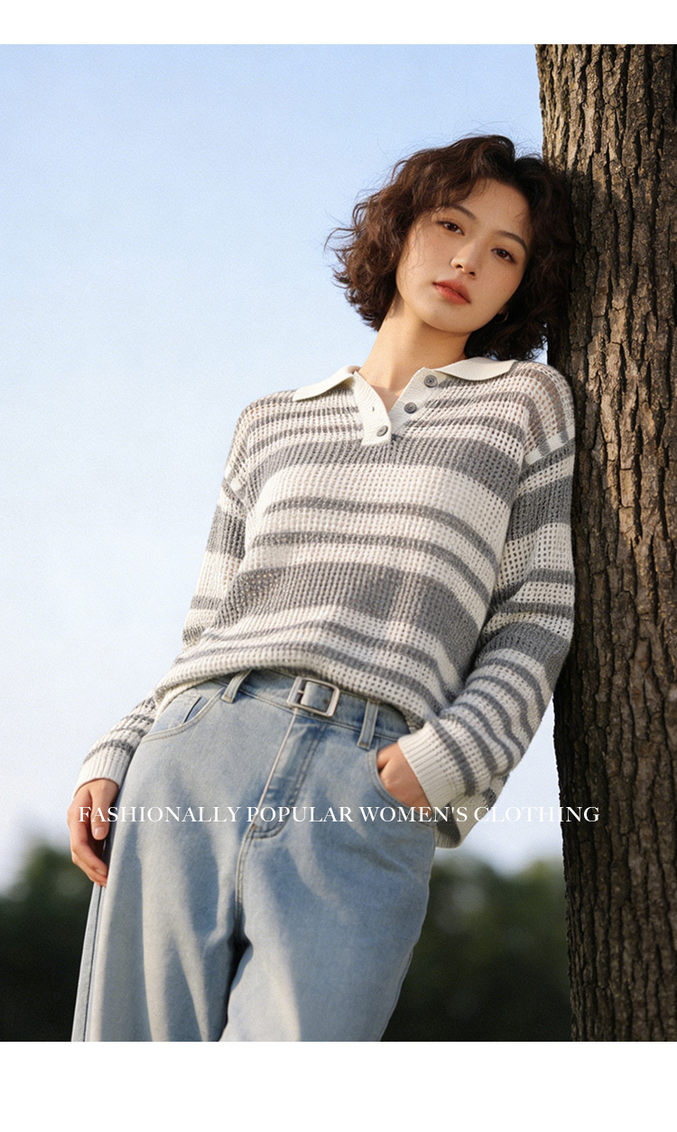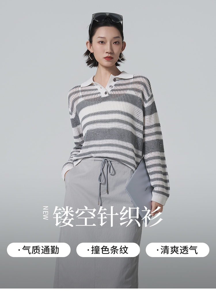 【商场同款】CNK6416 “ 条纹镂空衫 ”轻亚麻混纺 干爽舒适 宽松版型舒适自在POLO领毛衫