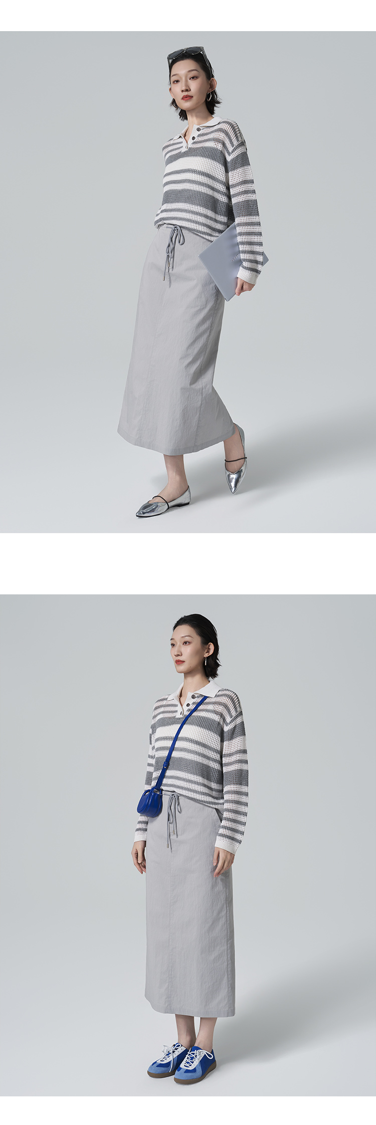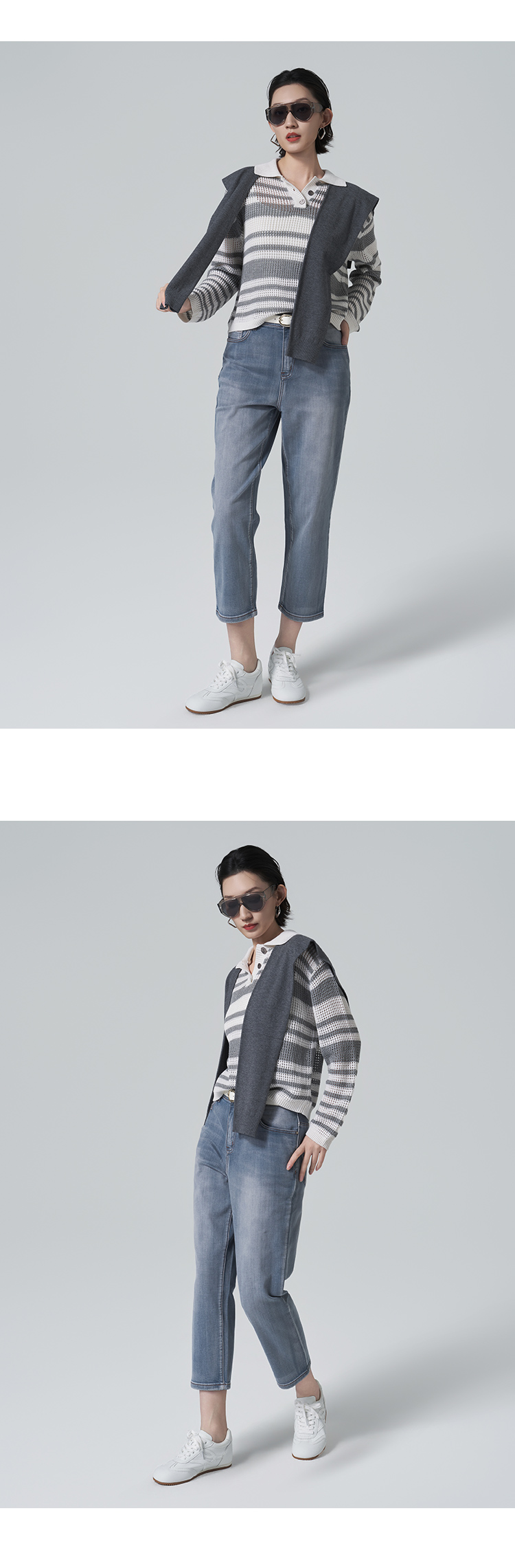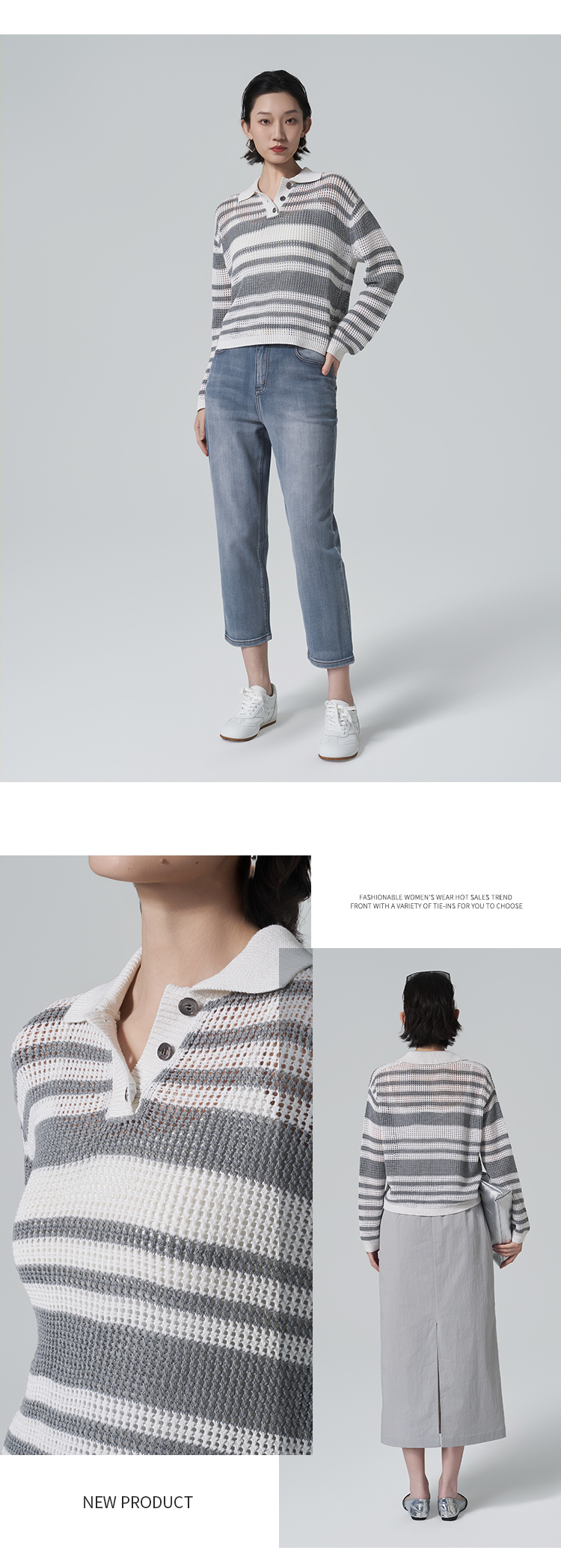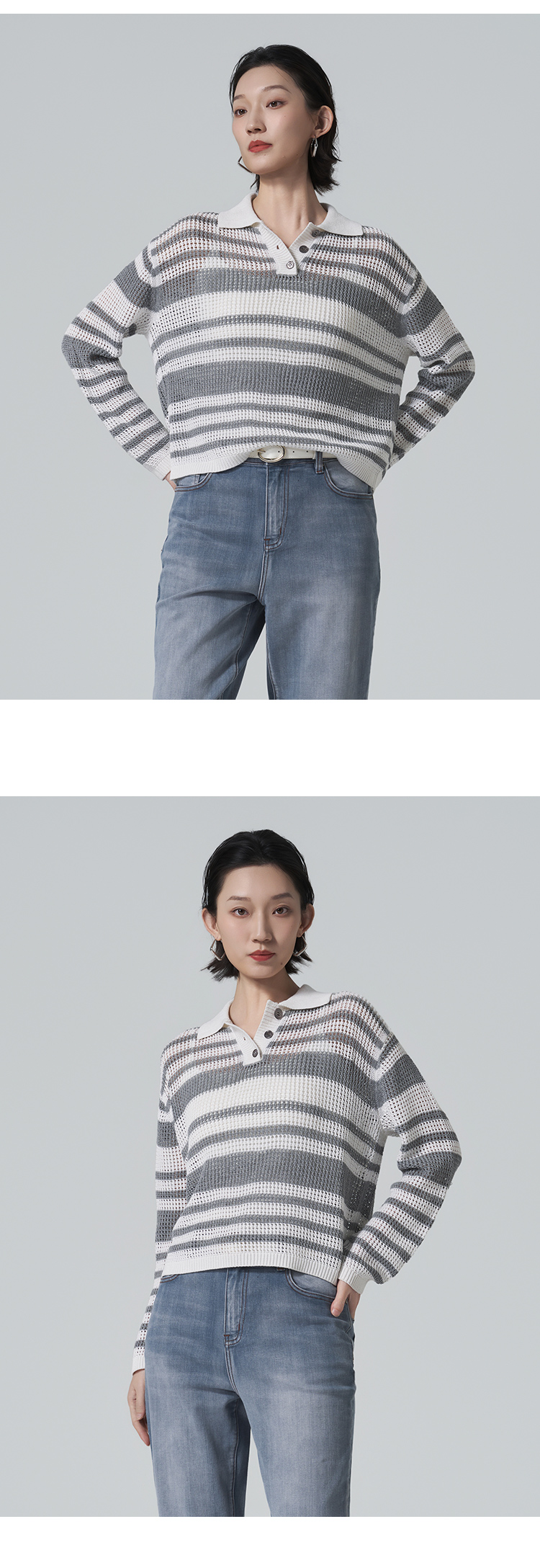 【商场同款】CNK6416 “ 条纹镂空衫 ”轻亚麻混纺 干爽舒适 宽松版型舒适自在POLO领毛衫