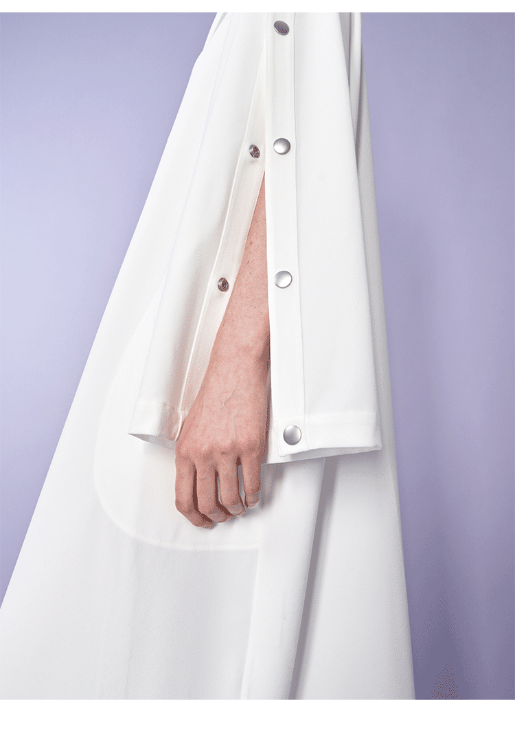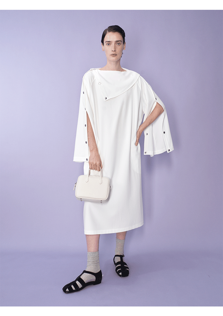 HIDEMI 极简设计感不对称撞钉扣多穿式白色垂顺感连衣裙