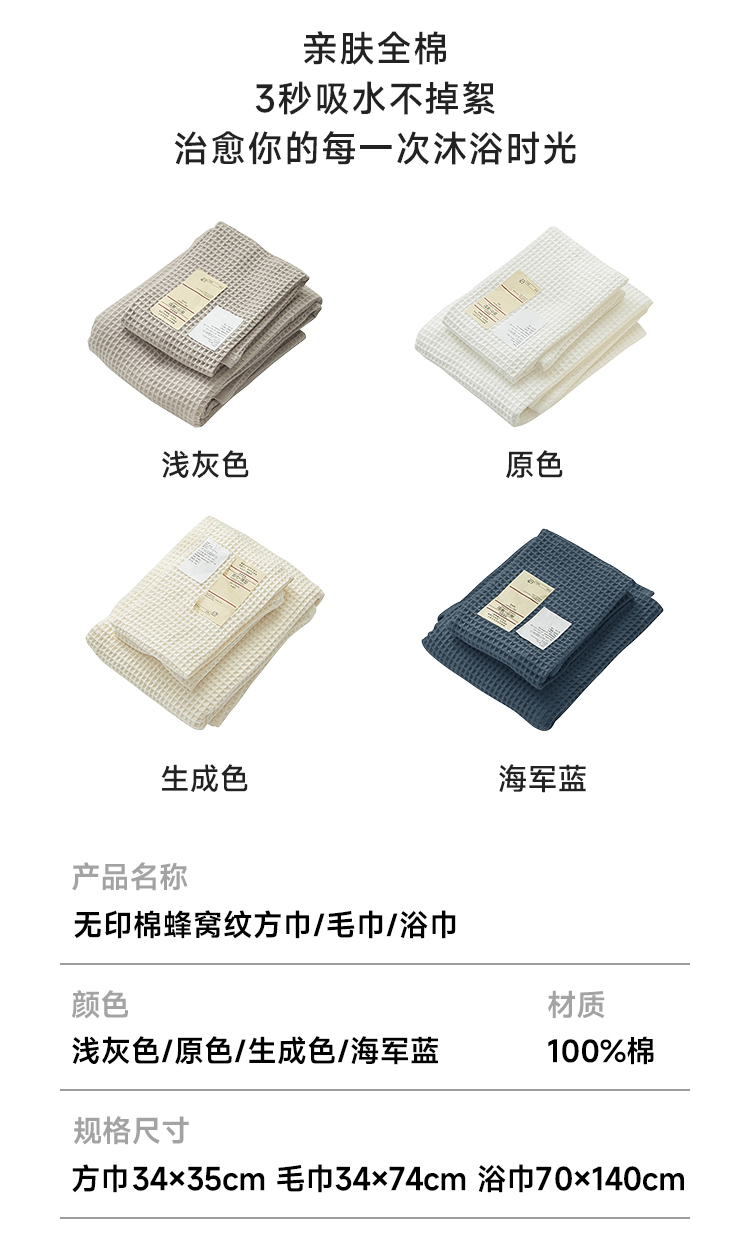 愉悦之家 无印棉蜂窝纹毛浴巾 | 百分百长绒棉,双面立体蜂窝纹加暗藏隐格四色可选;蓬松柔软敏感肌可用,柔软触感秒吸干很耐用,越用越柔软