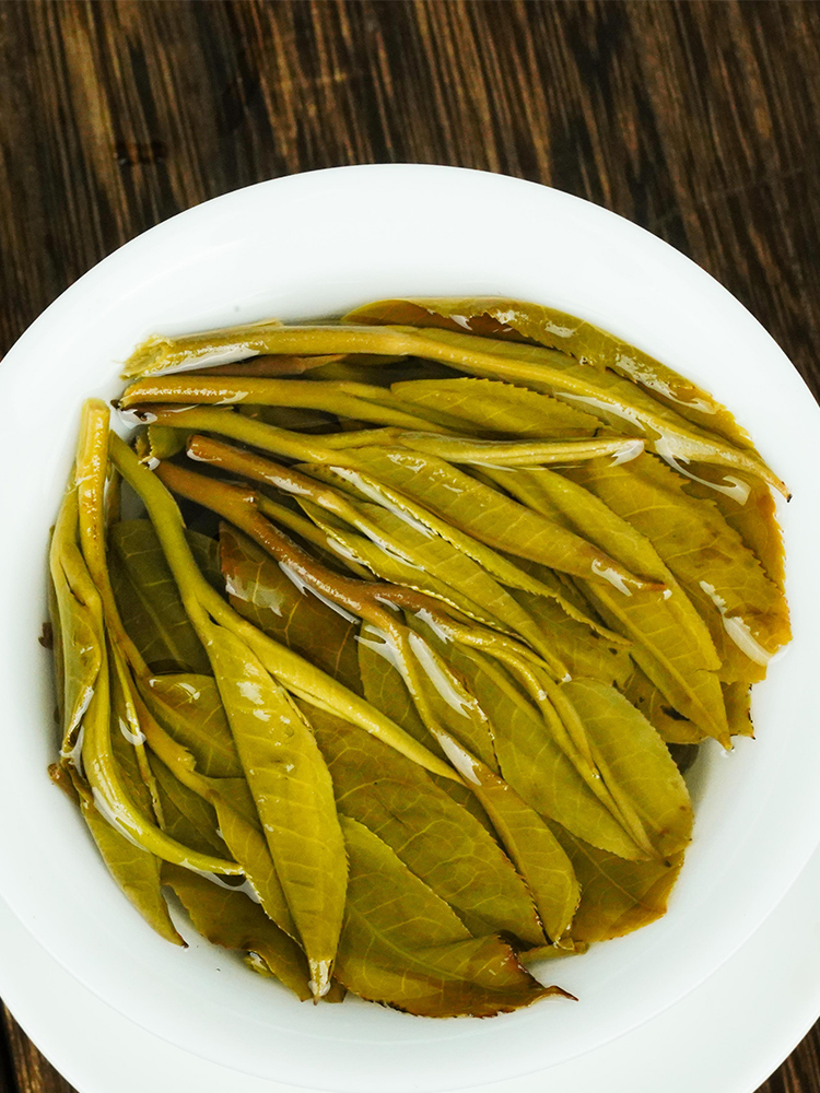 叶底植物清香,水煮呛毛豆香浓郁清甜。揉捻略紧,部分叶张未舒展,偶有红梗红叶��